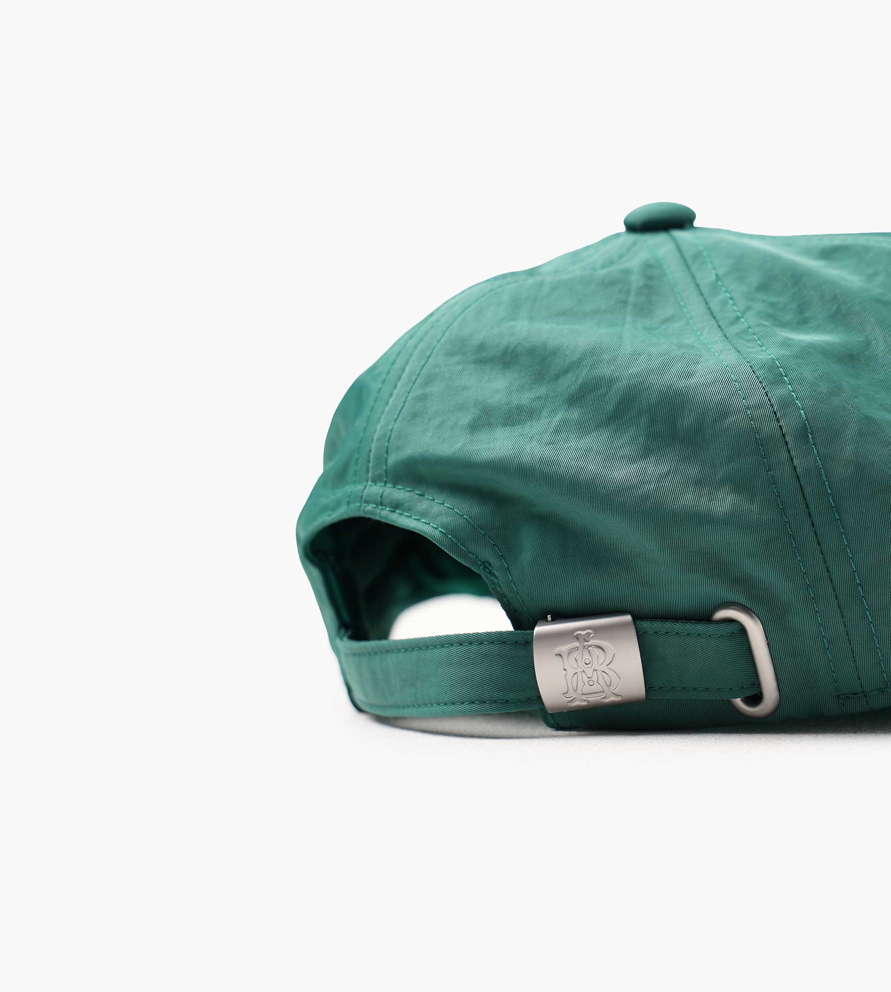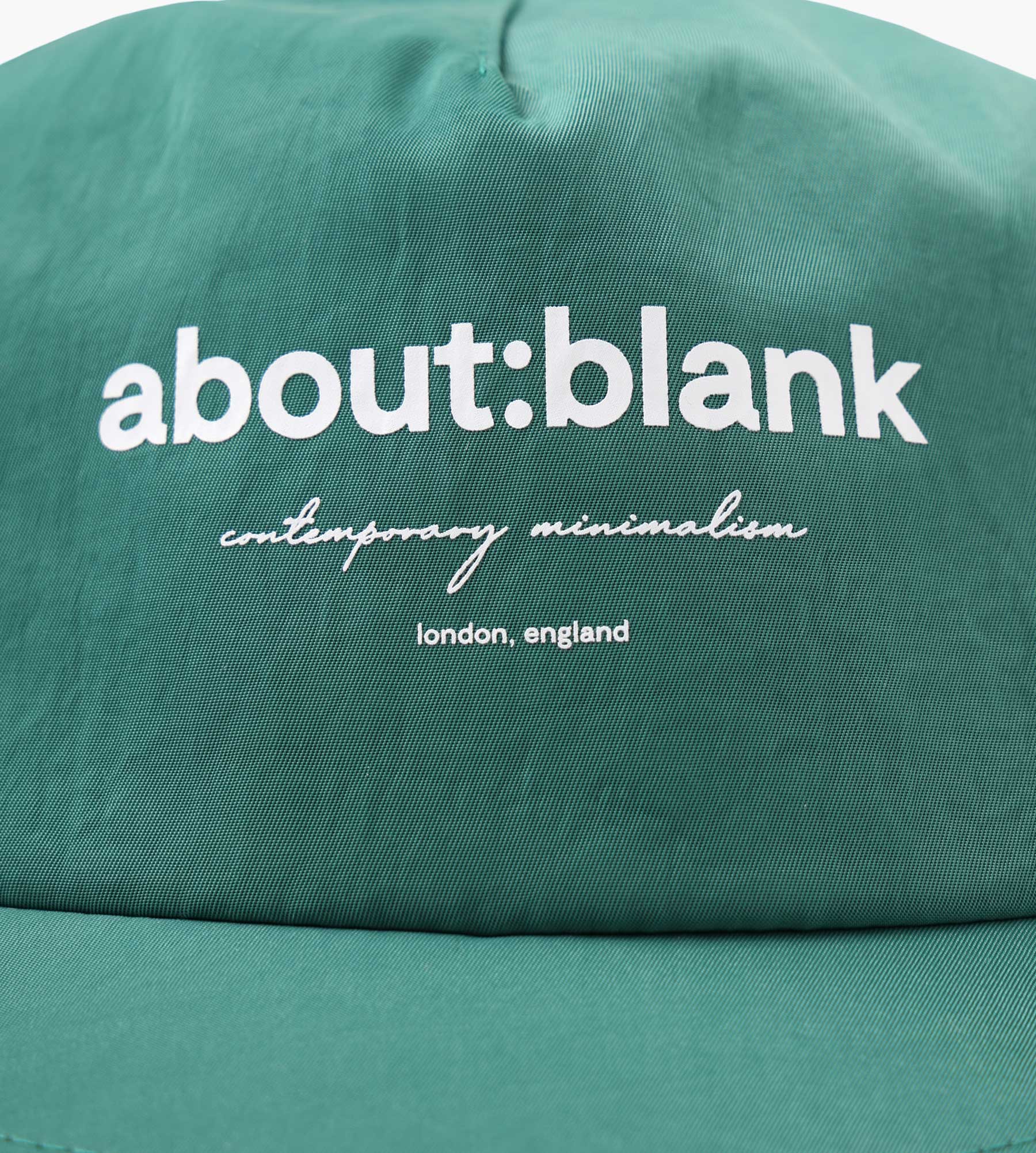 The about:blank Box Logo Cap in Epsom Green & Ecru is crafted from 100% lightweight technical nylon, offering a breathable yet structured build. Designed with a clean aesthetic, the 5-panel construction ensures durability and shape retention, while the wide visor provides ample coverage and sharp lines.