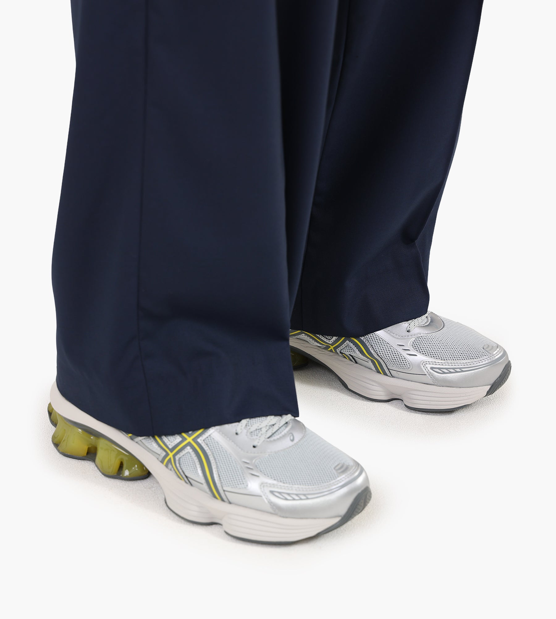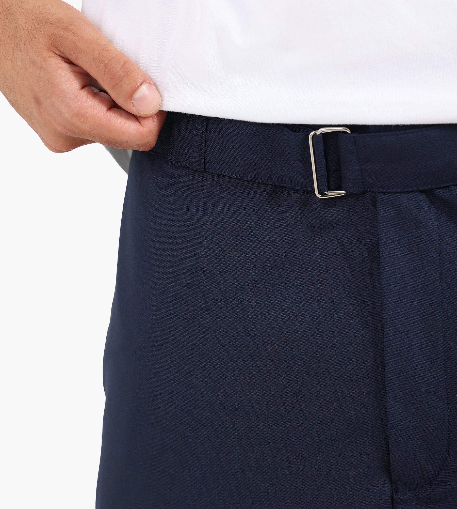Constructed from a structured midweight wool blend suiting, the about:blank Relaxed Belted Trouser in Navy offers a refined yet adaptable foundation for any wardrobe. The relaxed fit, wide leg, and slightly cropped silhouette create effortless movement, while the removable self-fabric belt with a silver D-ring buckle adds a touch of functional detail. Clean on-seam pockets and jet back pockets with tonal branding embroidery maintain a streamlined profile.