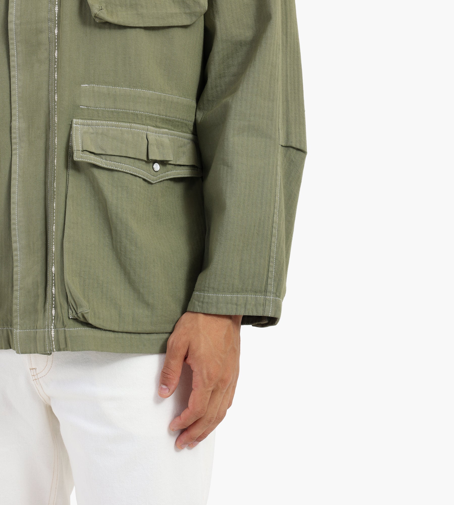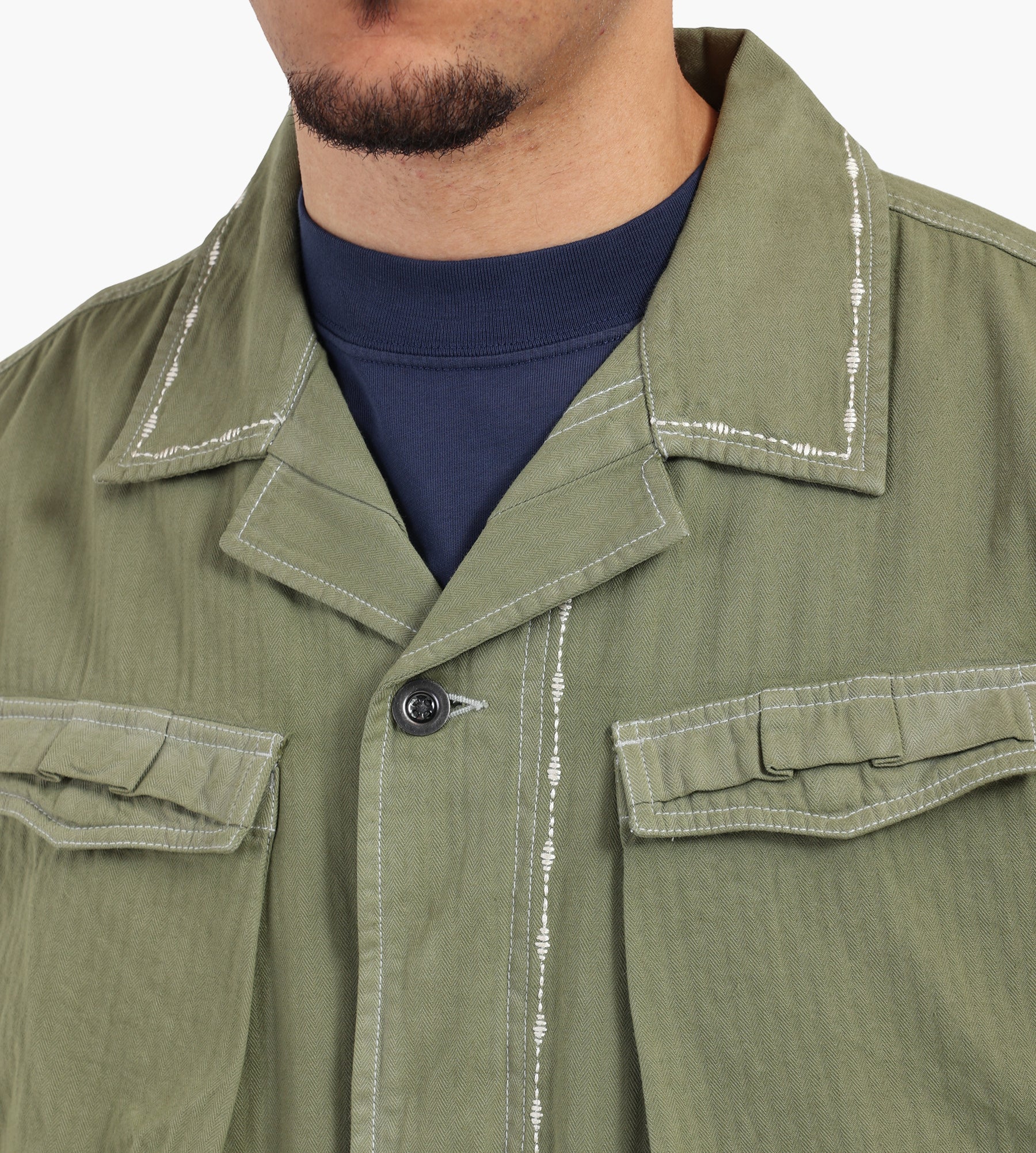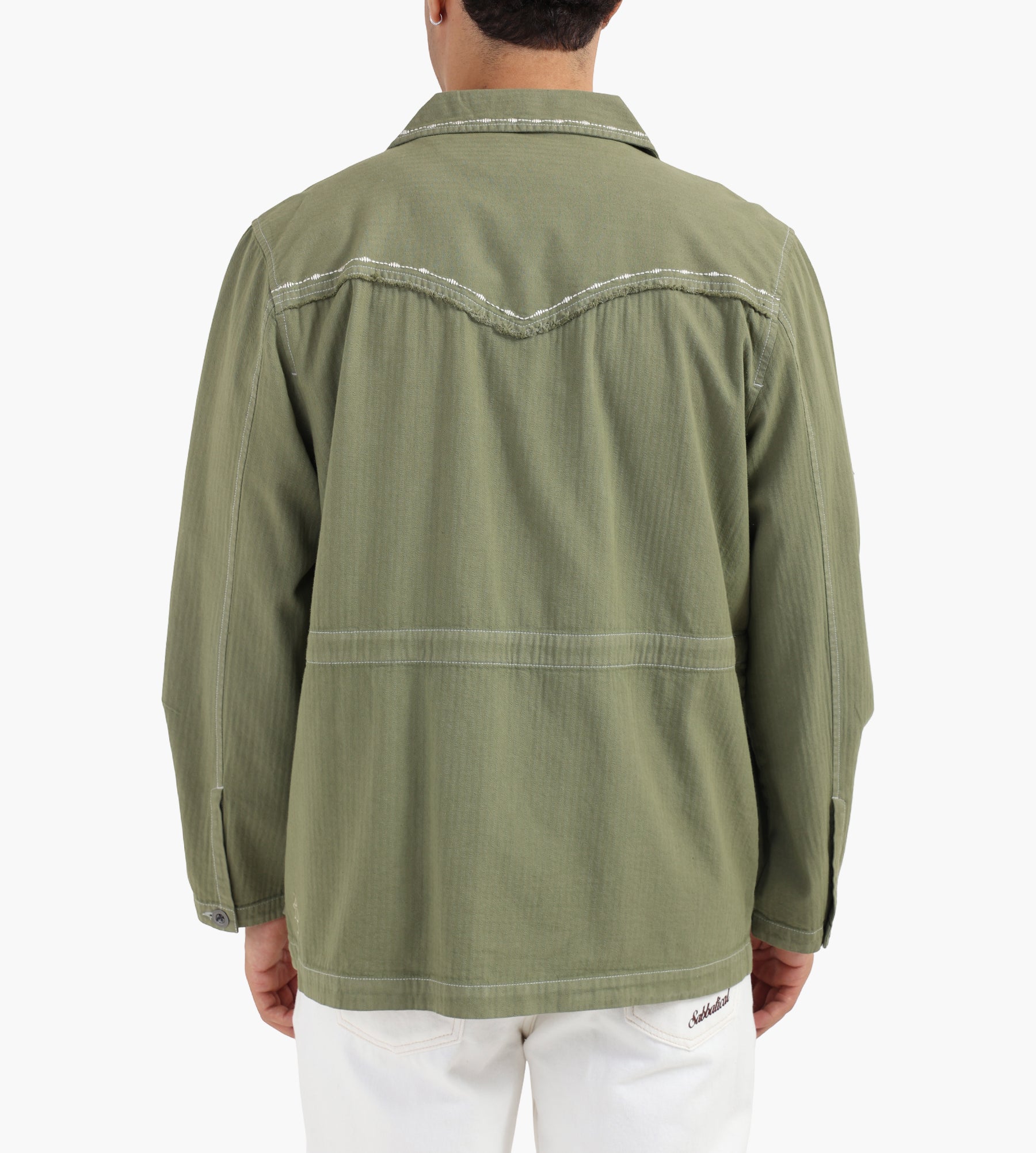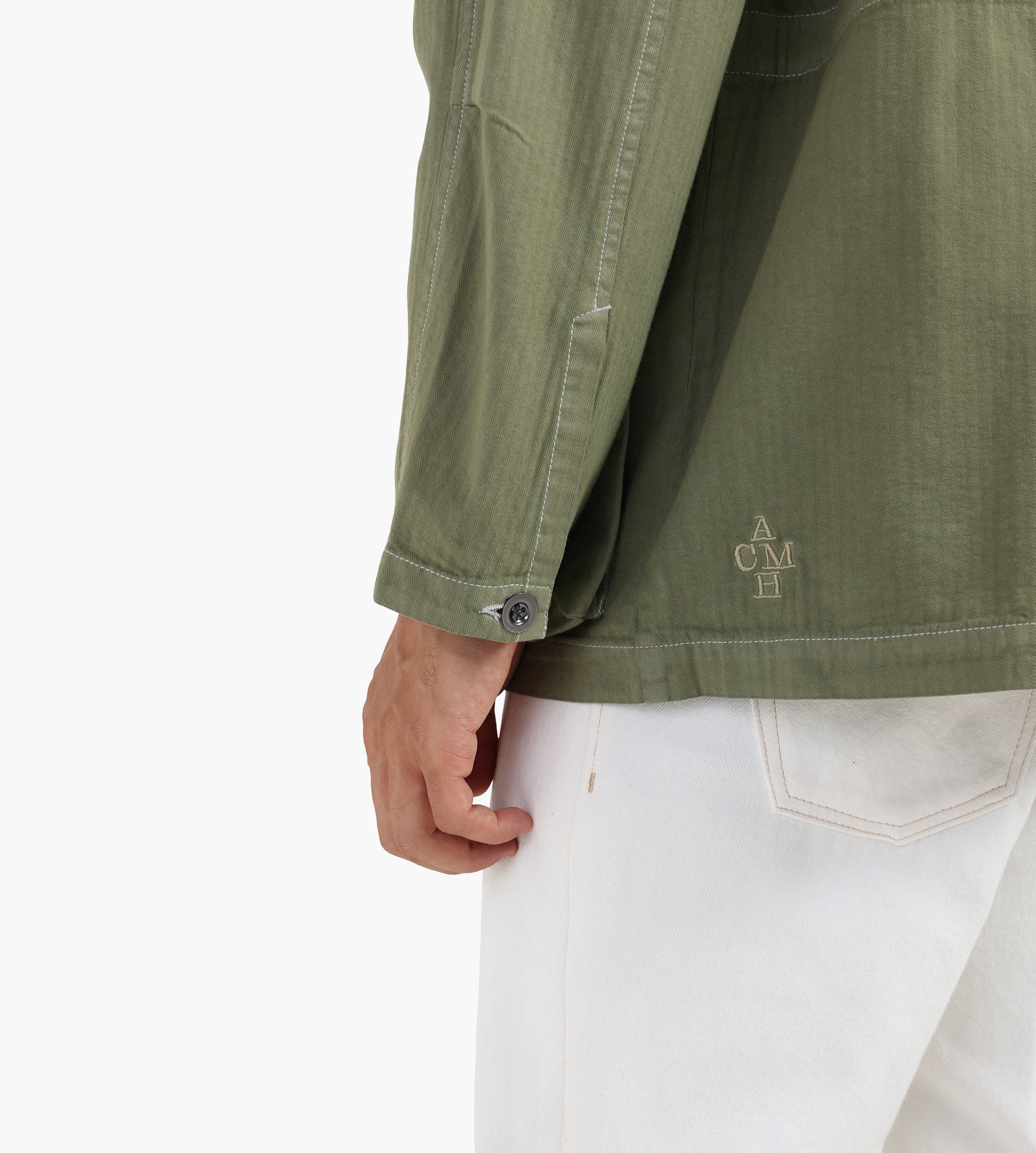 The ACMH by Magic Castles Richmond Field Jacket in Khaki is crafted from 100% cotton with a washed herringbone texture, offering a durable yet breathable layer. Overdyed for a rich, uneven color depth, the jacket balances rugged utility with refined details, including custom rice stitch accents and frayed seam edges.