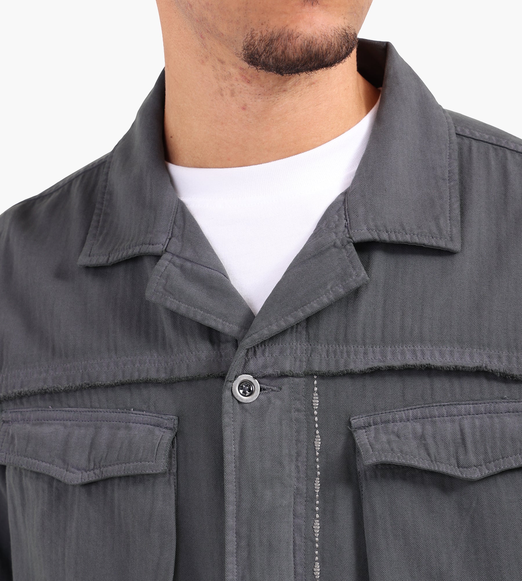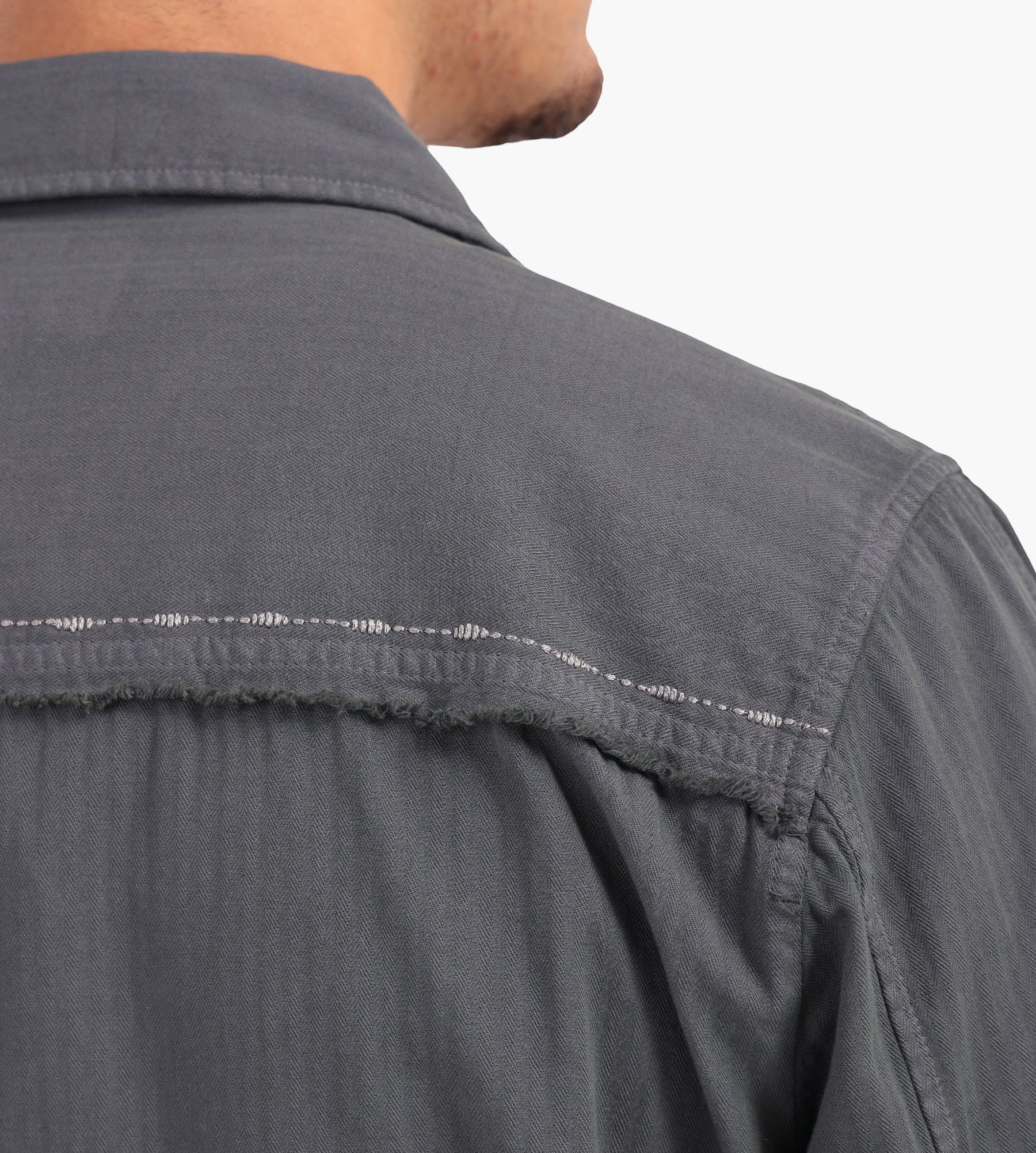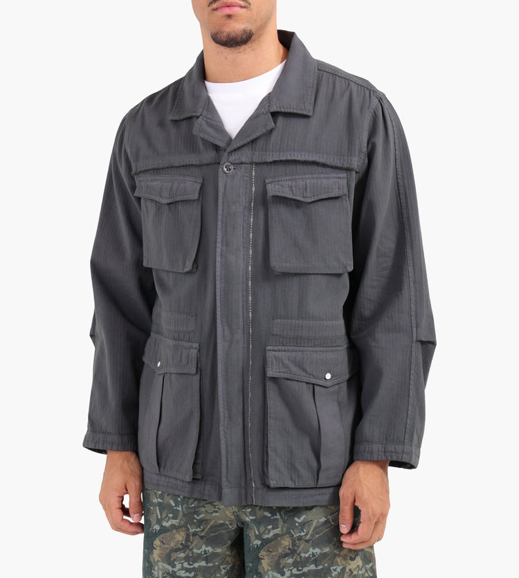 The ACMH by Magic Castles Richmond Field Jacket in Khaki is crafted from 100% washed herringbone cotton, offering a soft yet durable layer with a distinctive texture. The garment-dyeing process lends the piece its unique, uneven color, while frayed seam details and custom rice stitch accents elevate its utilitarian aesthetic.