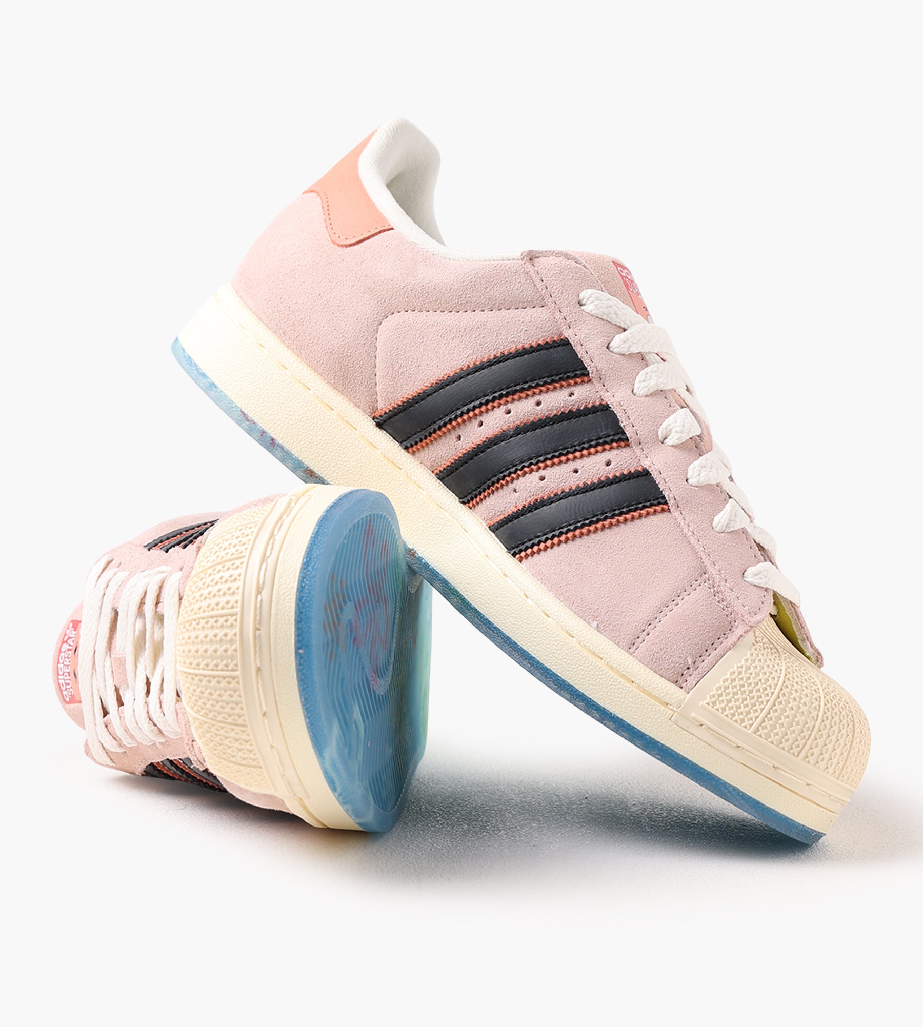 The Adidas Patrick Superstar in Supplier Color/Core Black/Wonder Clay reimagines the iconic sneaker with a playful twist, blending 70% premium leather and 30% rubber for a durable yet refined finish. Part of the SpongeBob SquarePants collection, the design celebrates Patrick Star with a pink leather upper and translucent blue outsole, adorned with floral graphics inspired by Bikini Bottom's sky.