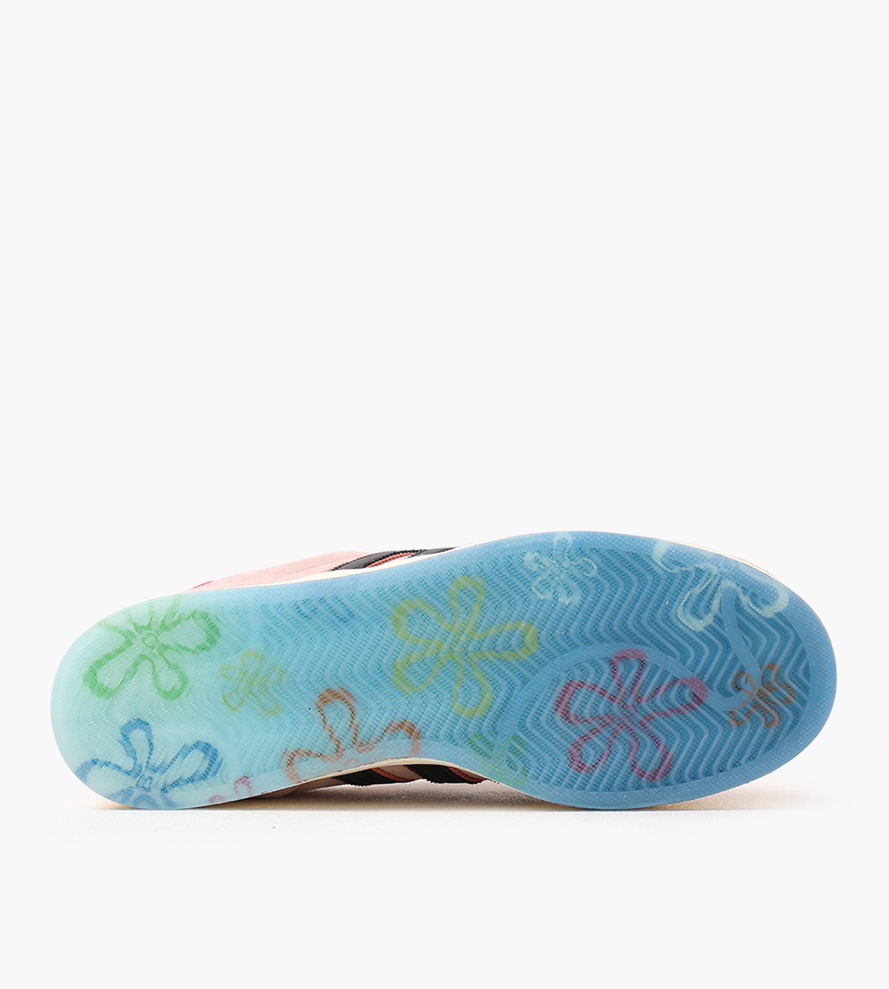 Cold cement construction ensures sturdy wear, while the soft textile lining enhances comfort for all-day use. Secondary green laces with purple floral accents mimic Patrick’s signature shorts, adding a whimsical yet thoughtful detail to this heritage silhouette.