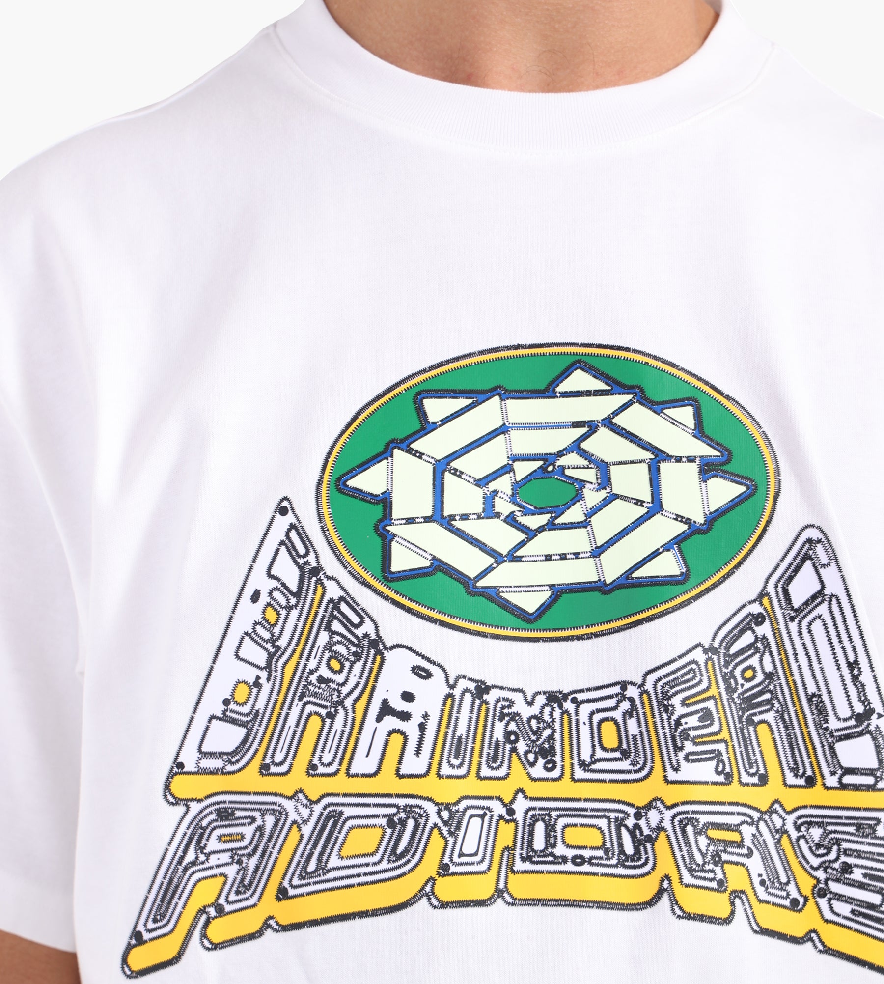 The Adidas Originals x Brain Dead T-Shirt in Wonder White is crafted from 100% cotton, offering a soft jersey fabric that feels lightweight and breathable against the skin. A straight hem and classic crewneck anchor its versatile silhouette, while the Wonder White colorway provides a clean canvas for the bold co-branded graphic at the front.