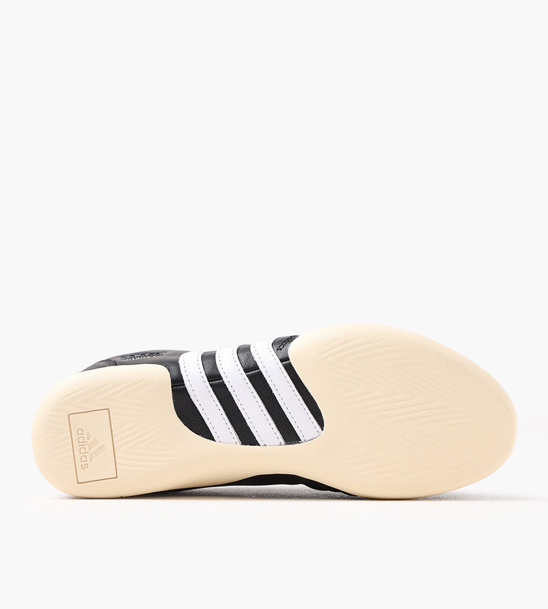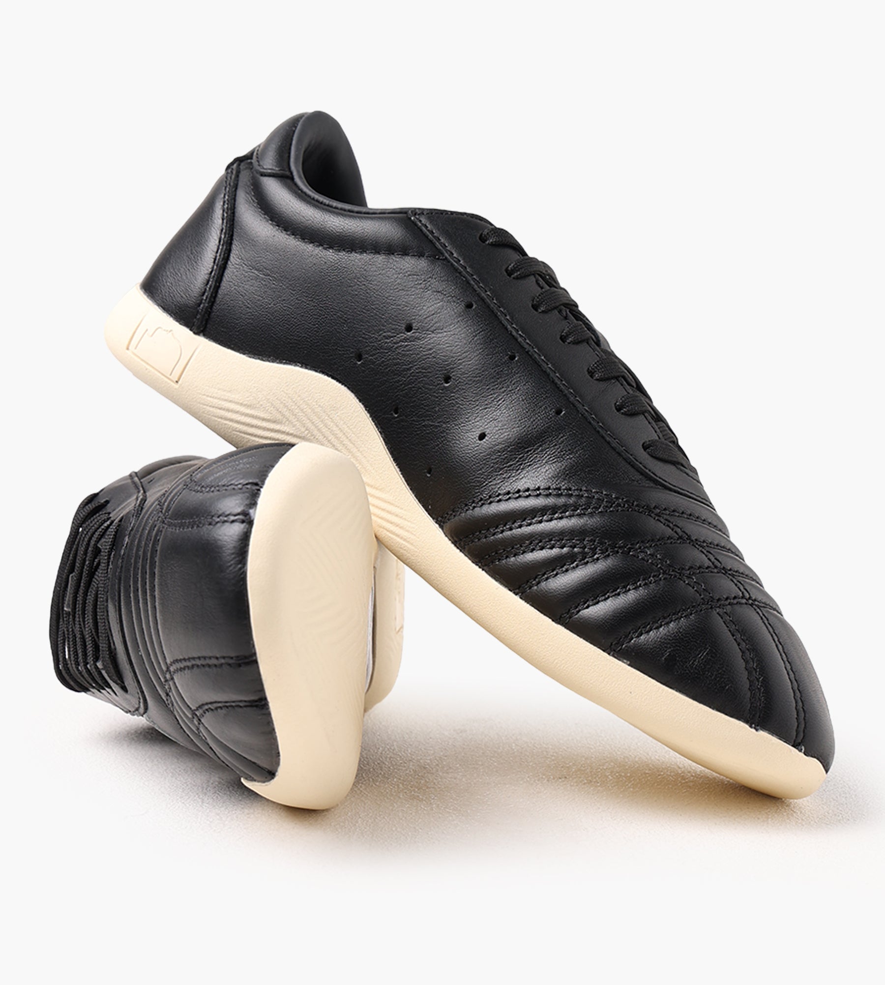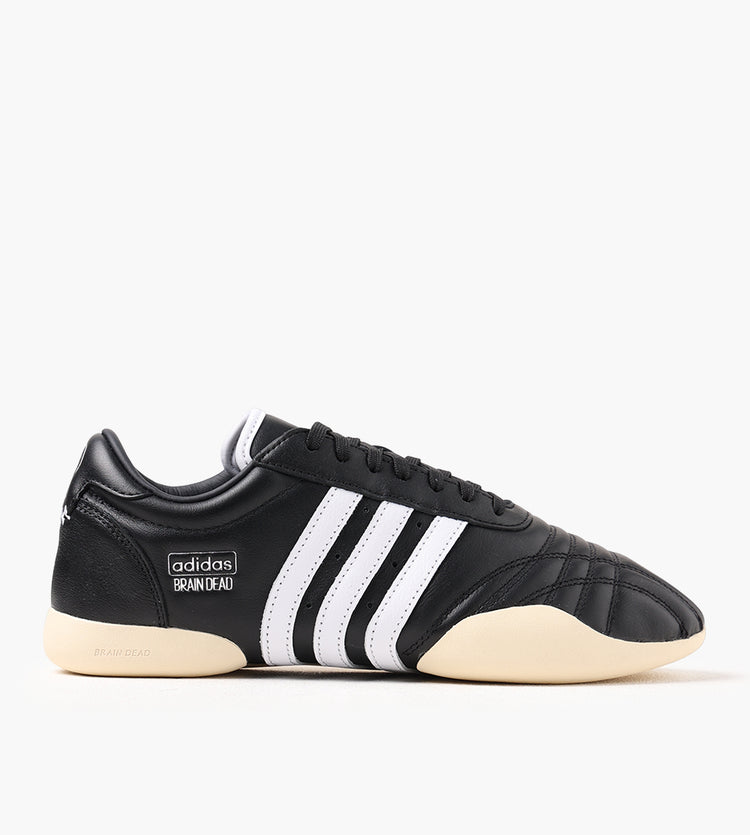 The Brain Dead x adidas TAEKWONDO in Core Black, Cloud White, and Warm Vanilla merges premium materials with a streamlined, martial arts-inspired silhouette. Its leather and synthetic upper is paired with a leather-lined interior, offering durability and a refined finish. Cold cement construction enhances structural integrity, while stitched toe panels and perforations between the iconic three stripes add subtle texture.