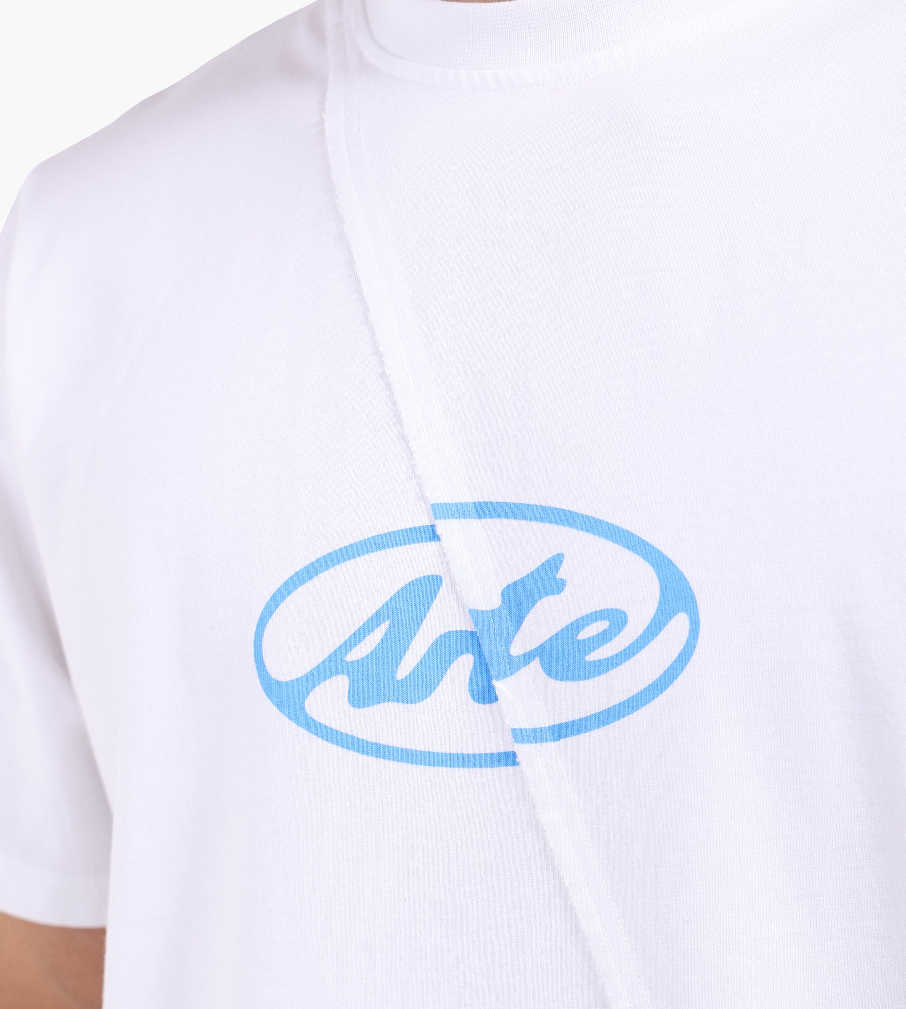 The Arte Antwerp Circle Logo T-shirt in white is crafted from 100% premium heavyweight cotton, offering a soft, substantial feel. This relaxed-fit piece features a slightly higher neckline for a refined silhouette, while a navy and red seasonal graphic, divided by a central seam, embodies deconstructed design elements from Arte’s 10th anniversary collection.
