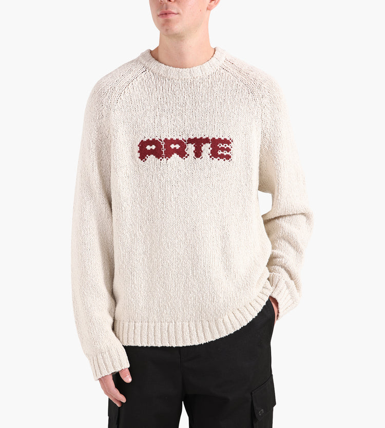 The Arte Antwerp Pixel Front Knit in cream is crafted from a blend of 70% cotton and 30% linen, delivering a heavyweight knit with a soft yet structured hand. This premium fabric combination ensures breathability and resilience, making it a reliable layer for transitional weather. A clean silhouette is anchored by the embroidered Arte logo in burgundy across the chest, adding a subtle touch of distinction.