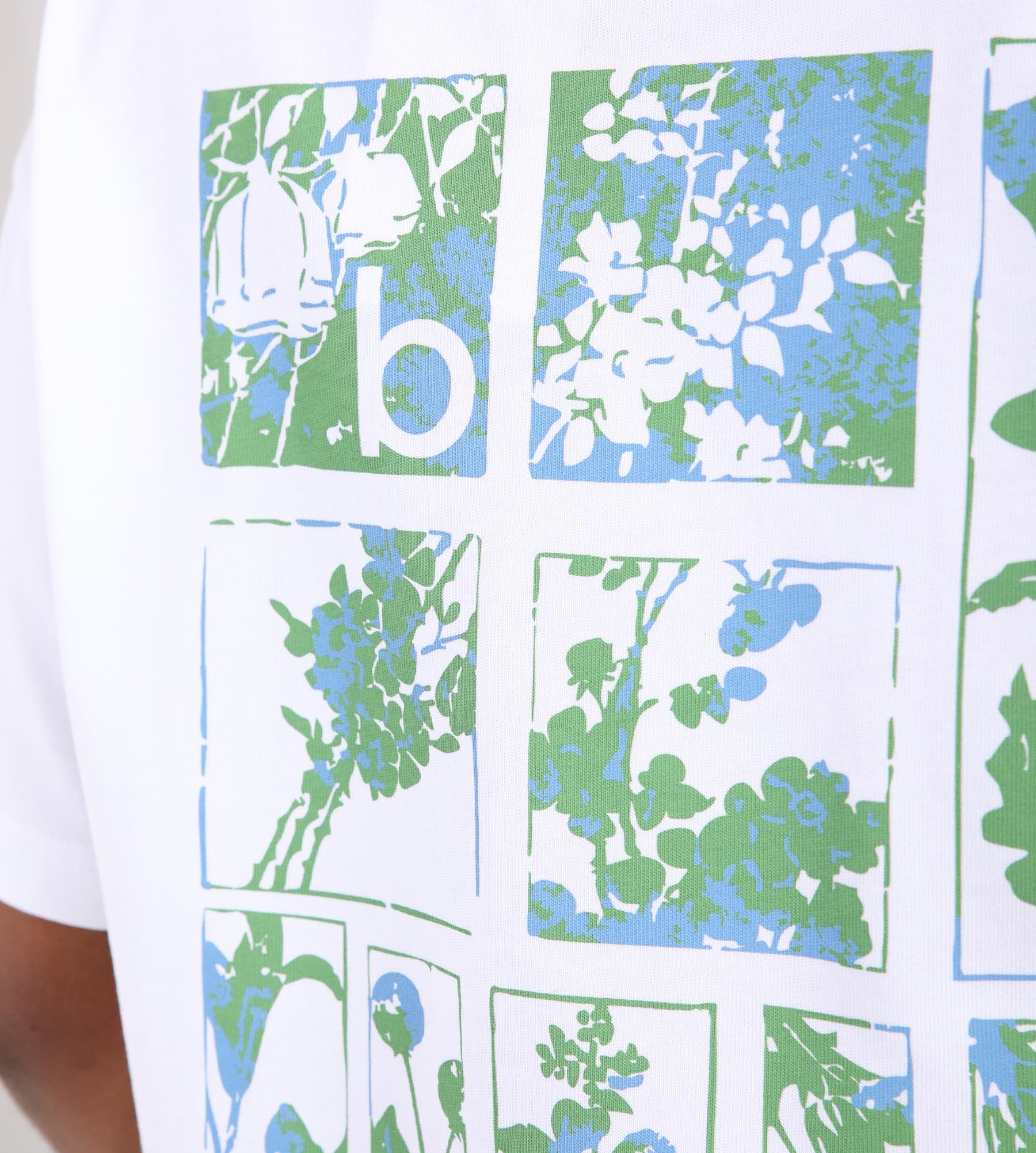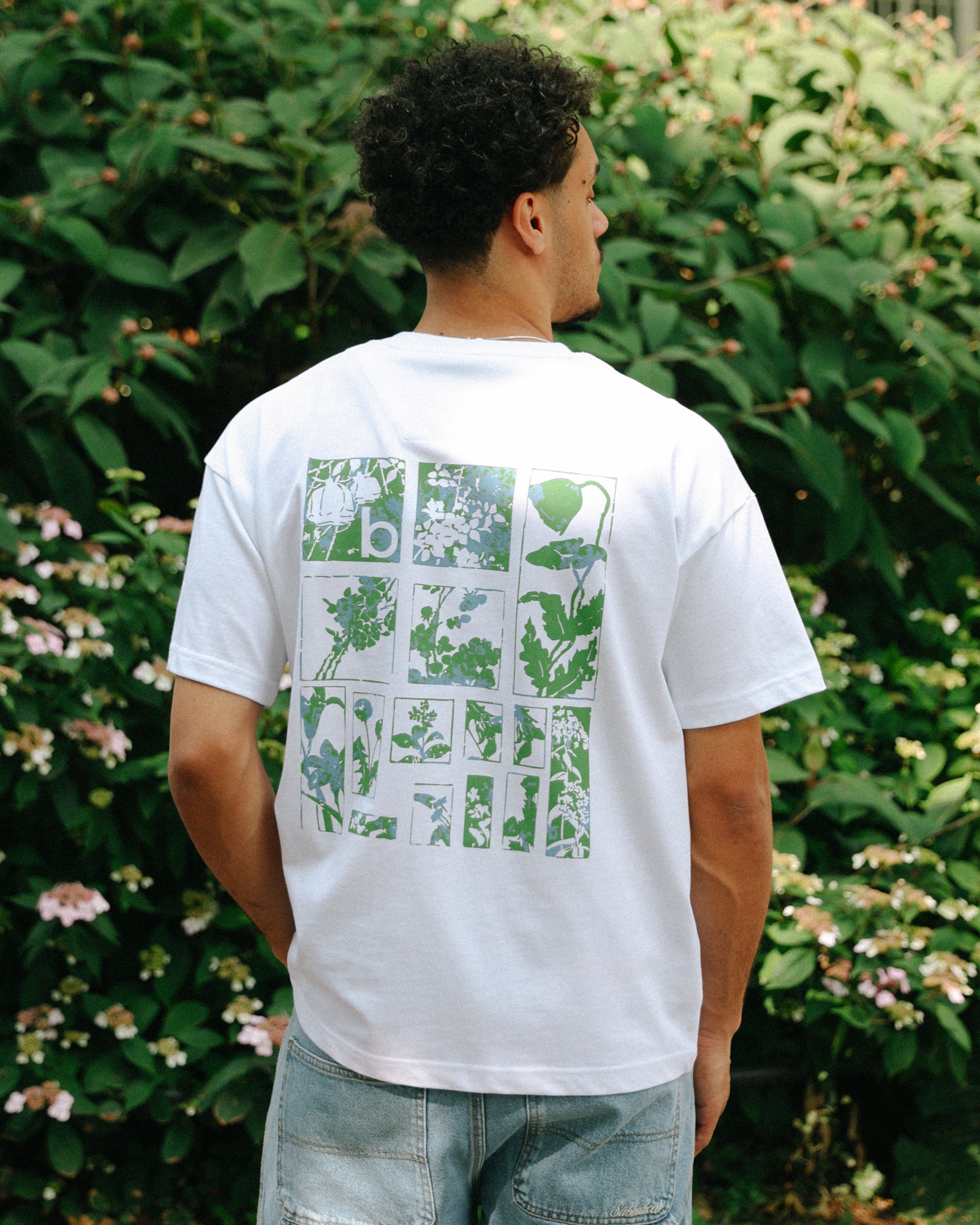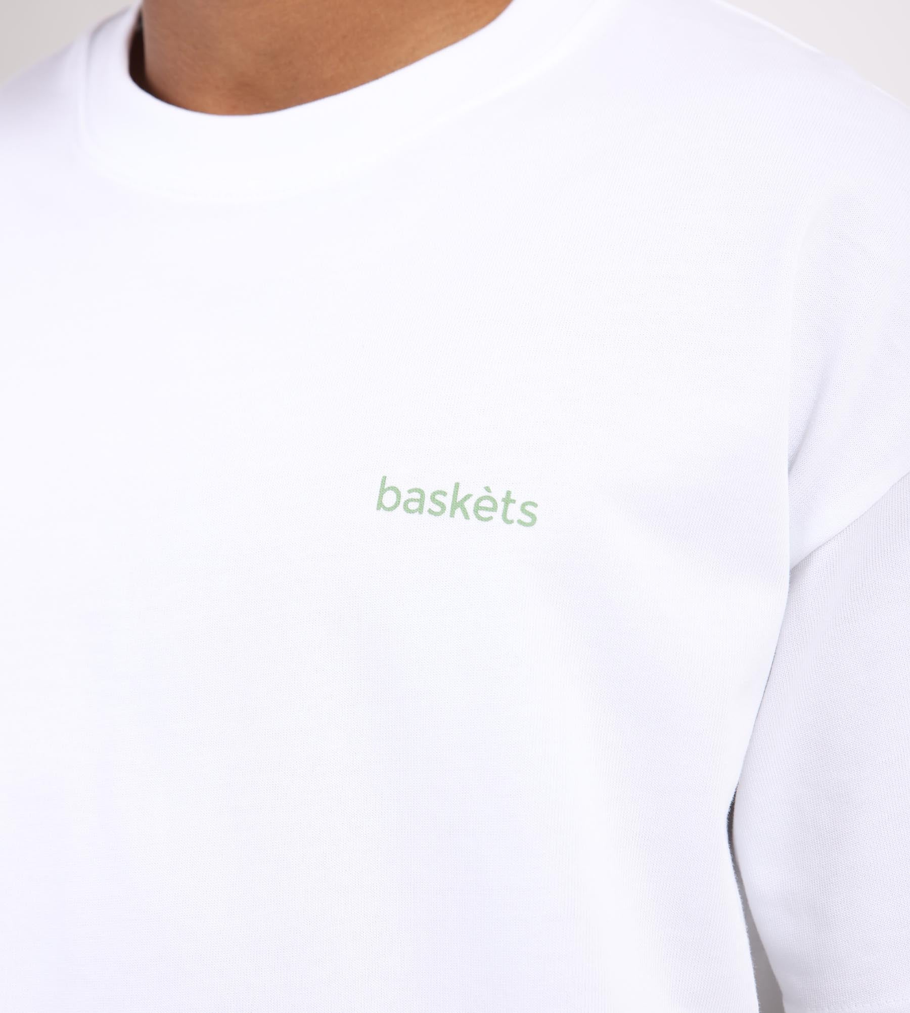 This is the Baskèts Greenery Tee in White Green, cut from 260gsm organic cotton. It features a printed chest logo and a seasonal back graphic inspired by summer days in Vondelpark, finished in our familiar relaxed fit.