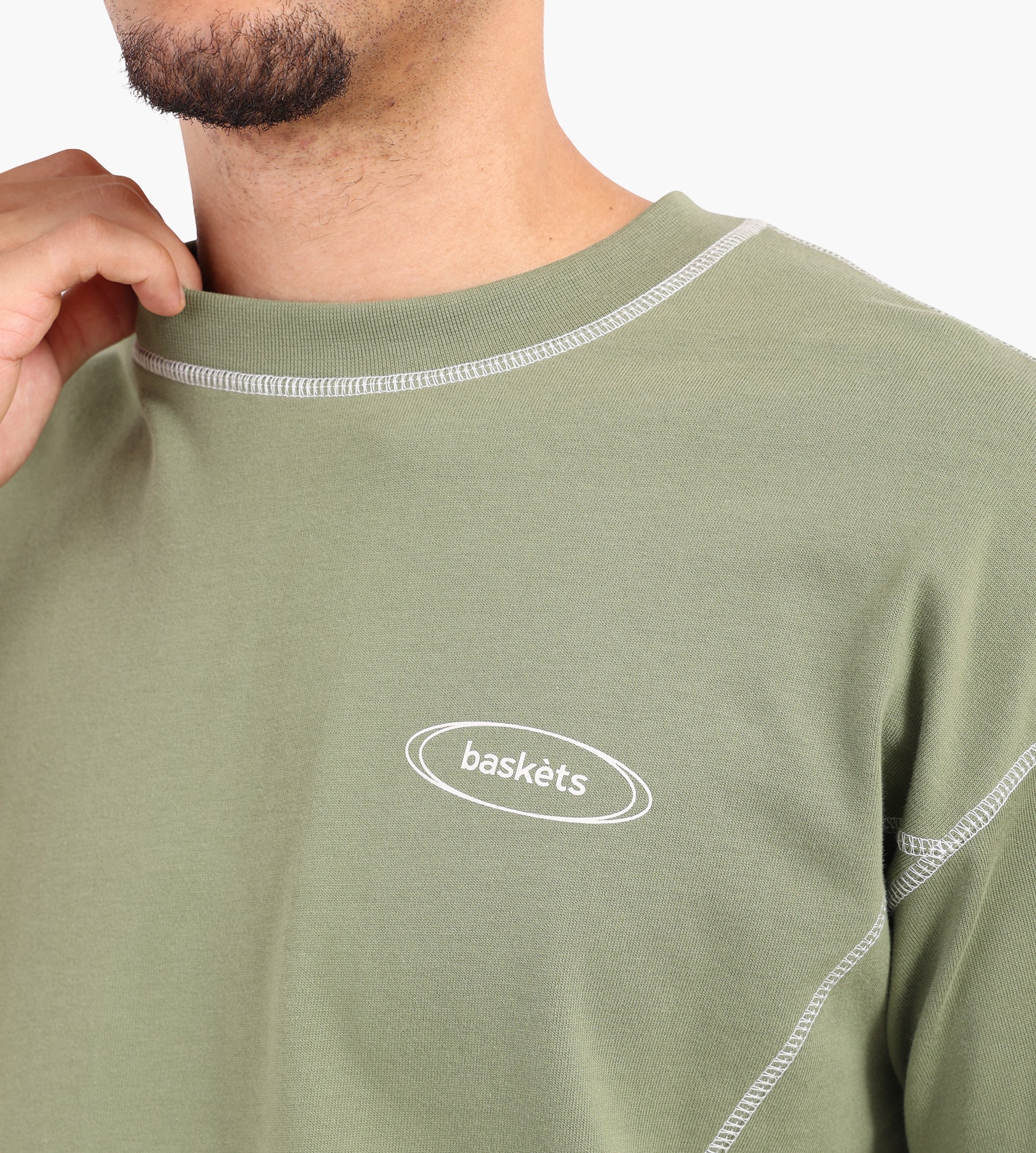 The Baskèts Modern Contrast Tee in Aged Olive is crafted from 100% organic cotton, offering a sustainable and naturally soft touch. With a robust 260gsm weight, this tee provides a substantial feel that balances durability with breathability. The Aged Olive colourway lends a timeless, earthy tone, perfect for quiet moments or bustling city days.