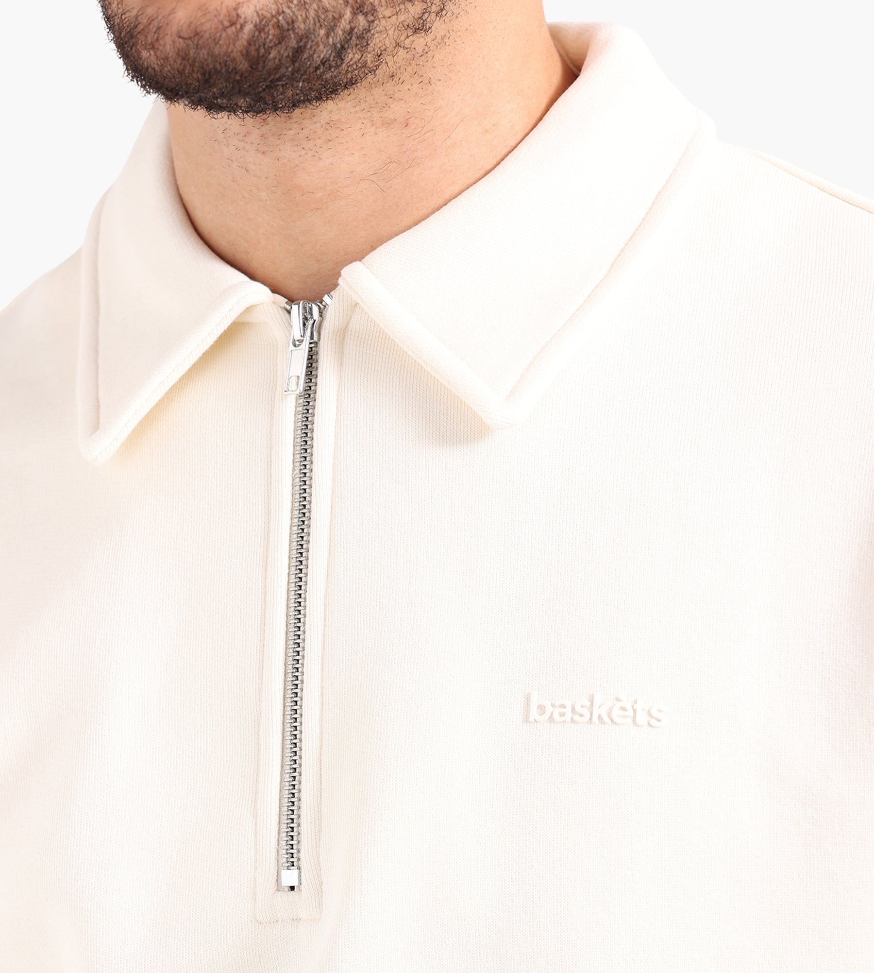 The Baskèts Modern Half-Zip Polo in Butter is a contemporary take on a classic silhouette with a relaxed fit. It features a half-zip closure and ribbed cuffs and hem, making it perfect for everyday wear.