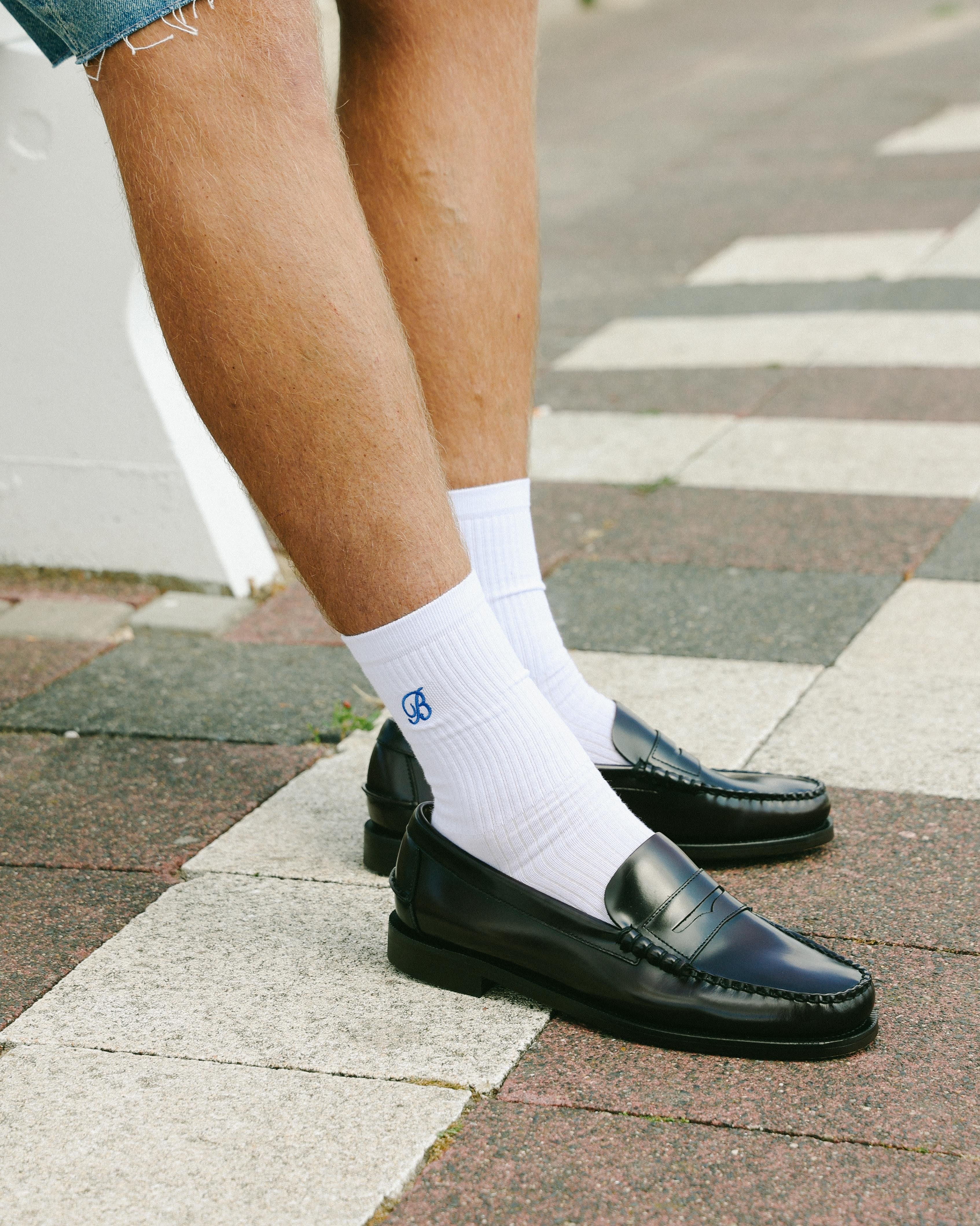 These are the Baskèts Socks in White Blue—regular fit, with embroidered artwork at the ankles and a logo on the sole. Comfortable, everyday essentials.