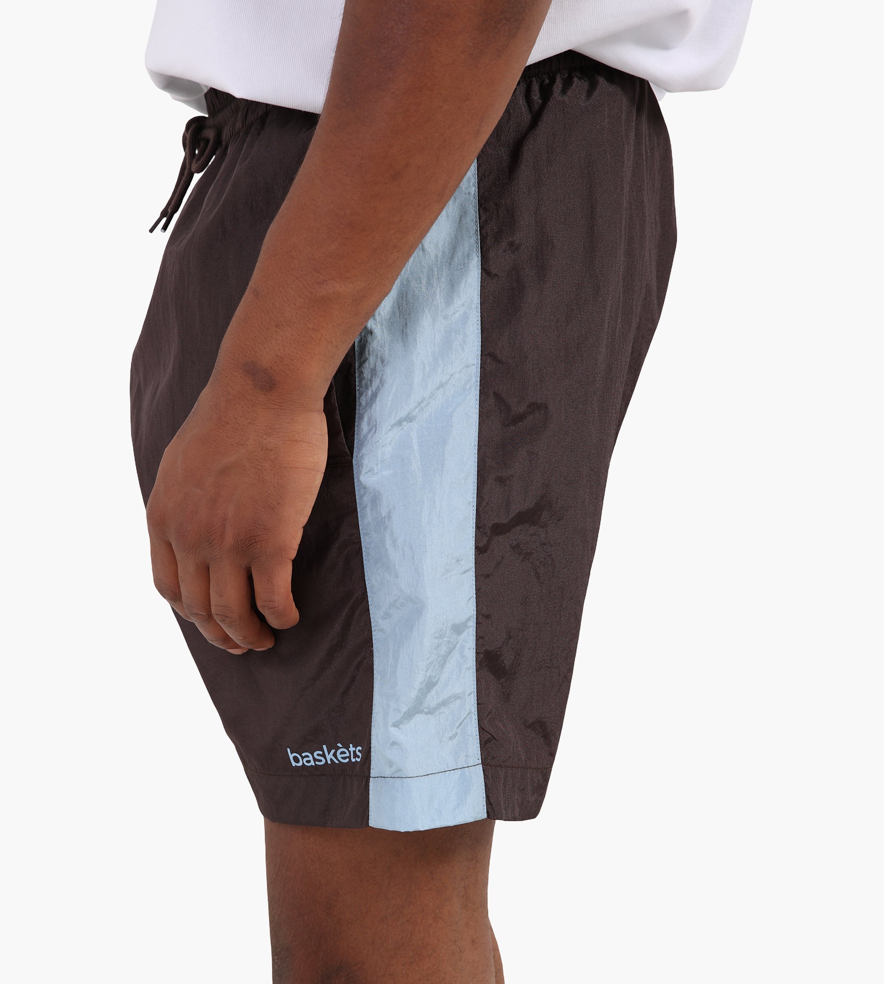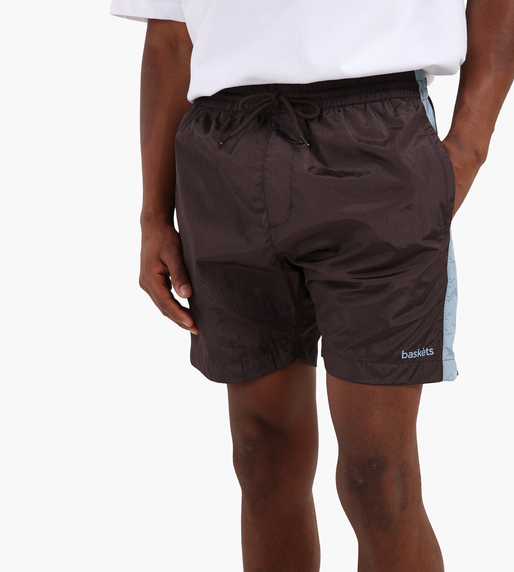 These are the Baskèts Swim Shorts, featuring front pockets, a back pocket with zip, and an elasticated waistband with matching drawstring. Finished with an embroidered logo, contrast side panels, and a relaxed fit.