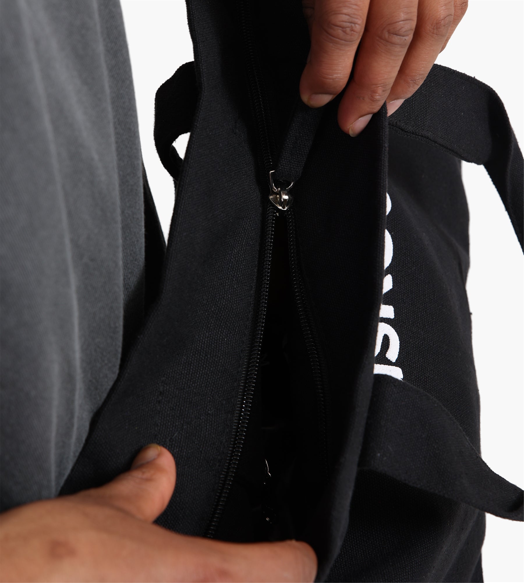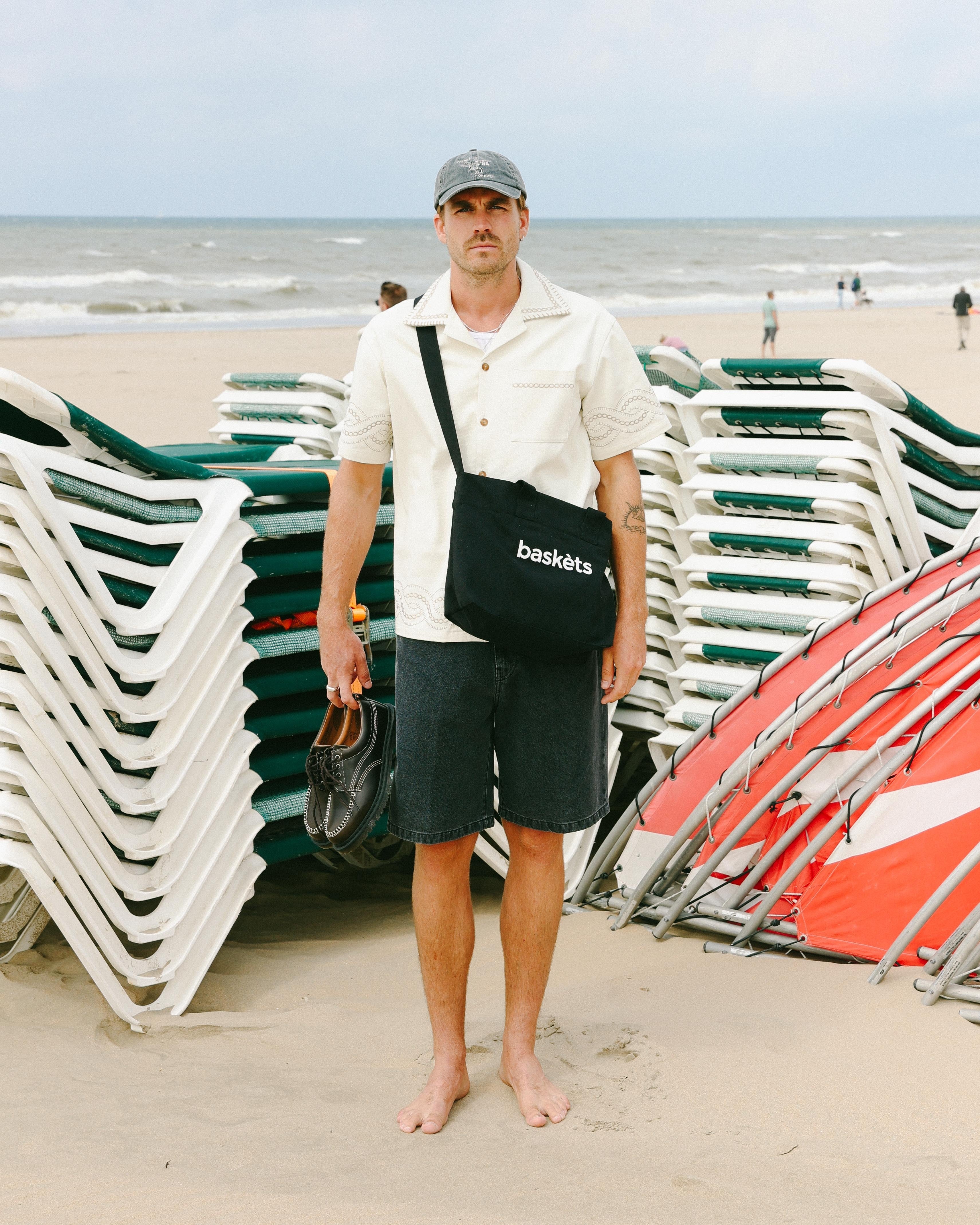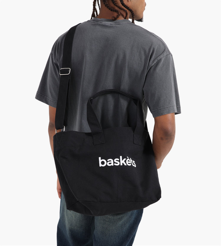 This is the Baskèts Tote Bag Small in Black, made from heavyweight canvas cotton. It features a statement logo print, adjustable straps and reinforced handles for everyday use. The interior includes a smaller pocket with a zip closure.