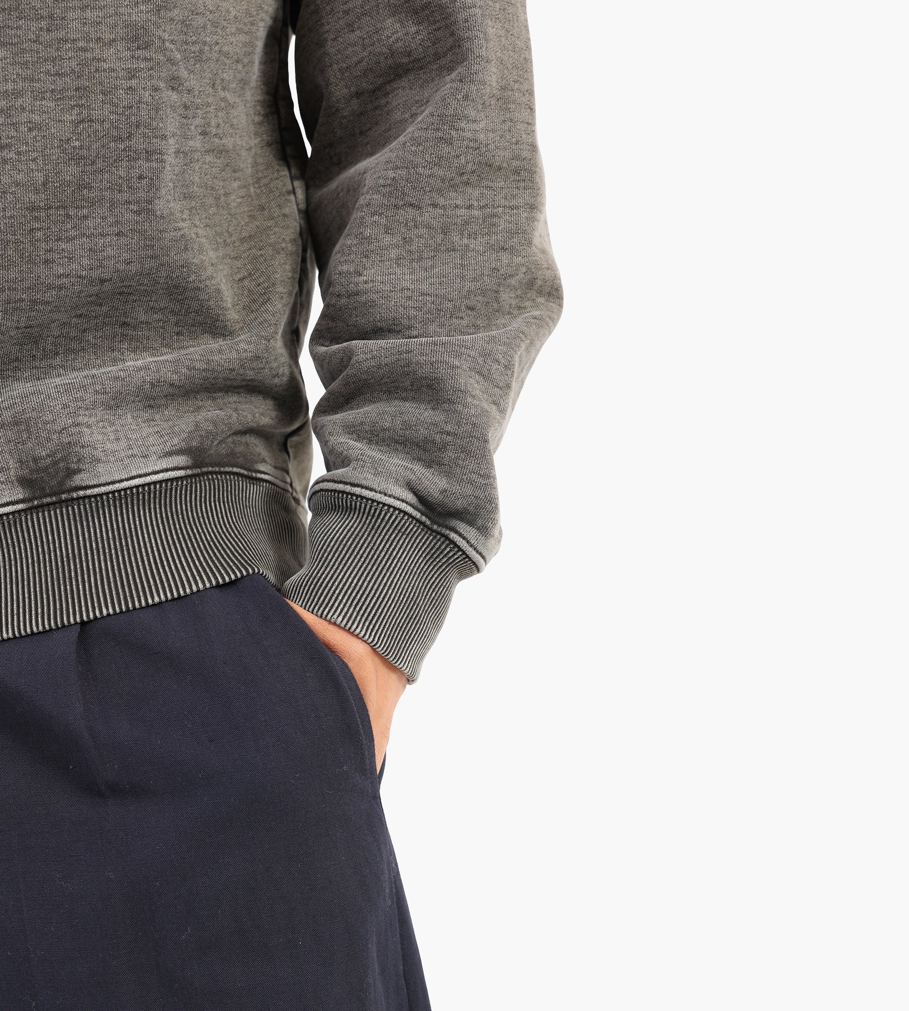 The Bram's Fruit Cut & Sew Crewneck in Washed Charcoal Black is crafted from a midweight cotton blend, offering a soft yet durable foundation for layering. Its washed finish enhances the garment's texture, adding depth to the muted charcoal tone while maintaining a lived-in feel.