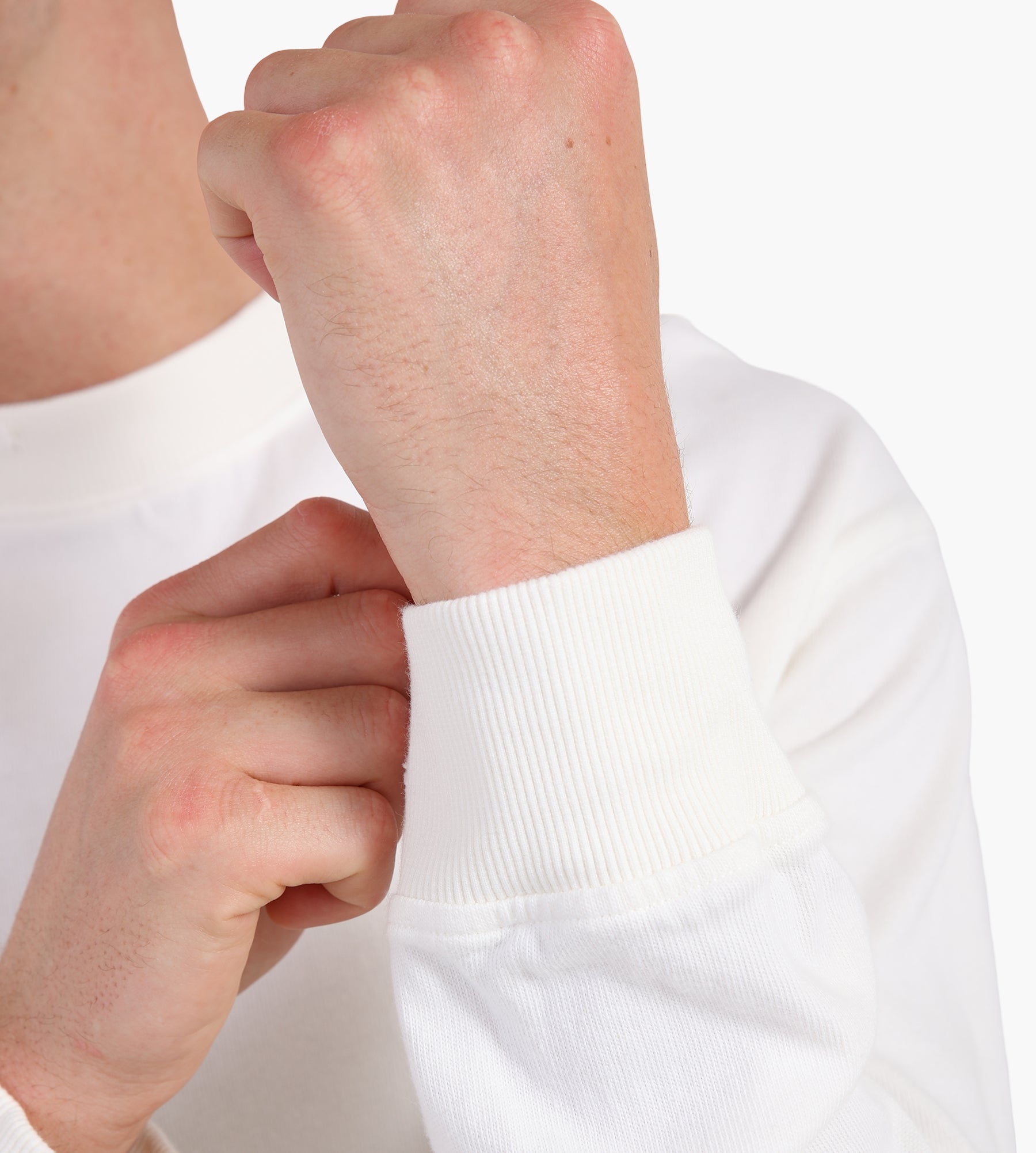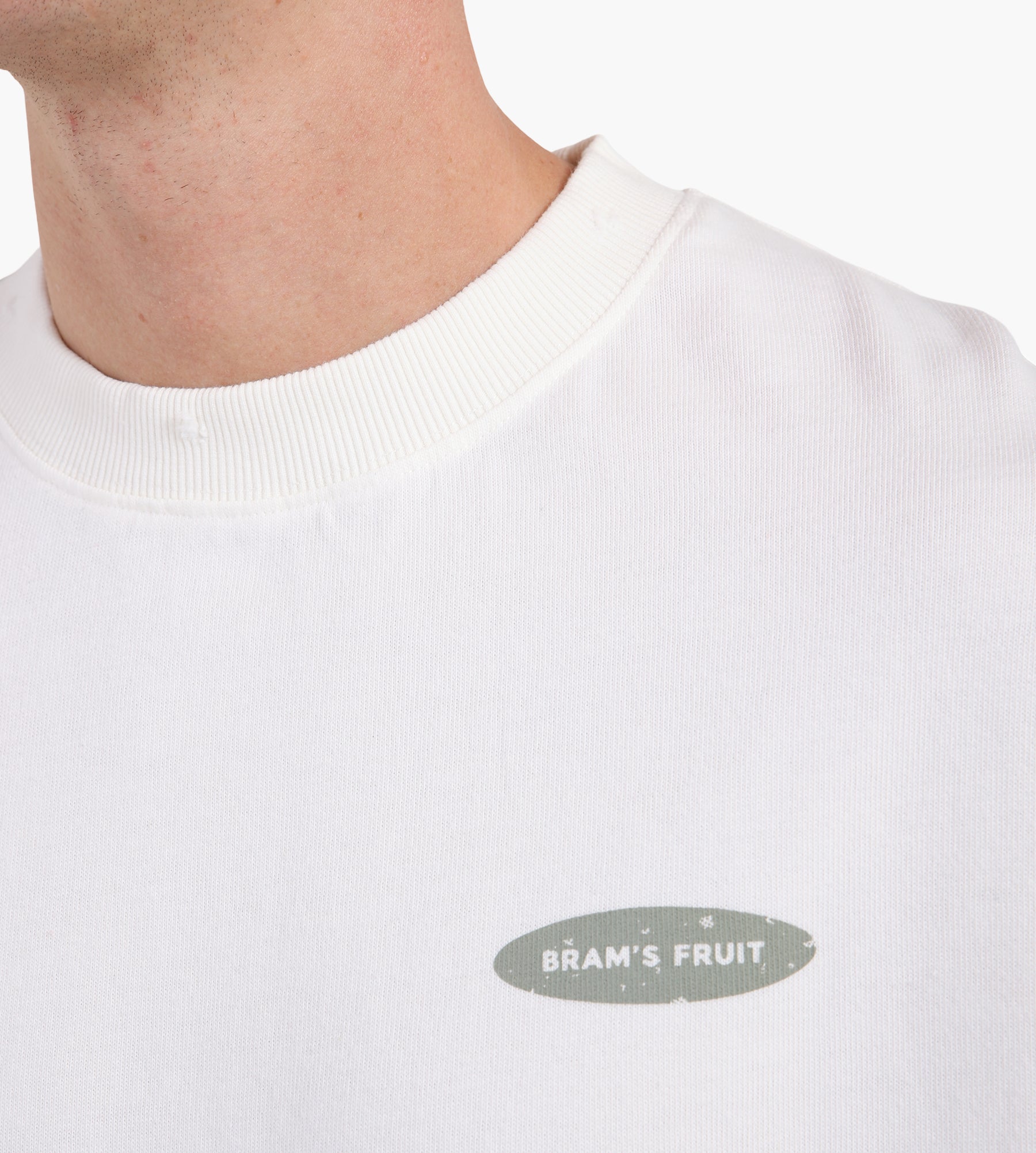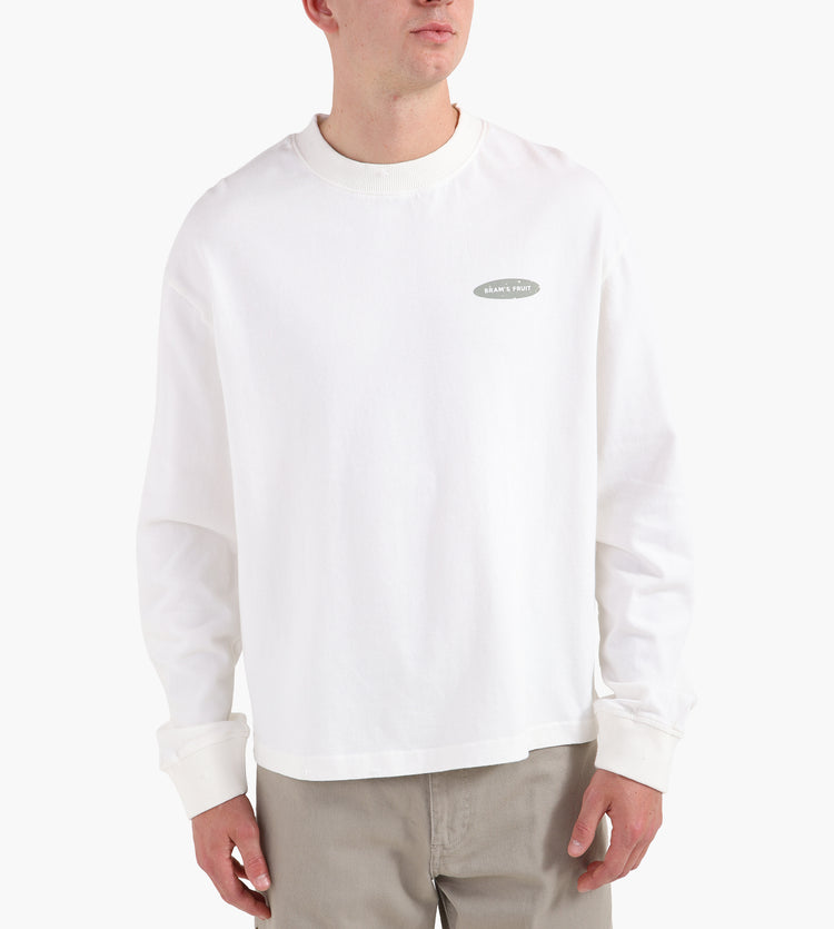The Bram's Fruit "F*ck Off" Longsleeve in Distressed White is crafted from soft, mid-weight cotton, offering a lived-in feel with a deliberately distressed finish. The clean white backdrop is punctuated by bold graphic text across the chest, creating a striking visual contrast that speaks to the brand's irreverent ethos.