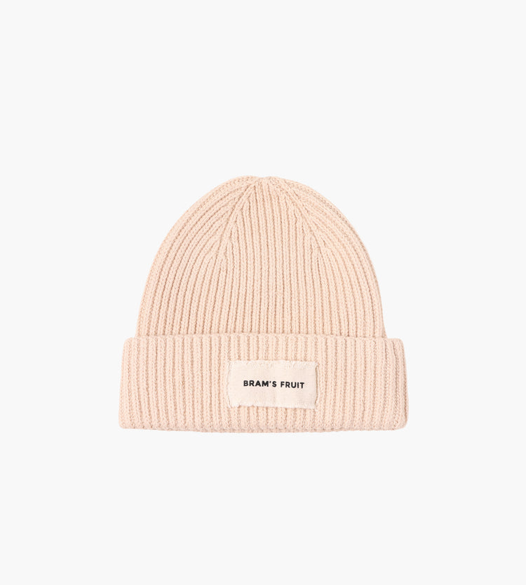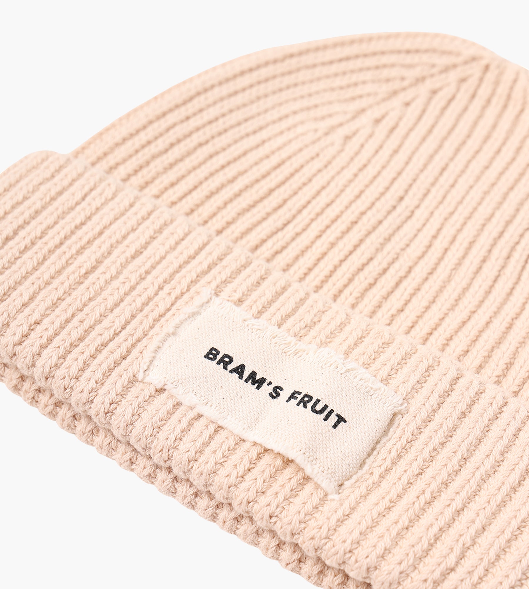 The Bram's Fruit Distressed Beanie in Beige is crafted from soft, breathable cotton, offering a lightweight yet insulating option for cooler weather. Its ribbed knit construction ensures a snug fit, while the distressed canvas label adds a subtle, utilitarian edge to the design.