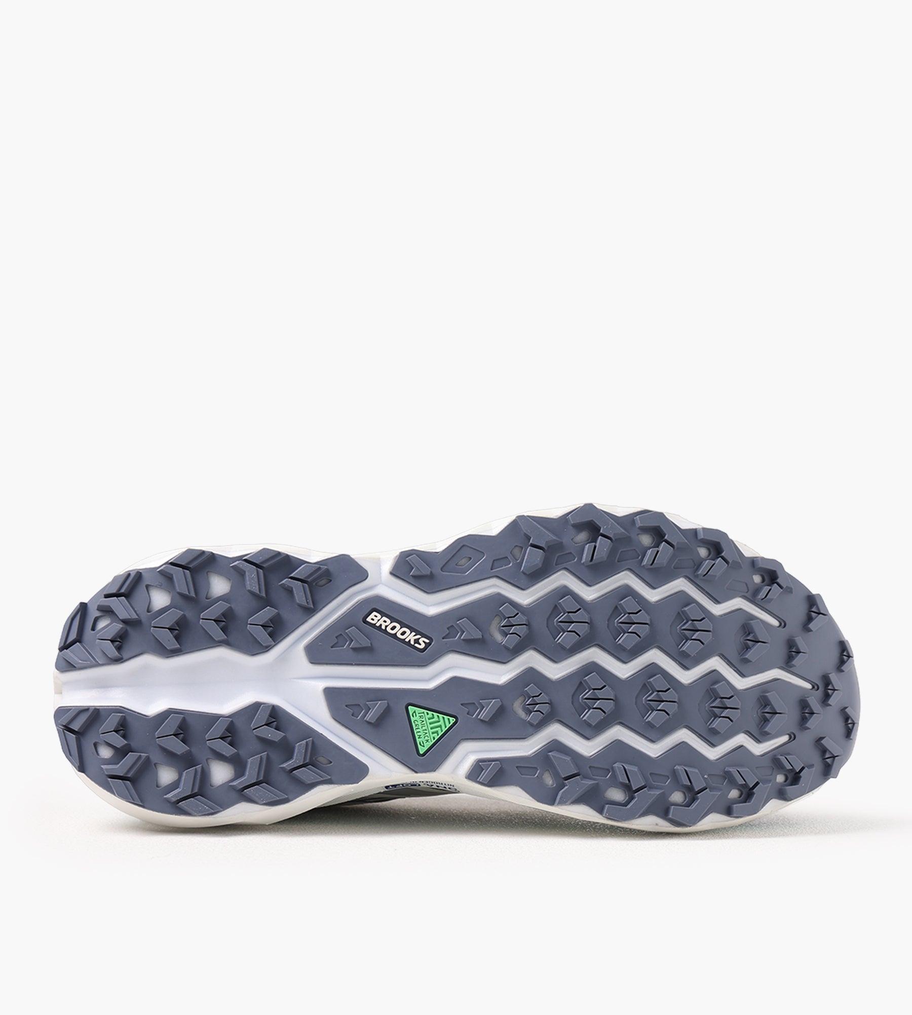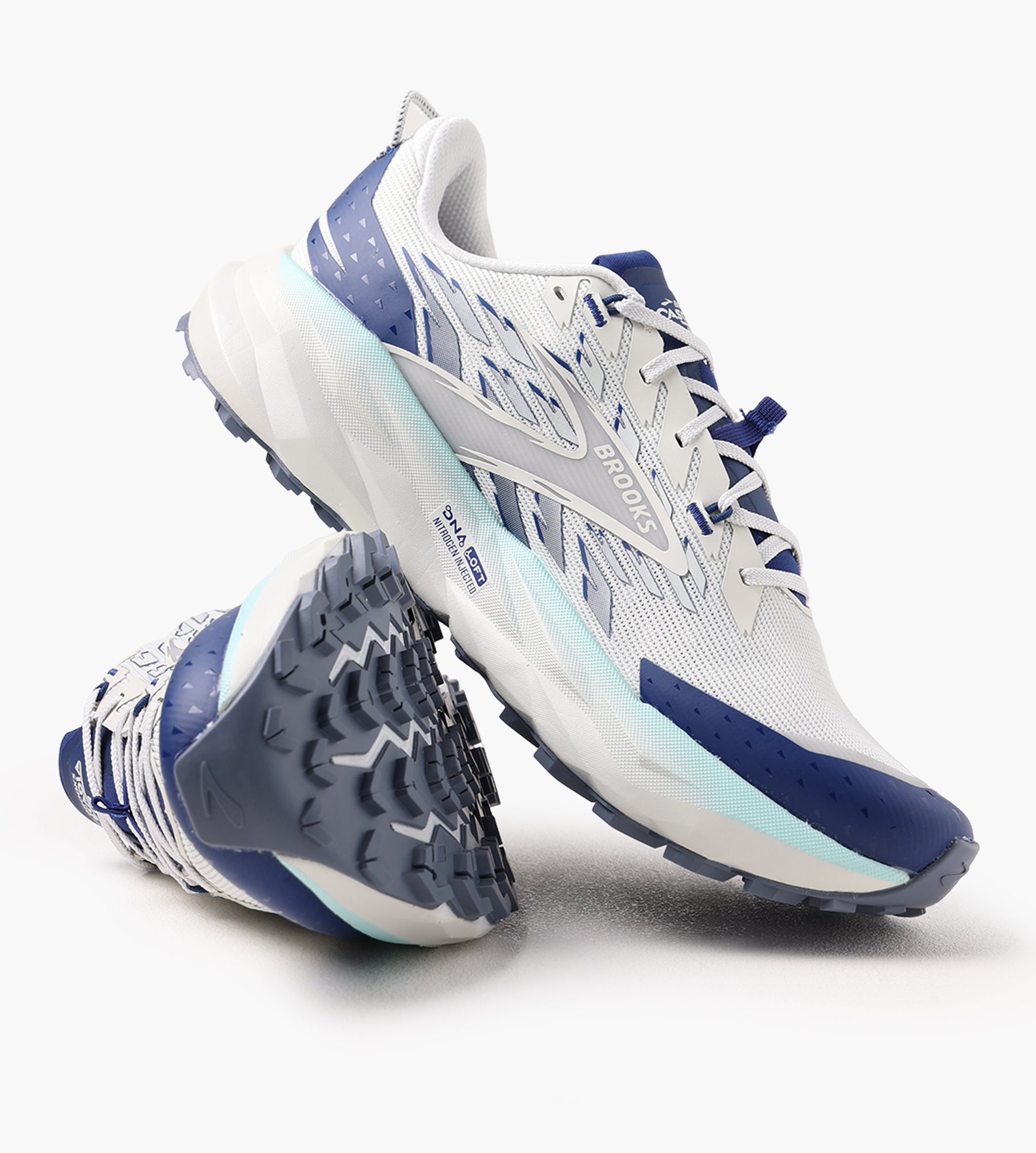 The Brooks Cascadia 19 trail running shoes in Blue/Gray/Bellwether are engineered for stability and comfort across rugged terrain. An airy mesh upper enhances breathability while integrated structural elements ensure a secure fit. The Updated Trail Adapt System combines a flexible rock plate with DNA LOFTv3 foam cushioning for adaptive performance on uneven trails.