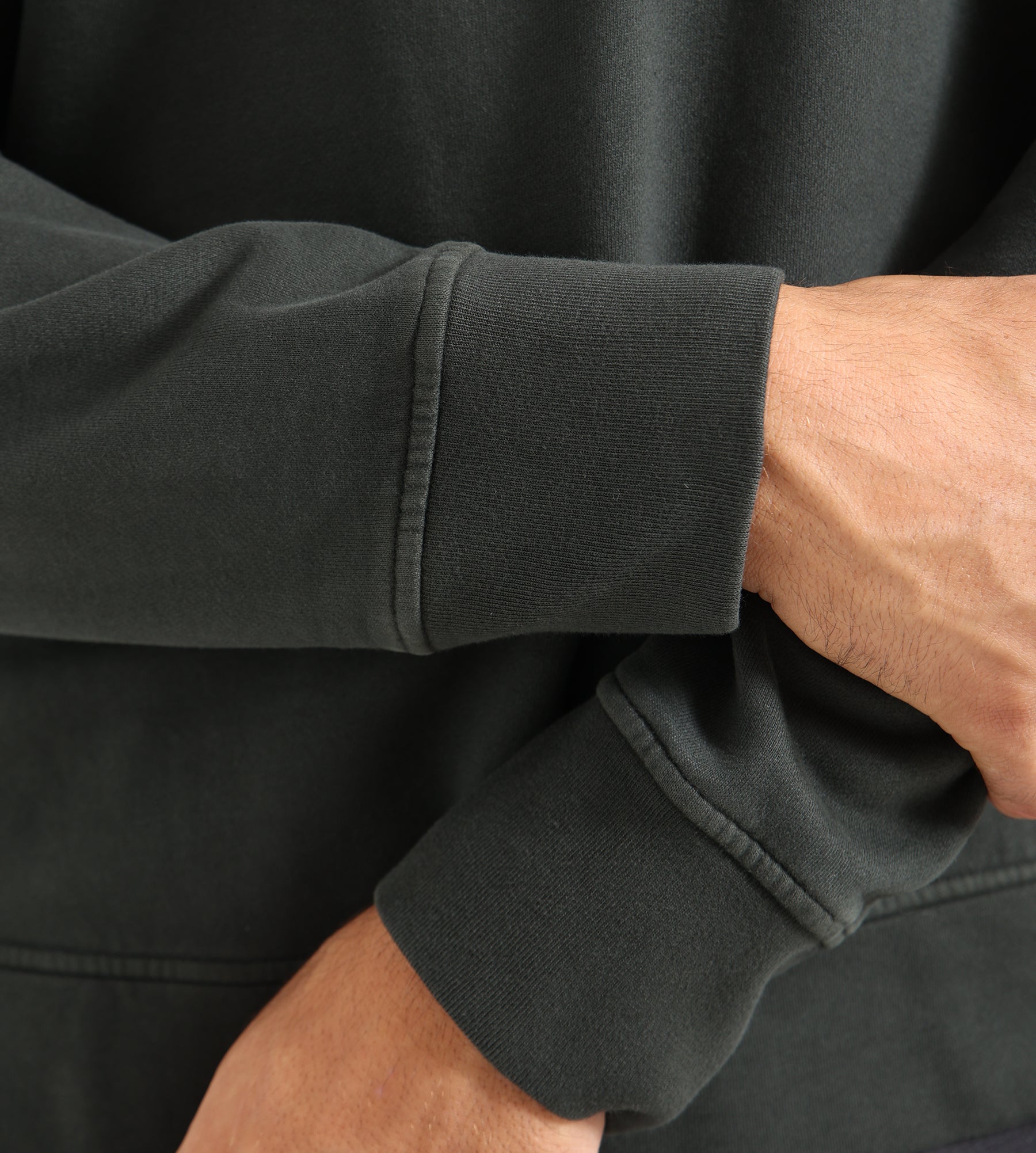 - Ribbed crew neck, cuffs, and hem