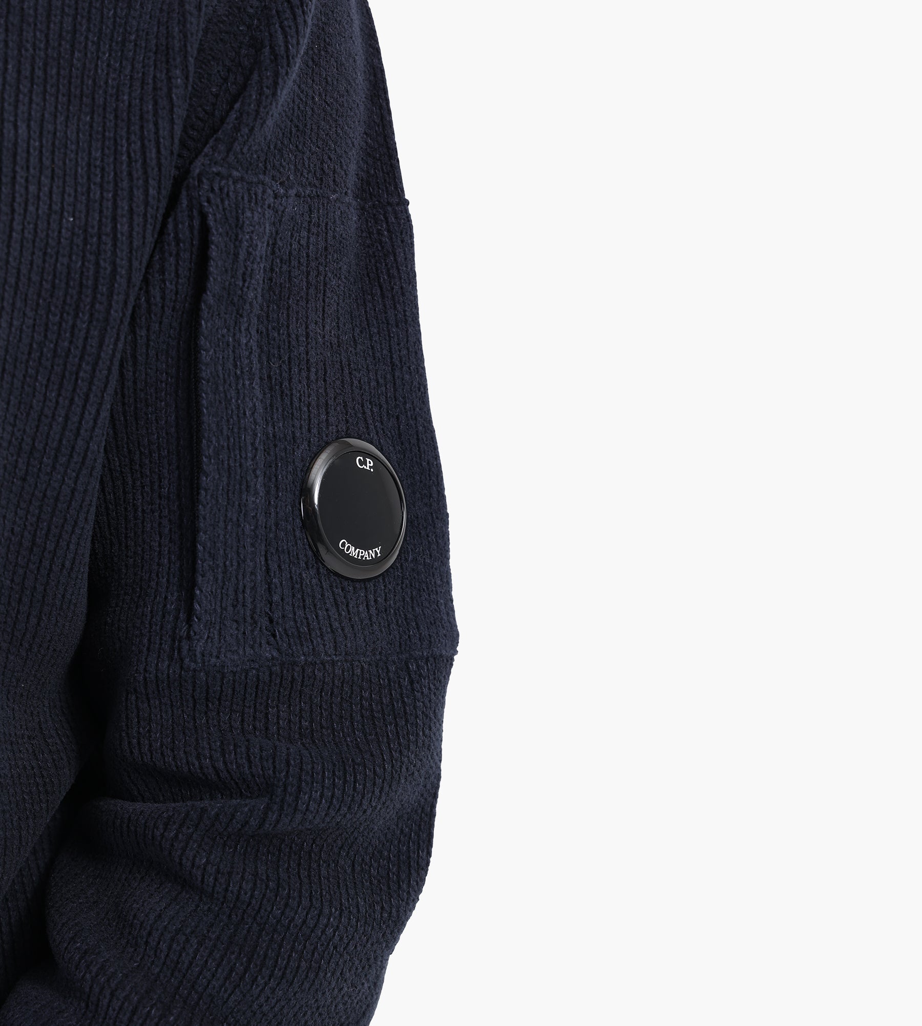 The C.P. Company Chenille Cotton Knit in Total Eclipse is crafted from 100% cotton, delivering a soft yet durable layer with a 7-gauge knit thickness. The garment-dyed finish enhances the deep, rich tone, while ribbed detailing at the neck, cuffs, and hem provides a clean, structured silhouette. A signature lens detail on the arm ties the piece to the brand's utilitarian heritage.