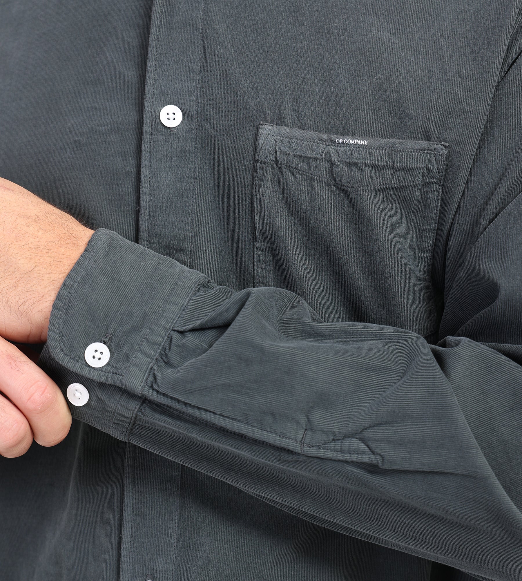 The C.P. Company Corduroy Lens Longsleeve Button Shirt in Dark Shadow Gray combines a refined silhouette with the tactile depth of 2000 Stripes corduroy. Its garment-dyed finish enhances the fabric’s textured softness, while a hint of elastane in the cotton blend ensures a comfortable, flexible fit. A classic collar and full button fastening anchor this piece in timeless tailoring.