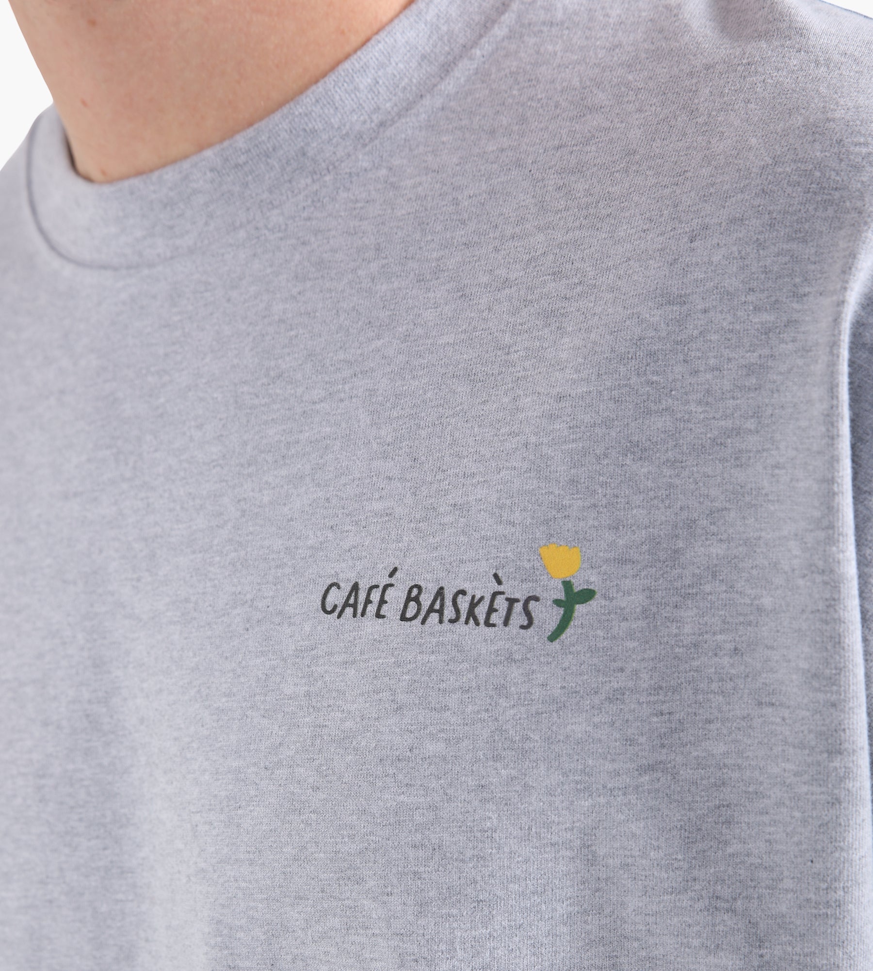 This is our Cafè Baskèts Still Life Tee in Ash Grey, cut from 260gsm organic cotton. It features a printed chest logo and a seasonal back graphic inspired by the Vondelpark, finished in our familiar relaxed fit.