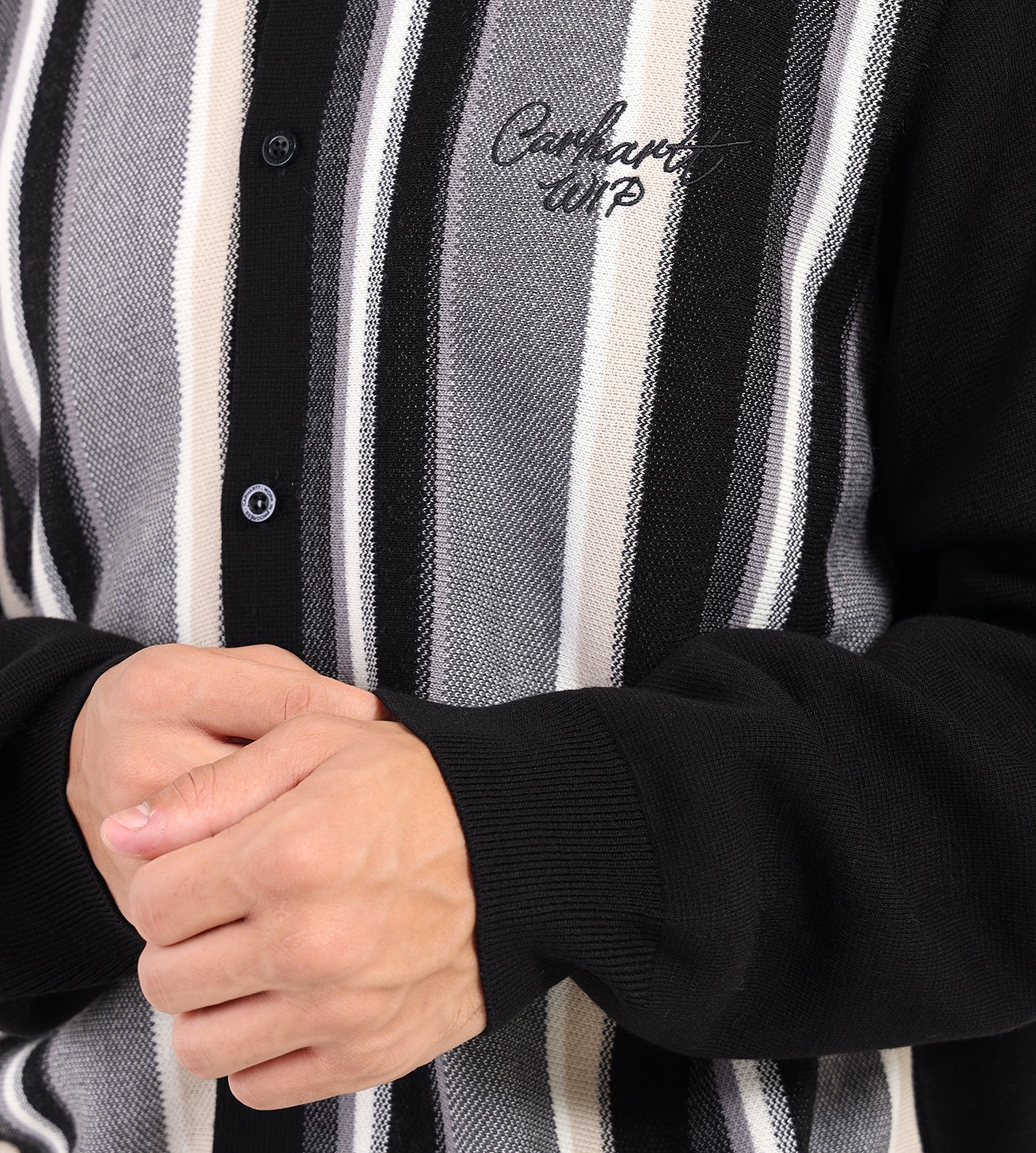 The Carhartt WIP Bainter Cardigan in graphite gray combines 100% acrylic construction with a bold striped pattern in black and white. A black embroidered logo on the chest adds a subtle nod to the brand's heritage, while ribbed cuffs and hem ensure a clean, structured silhouette.