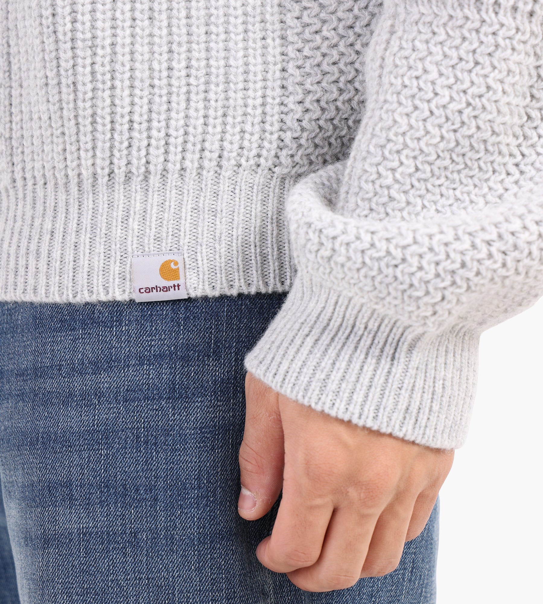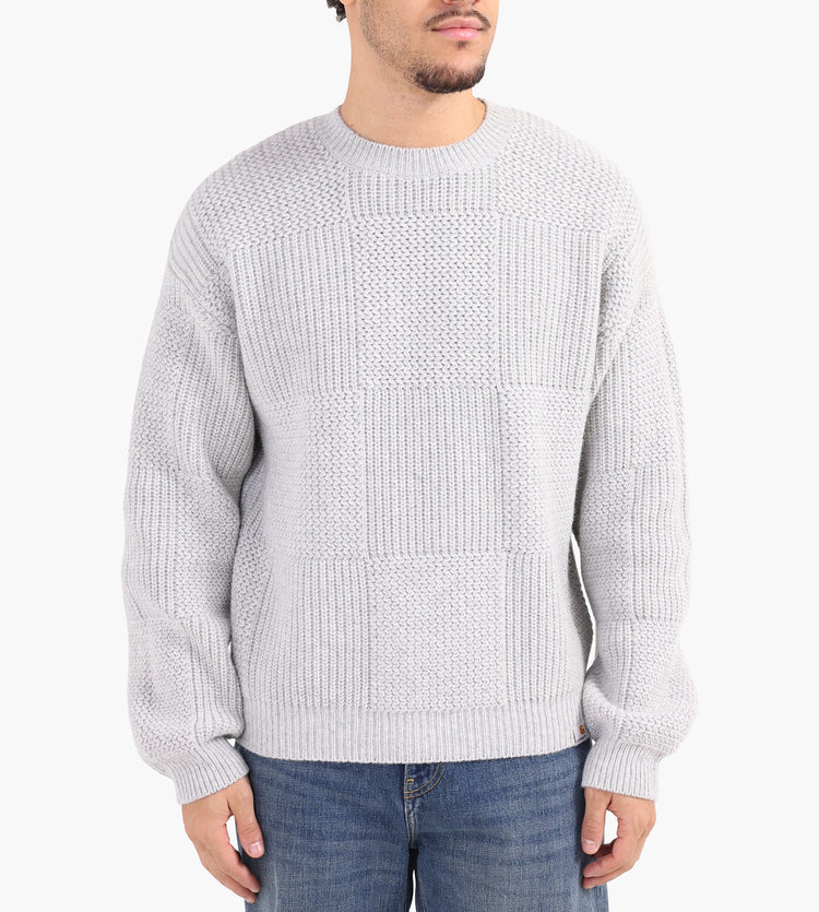 The Carhartt WIP Bishop Sweater in Puddle blends heritage craftsmanship with a modern checkered tone-on-tone design. Crafted from a premium blend of 70% wool, 25% polyamide, and 5% other fibers, it delivers warmth, durability, and a soft hand feel. The intricate knit construction highlights the texture of the wool yarn, adding depth to the understated pattern.