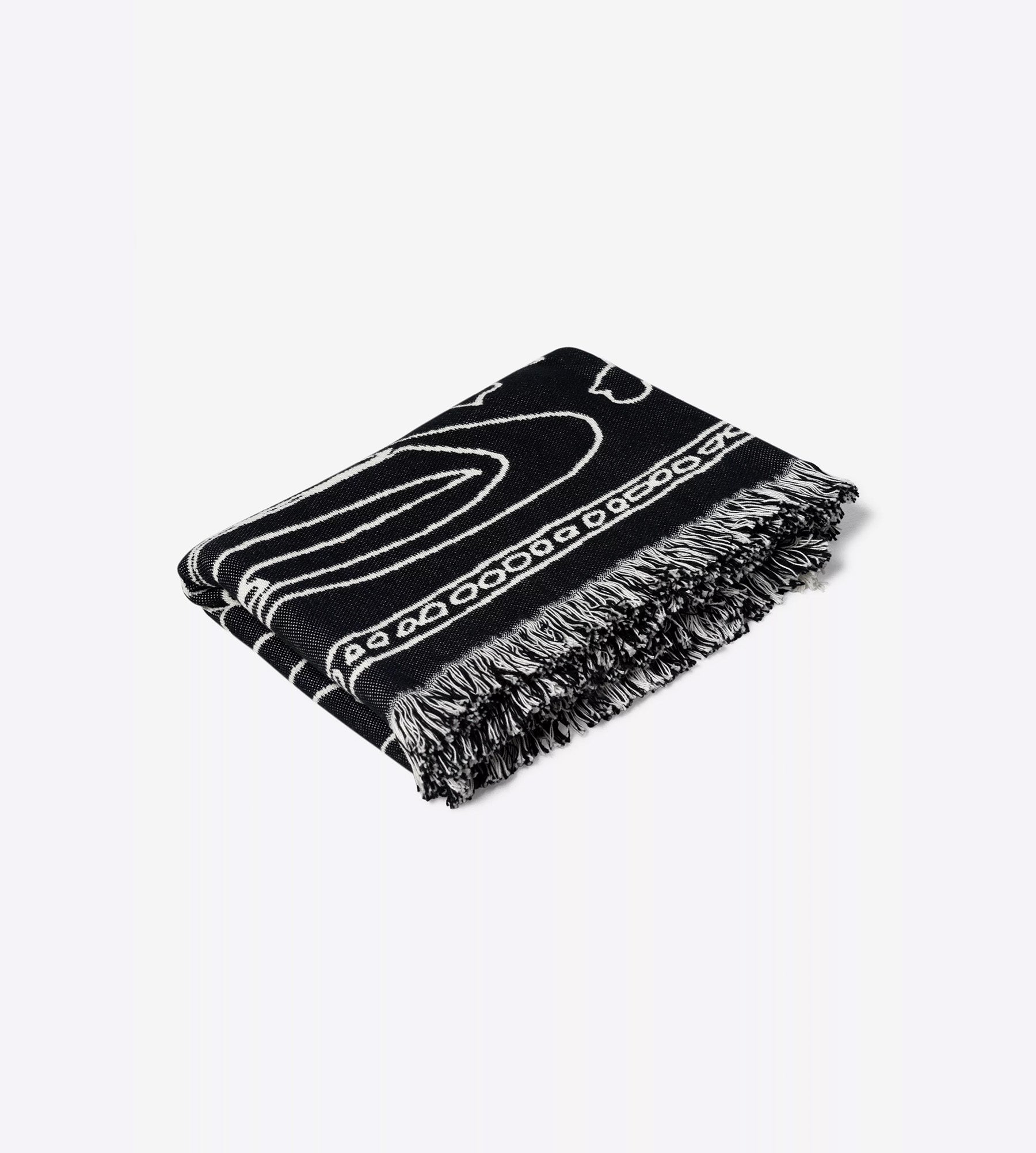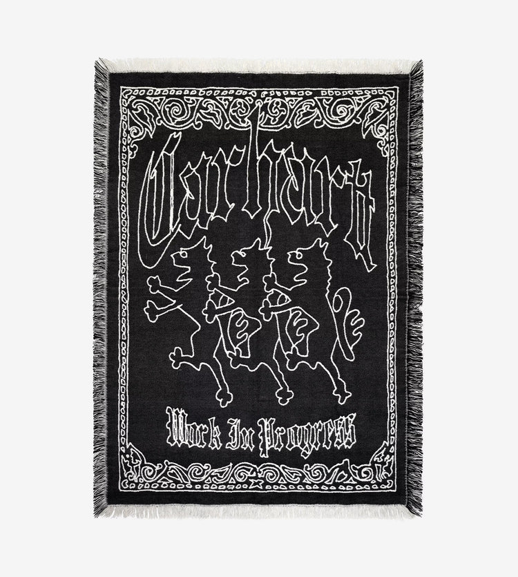 The Carhartt WIP Hackwork Blanket in Black/Wax is crafted from 100% heavyweight cotton, offering a substantial yet soft hand feel. Its allover jacquard design showcases a woven graphic that adds depth and texture, making it a versatile addition to any space.