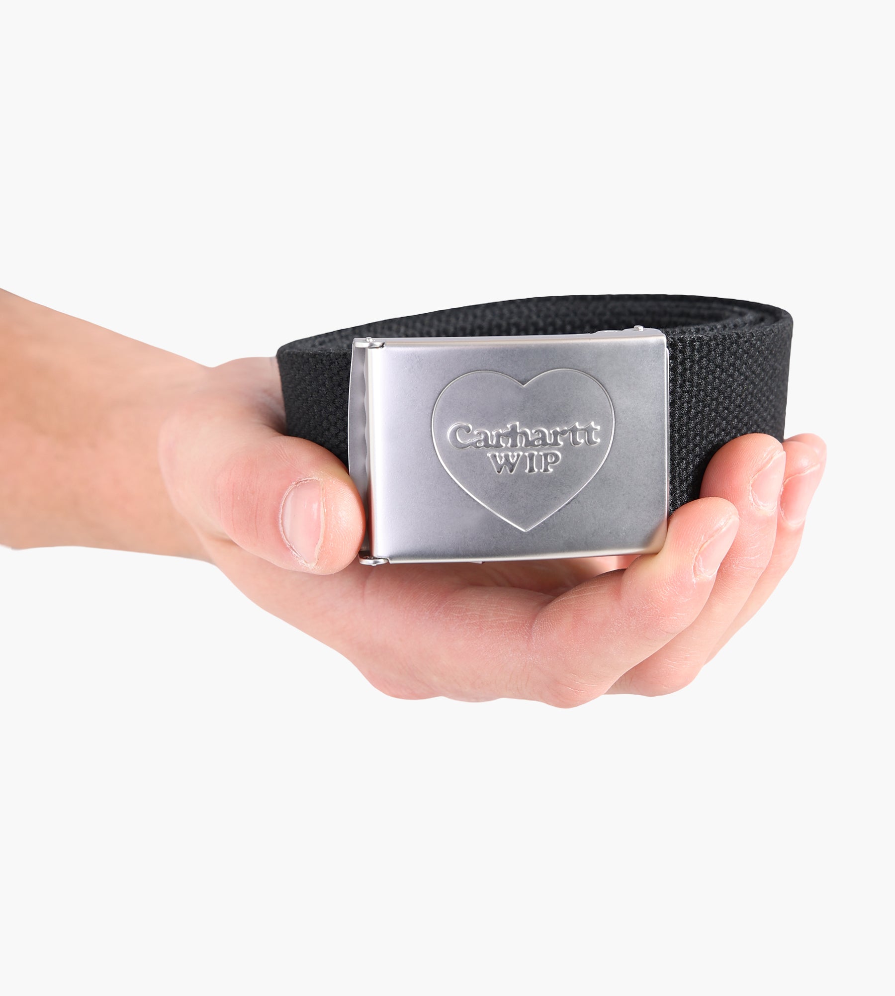 The Carhartt WIP Heart Clip Belt in Black/Silver is crafted from durable 100% polyester canvas, ensuring a robust yet lightweight build for everyday wear. Its standout feature, a heart-shaped metal buckle with a chrome finish, adds a subtle touch of character while maintaining the brand's understated aesthetic.