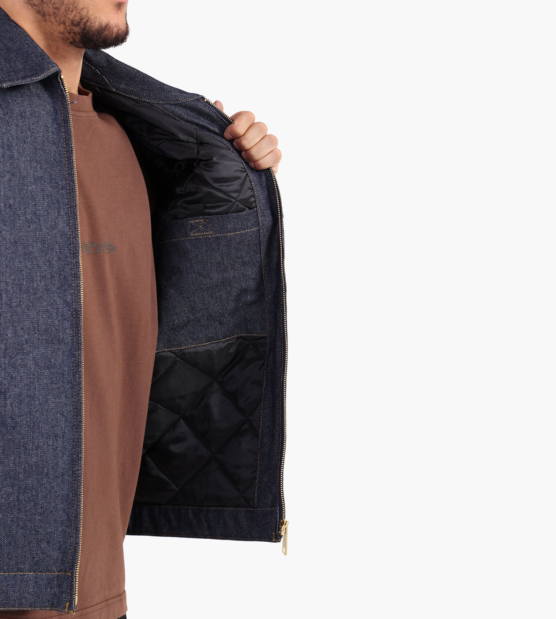 The Carhartt WIP OG Detroit Jacket in Denim Blue Rigid is crafted from 13.5 oz 'Maitland' Denim, a heavyweight 100% cotton fabric prized for its durability. A diamond-quilted lining combines plush pile insulation in the body with nylon quilting in the sleeves, delivering warmth and comfort in equal measure. Triple-stitched seams and a corduroy top collar underscore its rugged heritage, while the front zip closure and zippered chest pocket add everyday functionality.