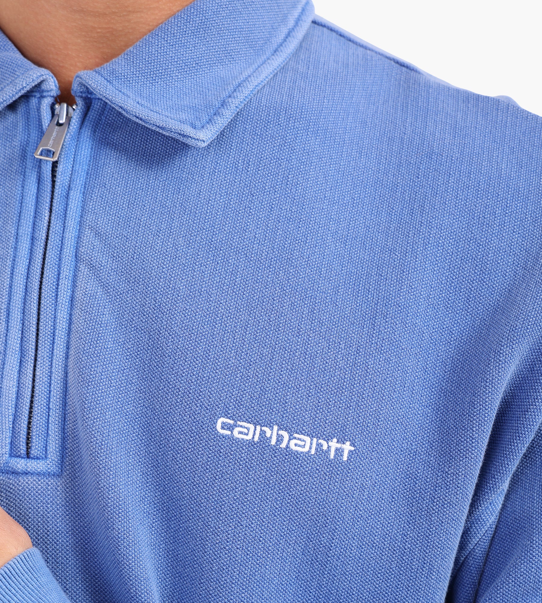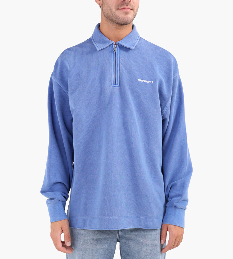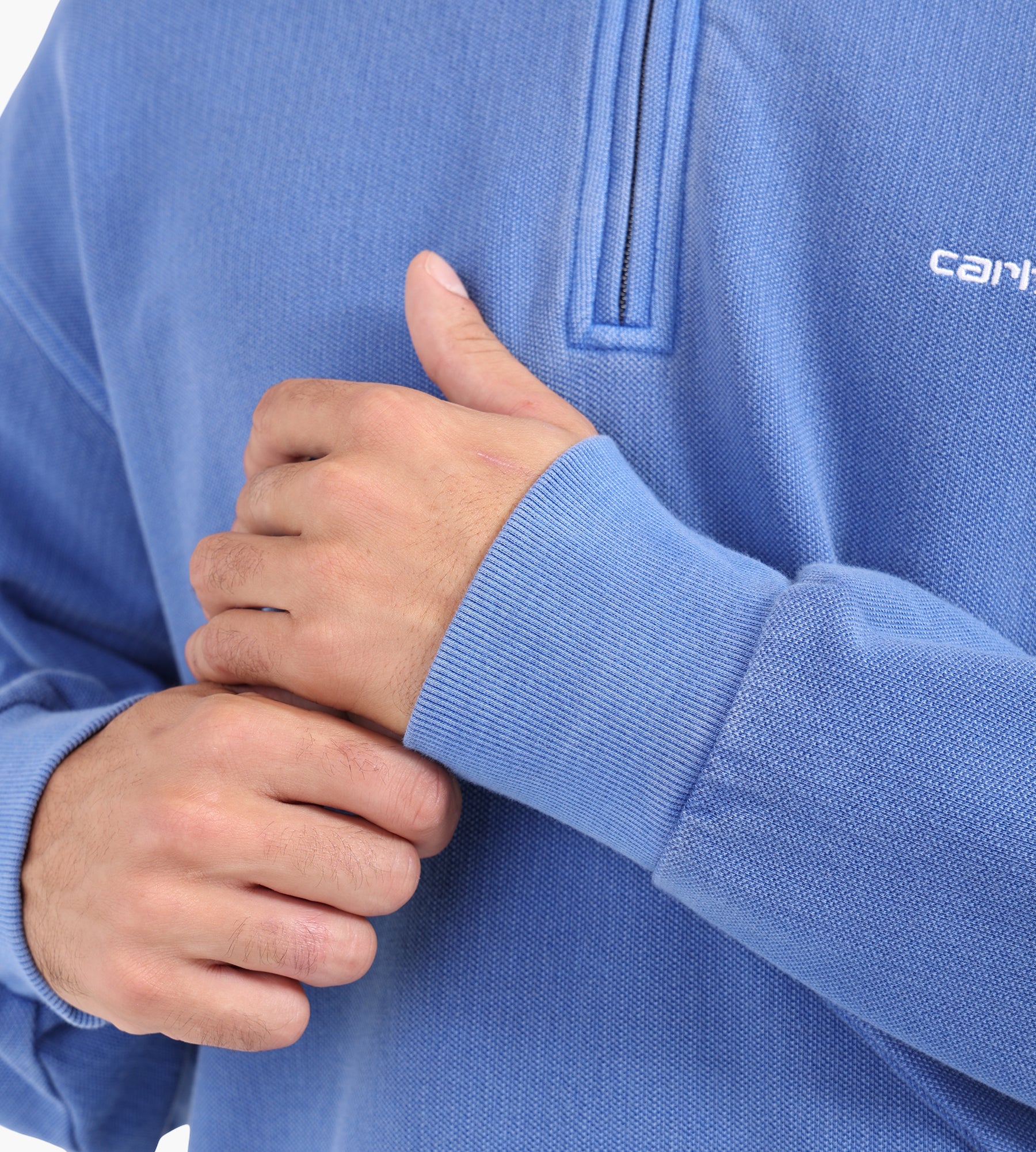 A zipped half placket and lower side slits enhance mobility and layering versatility, making it a practical choice for transitional weather. The embroidered Script Logo on the chest subtly nods to Carhartt WIP’s heritage, anchoring this piece as a refined take on the classic white crewneck sweatshirt.