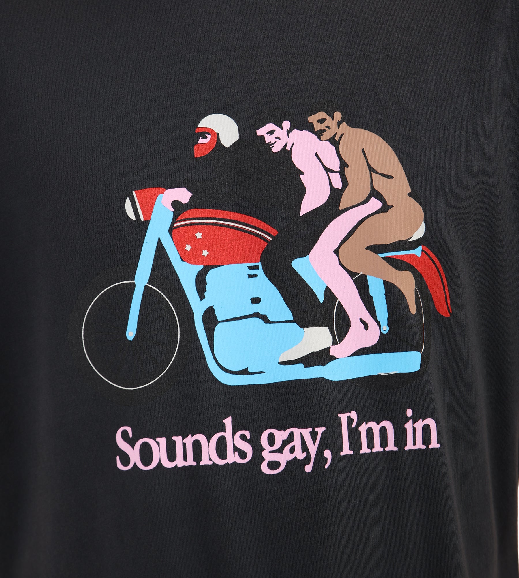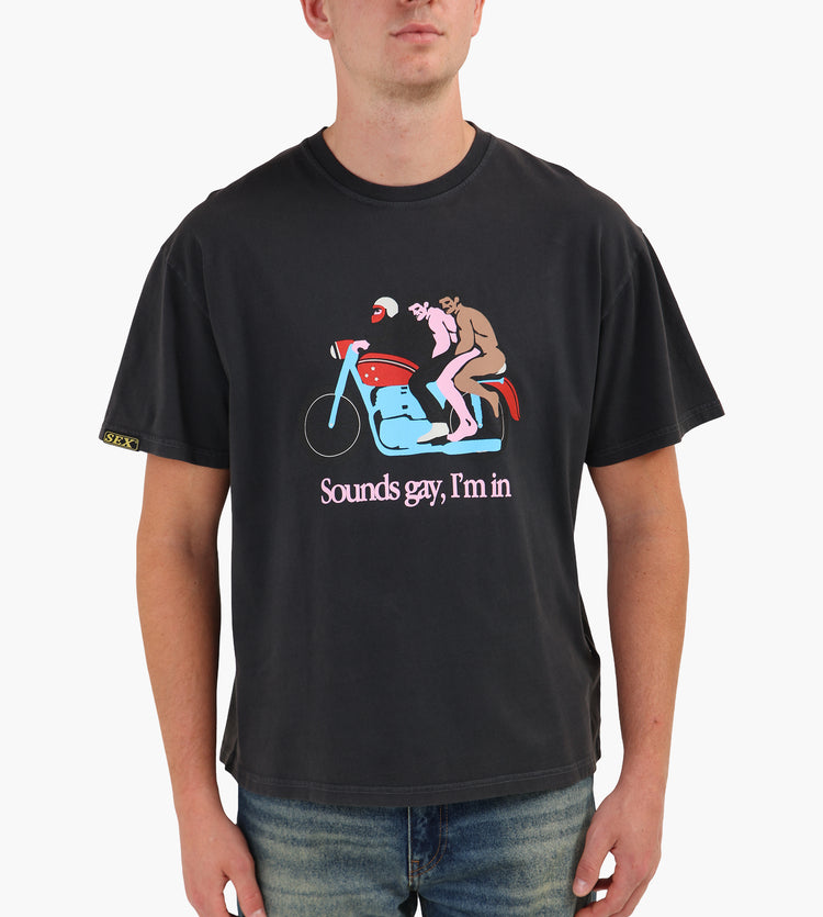 The Carne Bollente "Sounds Gay, We're In" T-Shirt in Off-Black is crafted from 100% organic cotton, delivering a soft yet durable feel. Its boxy fit and short sleeves lend a relaxed silhouette, while the bold front graphic print anchors the design with a playful nod to inclusivity and self-expression.