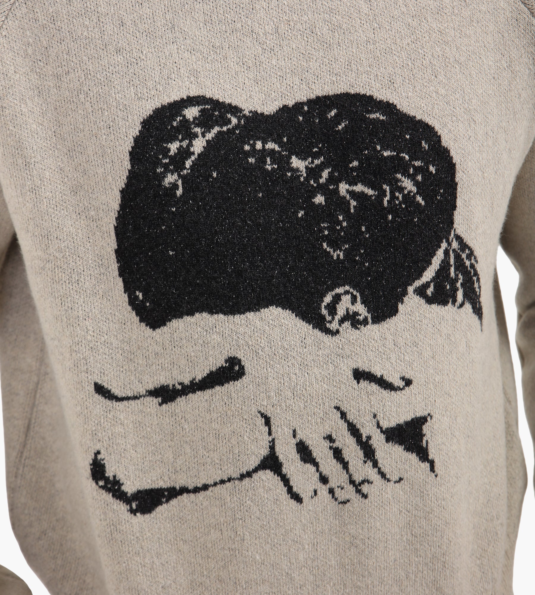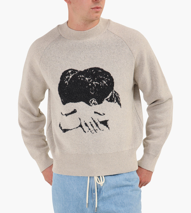 The Carne Bollente Your Warm Embrace Sweater in Beige combines 70% organic cotton and 30% recycled polyester for a soft, eco-conscious knit. Its bold, queer-inspired graphic knit design adds a distinctive edge, while ribbed cuffs and hem anchor the relaxed silhouette with structured details.