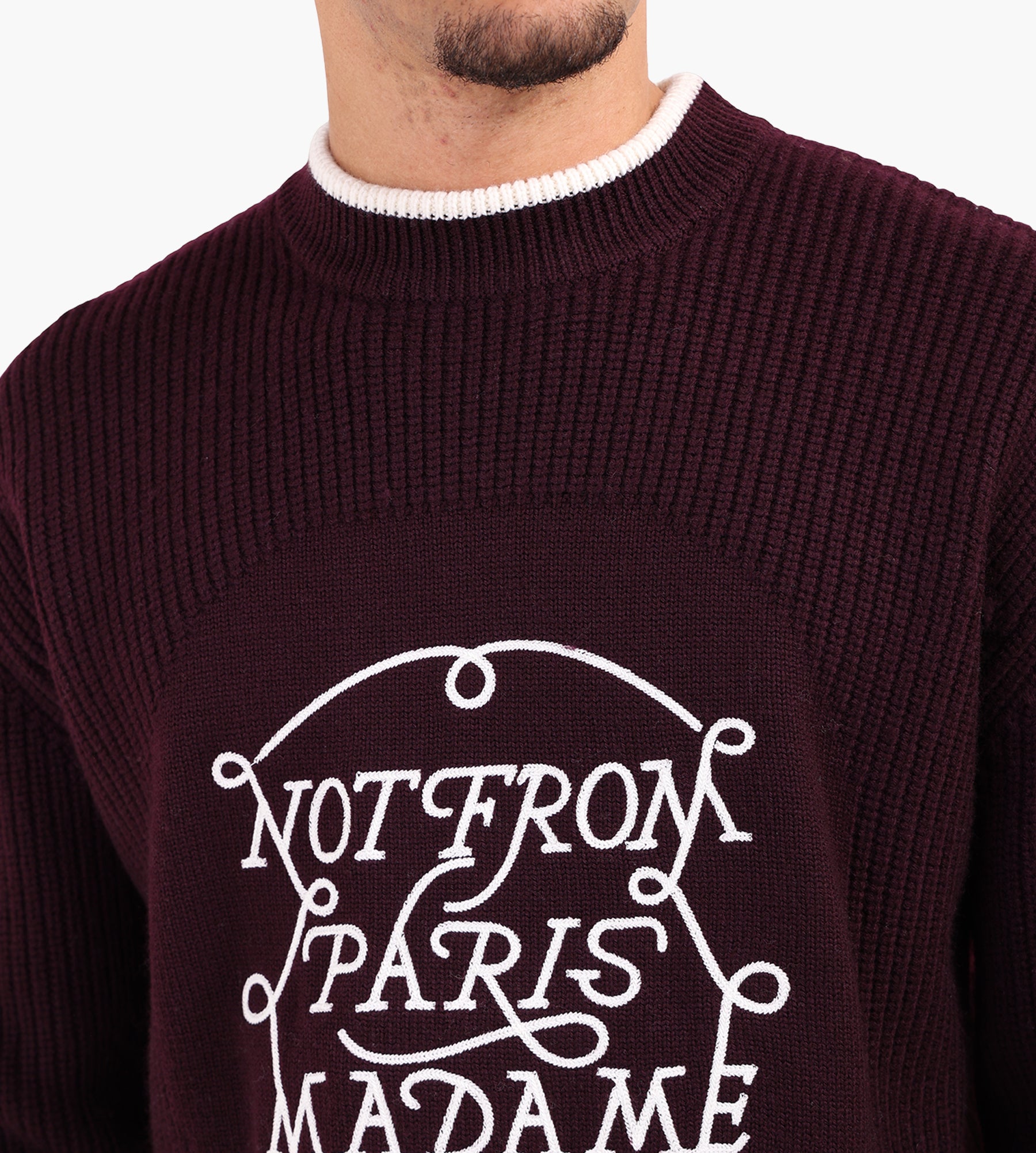 The Drôle de Monsieur La Maille Jacquard Groom sweater in Off White is crafted from 100% merino wool, offering a soft, breathable layer with natural temperature regulation. Its round collar design is elevated by a jersey yoke adorned with subtle "Groom" embroidery, adding a refined touch to the loose-fit silhouette.