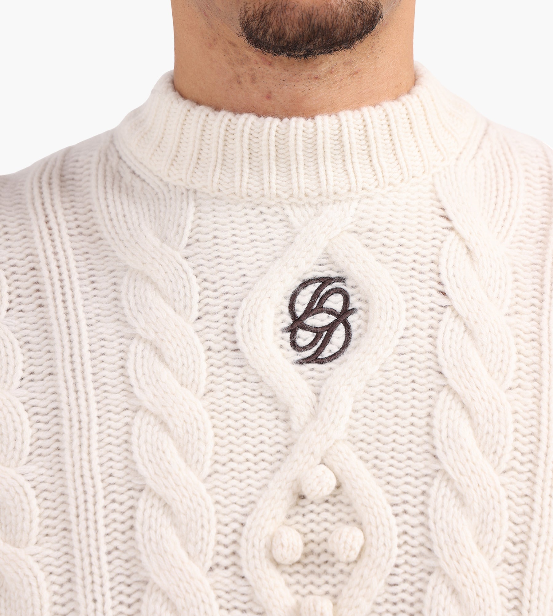 The Drôle de Monsieur Off-White 'La Maille Torsade' Sweater is crafted from 100% merino wool, offering a luxurious softness and natural breathability. Its cream hue complements the intricate cable-knit pattern, which adds texture and depth to the timeless silhouette. Rib-knit detailing at the crewneck, cuffs, and hem ensures a clean, polished finish.