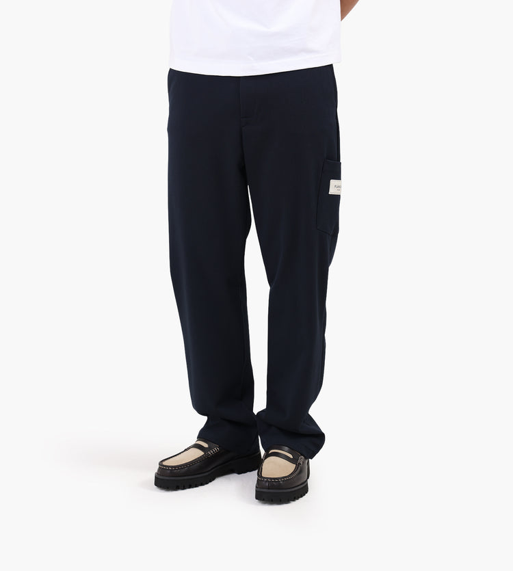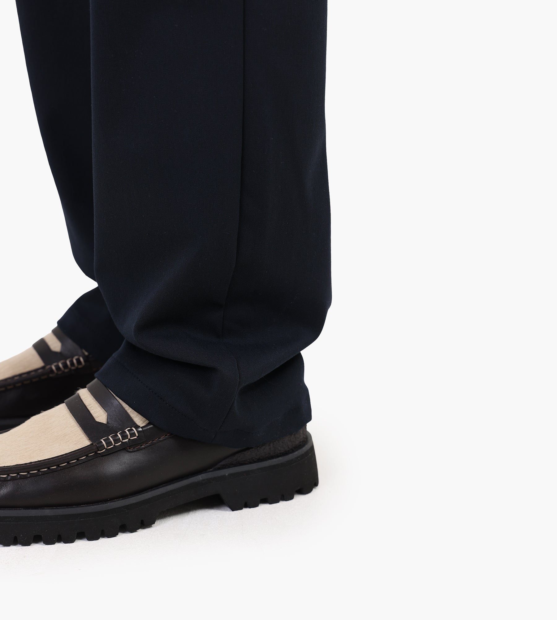 Flâneur Atelier Tailored Trousers in Navy are meticulously crafted to deliver a refined silhouette. The deep navy hue and precise tailoring create a clean, streamlined aesthetic, ideal for elevated everyday wear. Thoughtfully designed seams and a structured drape underscore their timeless versatility.