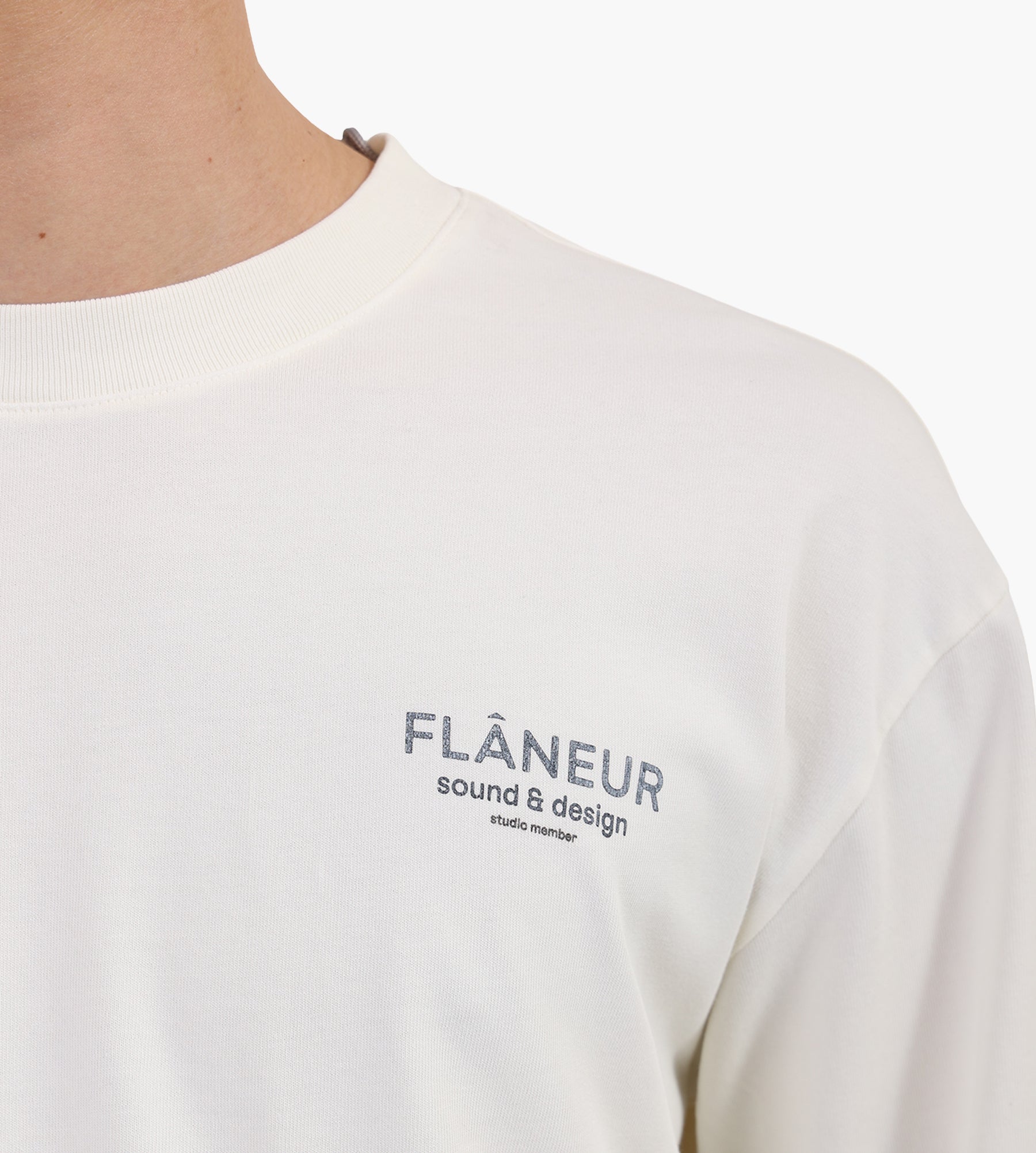 The Flâneur Sound Design Long Sleeve Shirt in Washed White is crafted from a soft, mid-weight cotton jersey, offering a breathable yet substantial feel. Its washed treatment lends a subtle texture and lived-in character, while the clean silhouette anchors its versatility for layering or standalone wear.