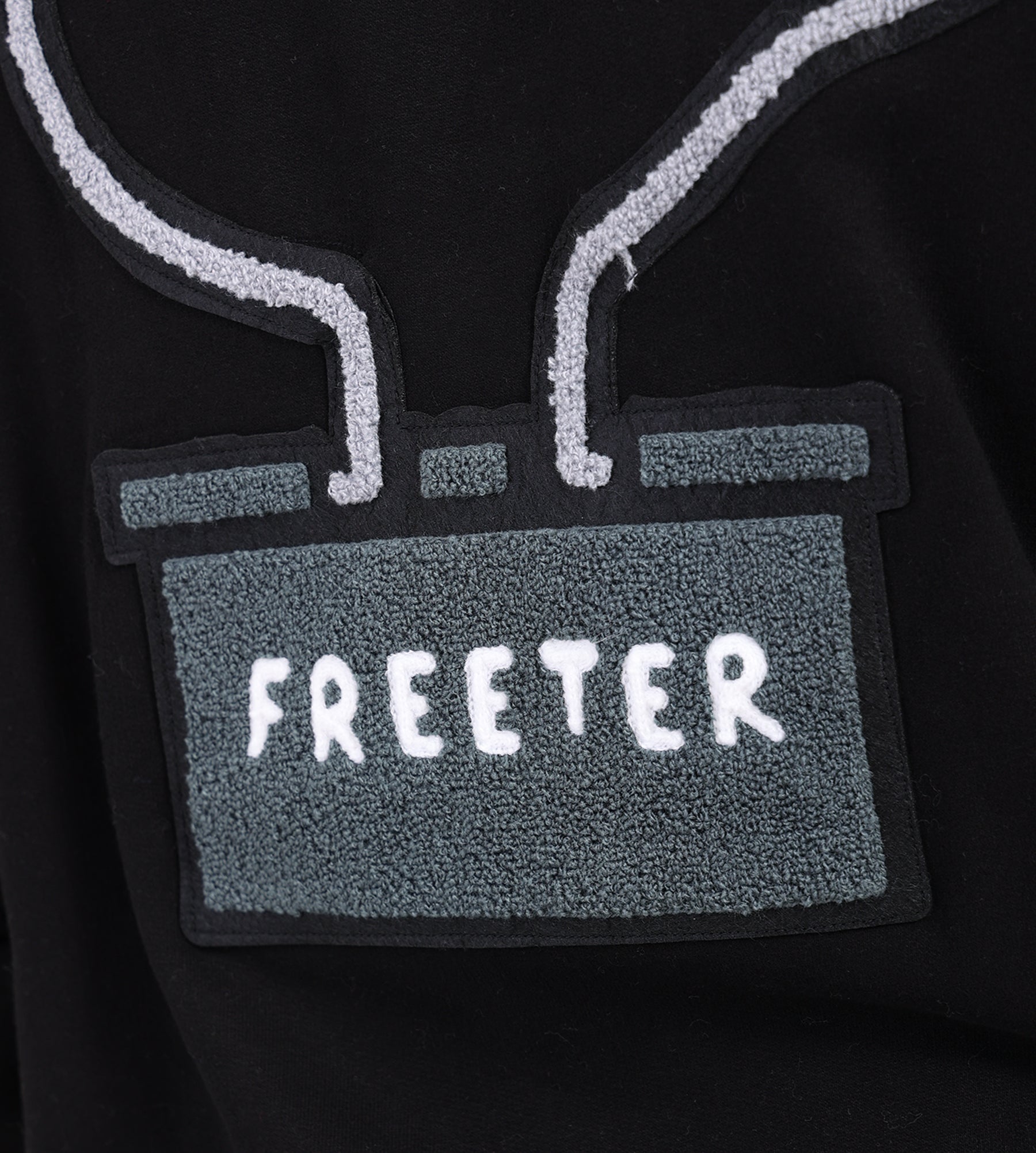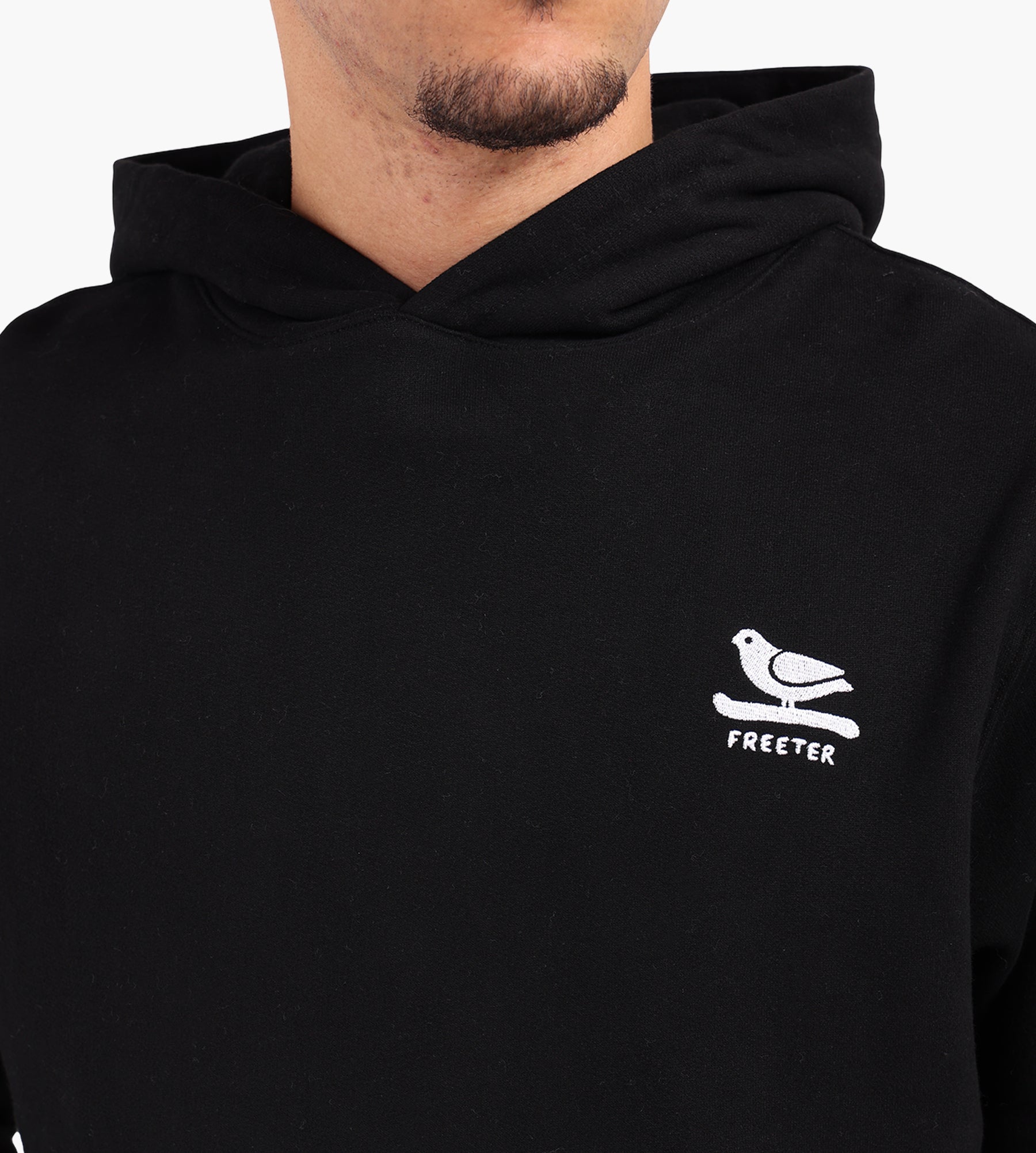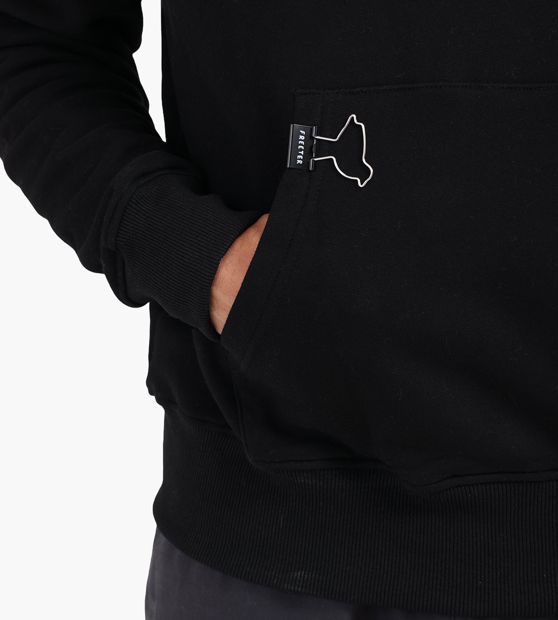 The Freeter Clip Hoodie in Black is crafted from a premium cotton blend, offering a soft yet resilient feel for everyday wear. The minimalist silhouette is elevated by a unique clip closure at the neckline, blending form with function for a contemporary edge.