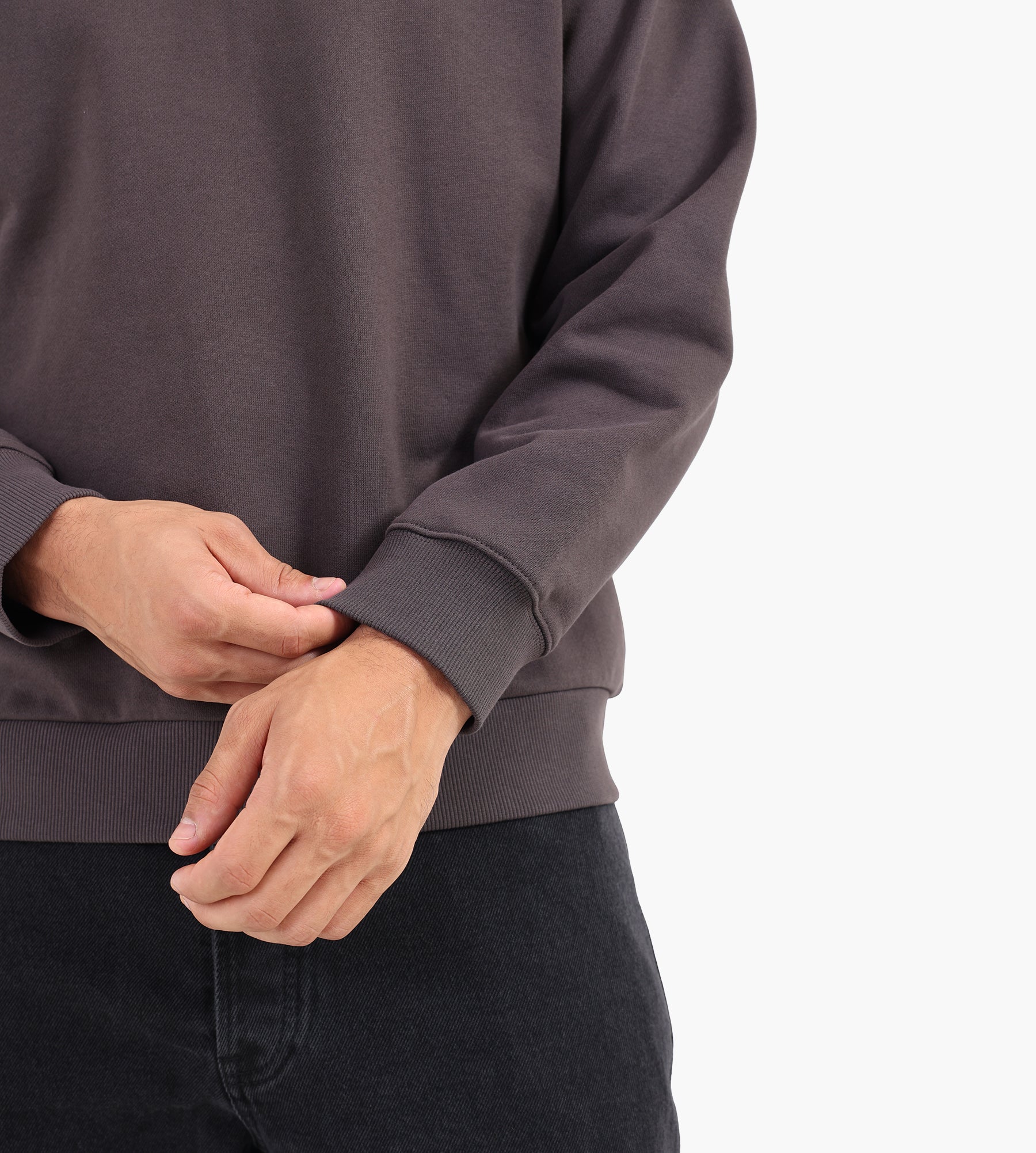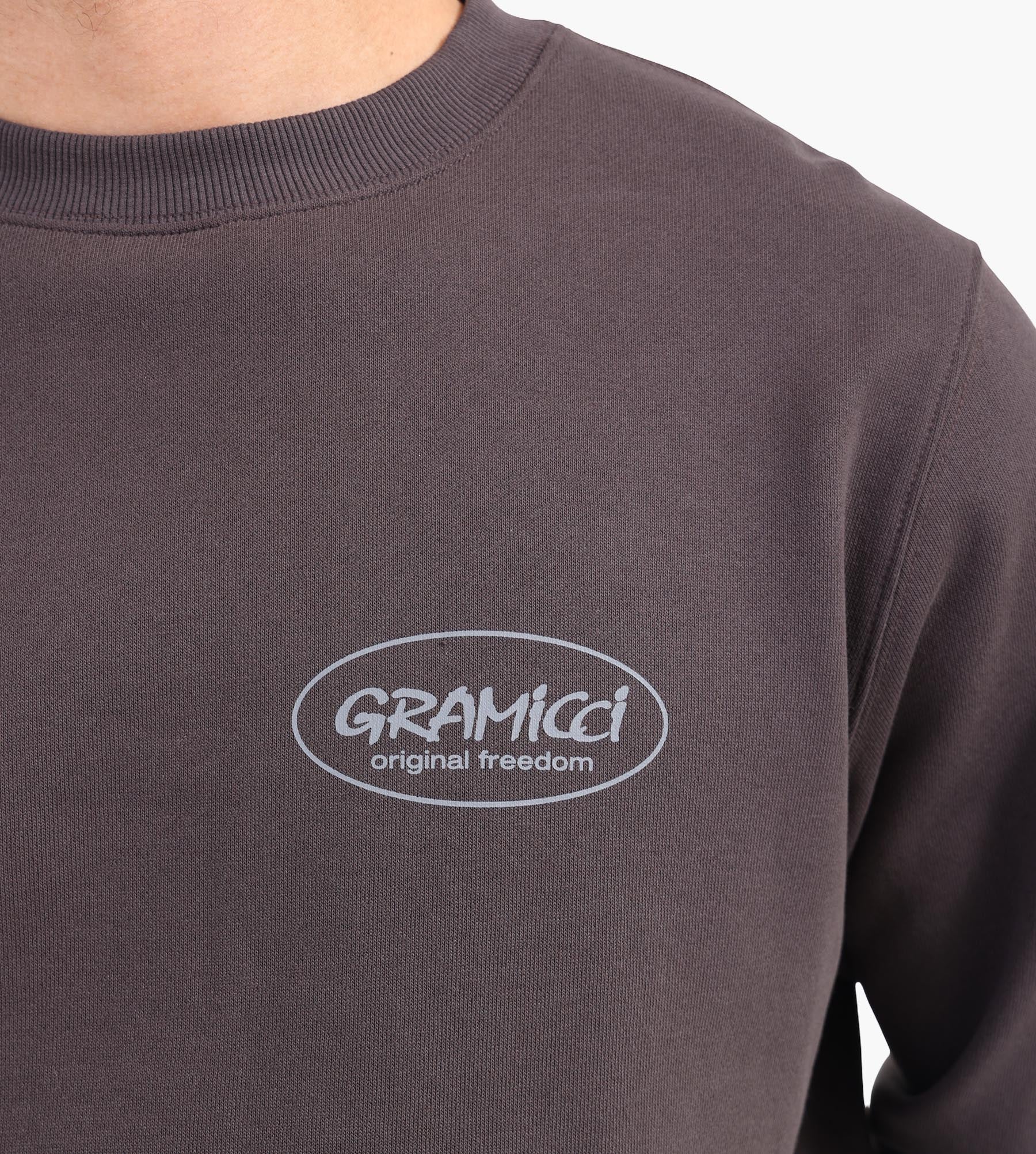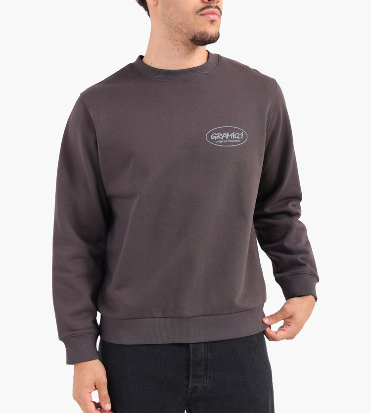 The Gramicci Original Freedom Sweatshirt in Deep Brown is crafted from an 87% cotton and 13% polyester blend, delivering a balance of softness and durability. Its fleeceback jersey construction enhances warmth, while the brushed interior adds a layer of comfort against the skin. A classic crew neck design anchors the piece, complemented by ribbed cuffs and hem for a secure fit.