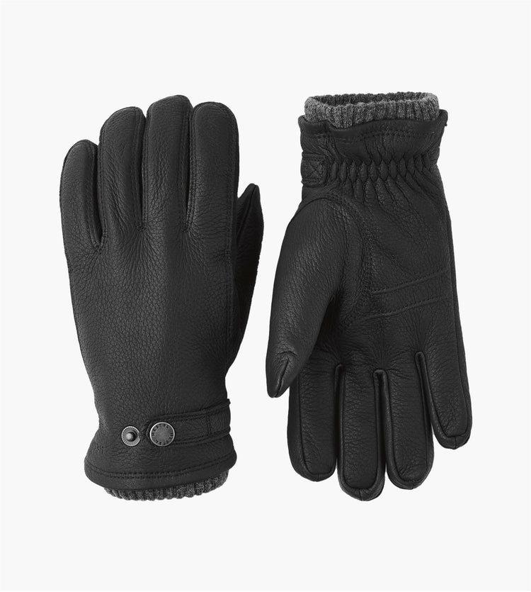 The Hestra Utsjo Glove in Black is crafted from Nordic elk leather, prized for its supple texture and natural grain. PrimaLoft polyester insulation delivers breathable warmth and water resistance, while a fleece lining traps heat, wicks away moisture, and dries quickly for all-day comfort. The half-pique construction with an overlapped backhand enhances freedom of movement, and an inseam palm finish provides a clean, refined appearance.