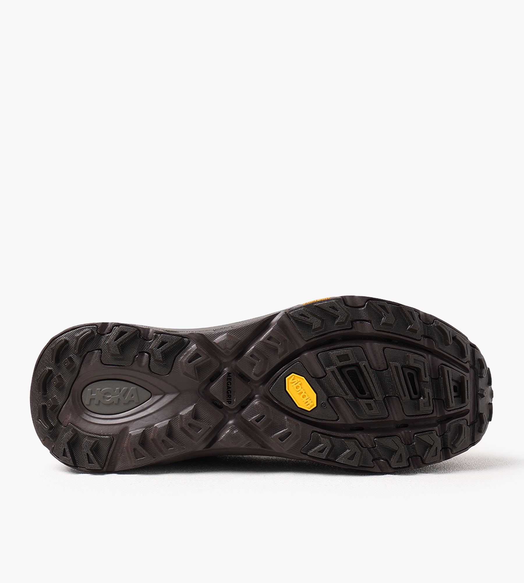 The HOKA Mafate Speed 2 Sneakers in Asphalt Gray/Walnut are engineered for technical terrain, combining a lightweight no-sew SpeedFrame upper with durable ripstop nylon. An external monomesh debris screen shields against trail hazards, while the TPU heel counter enhances stability during uneven strides. Vibram® Megagrip outsoles with 5mm tread deliver exceptional traction, adapting seamlessly to varied surfaces.