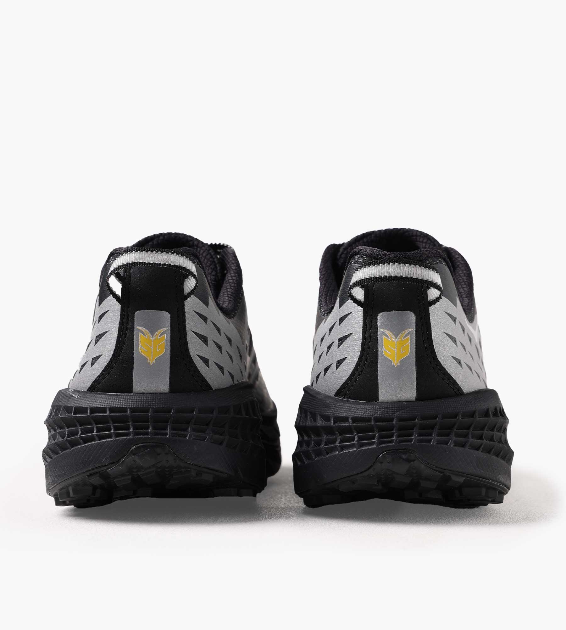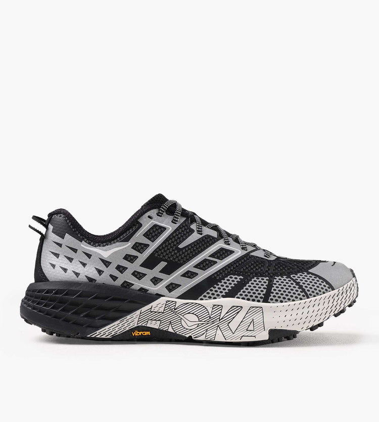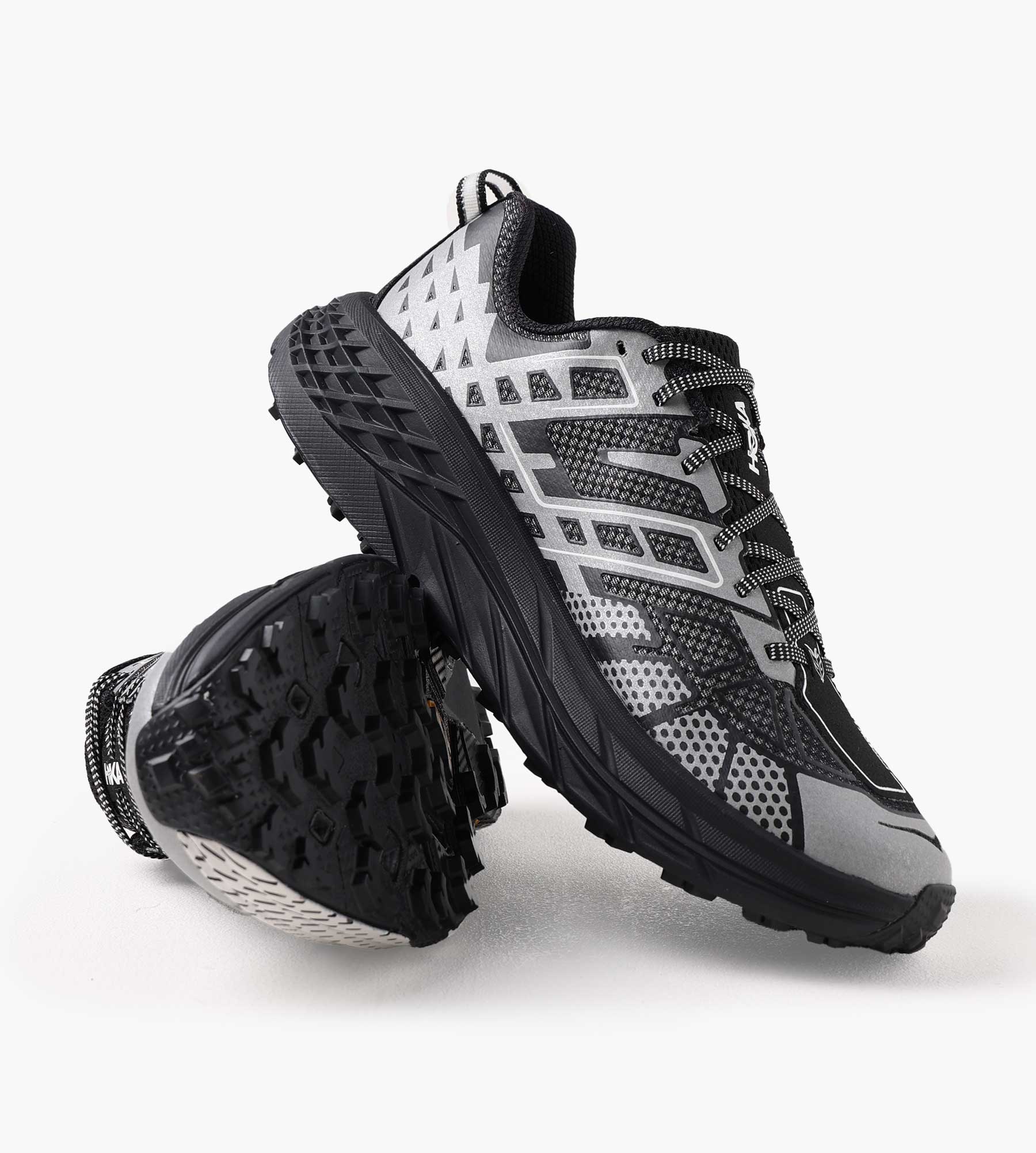 The Hoka Speedgoat 2 TS in Black/Stardust merges trail-ready engineering with everyday versatility. Its upper, crafted from engineered mesh and reinforced with rubberized overlays, balances breathability and durability. Reflective webbing and a midfoot support cage enhance visibility and stability, ensuring confidence on rugged paths and urban streets alike.