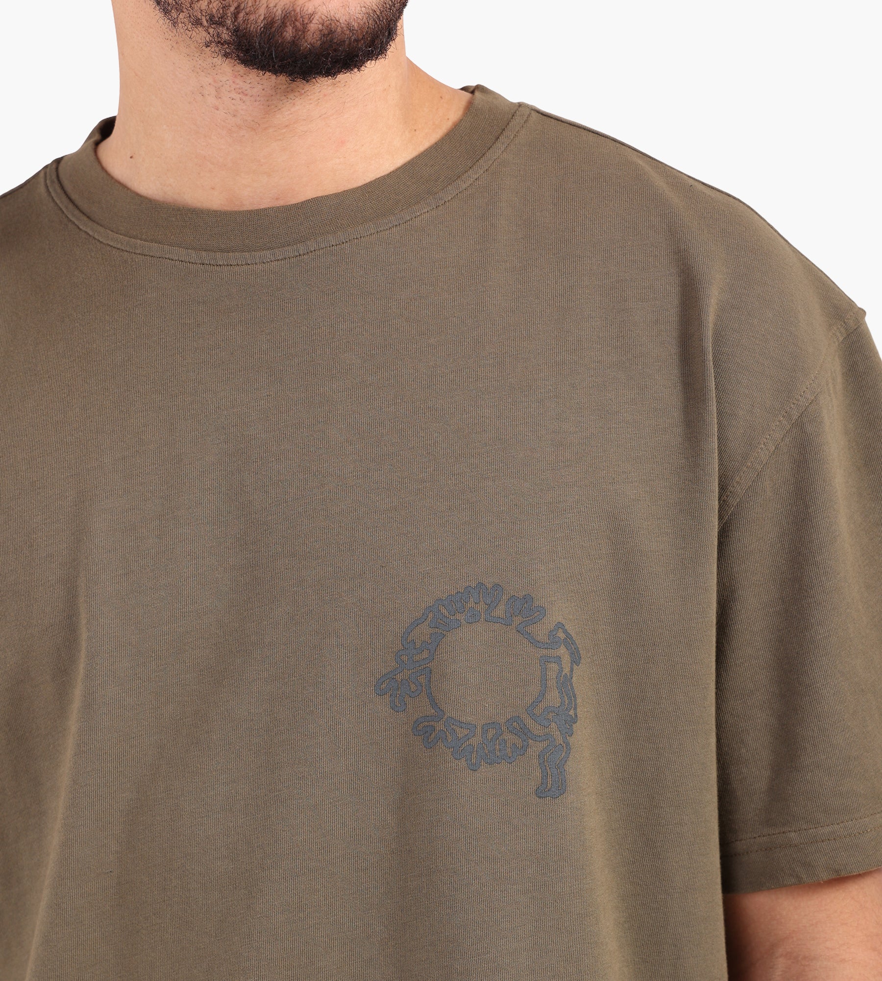 The KA_YO Boxy Graphic Tee in Mole is crafted from premium cotton, offering a soft, breathable foundation with a structured drape. Its muted Mole colorway complements the minimalist design, while the bold graphic print anchors the piece with a contemporary edge.