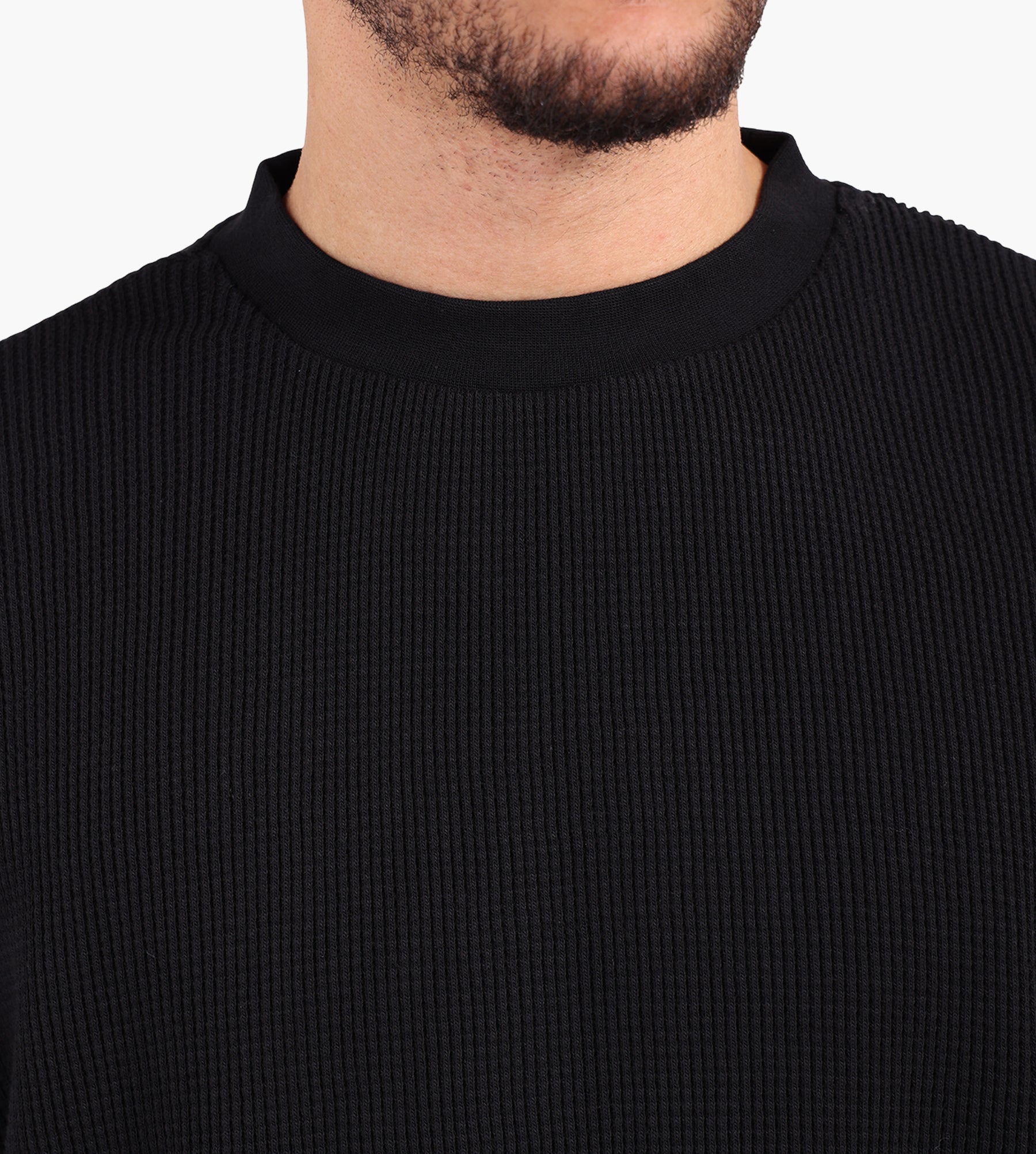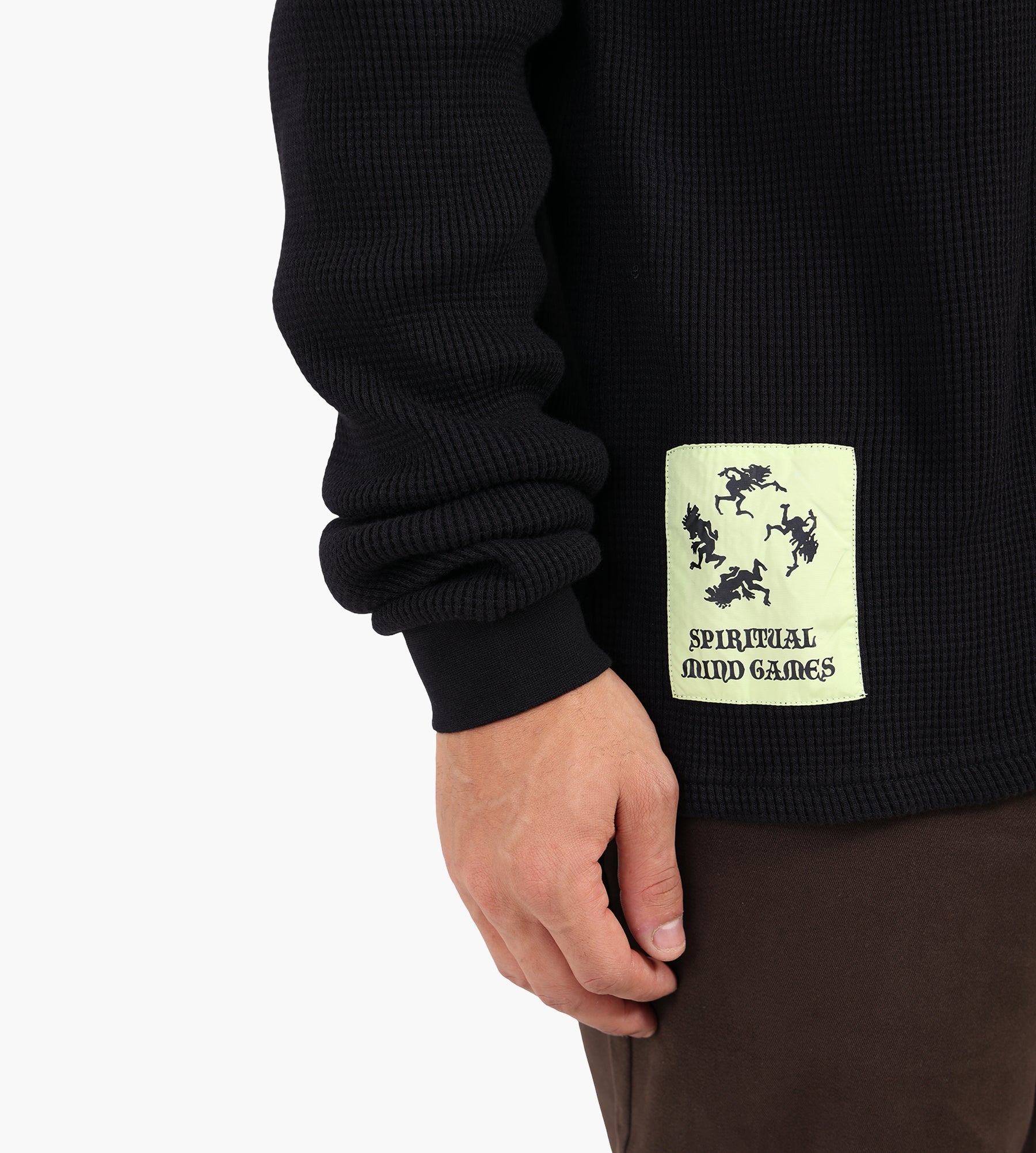 The KA_YO Waffle Thermal Sweater in Black is crafted from a textured waffle-knit fabric, balancing warmth and breathability. Its midweight construction ensures reliable insulation while maintaining a soft, flexible feel that adapts to daily wear. A classic crew neckline and streamlined silhouette elevate its understated aesthetic.