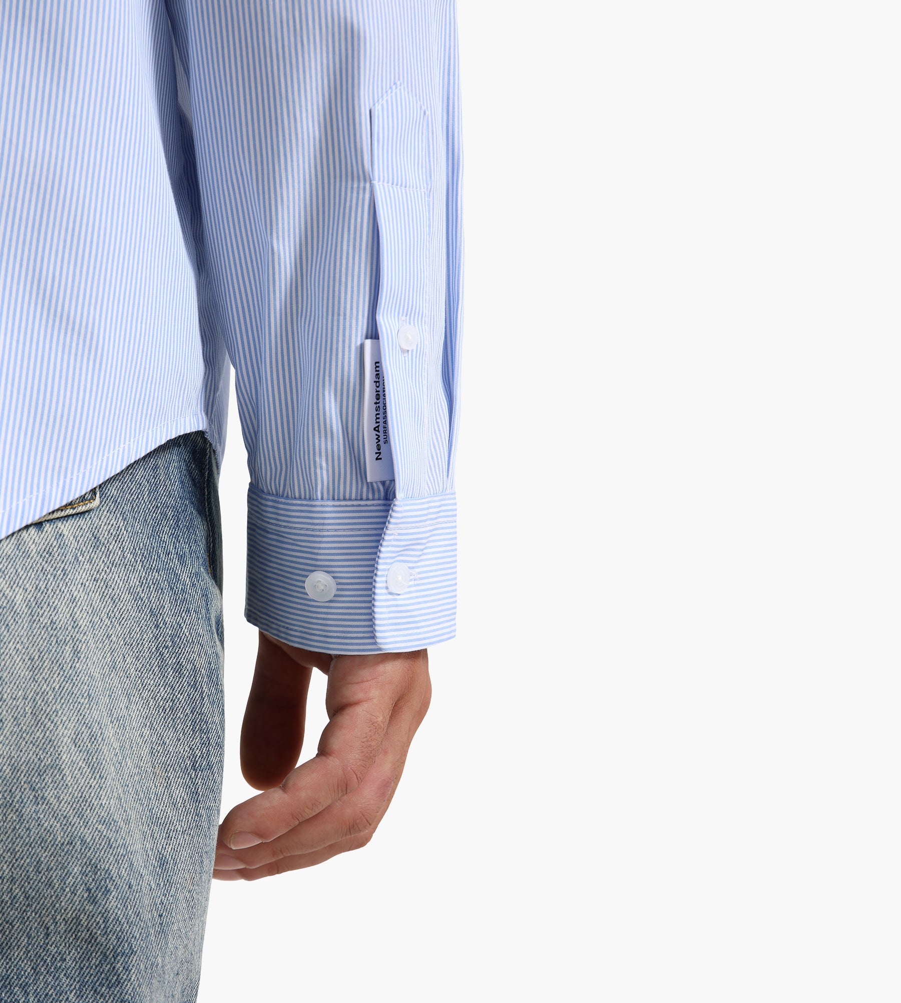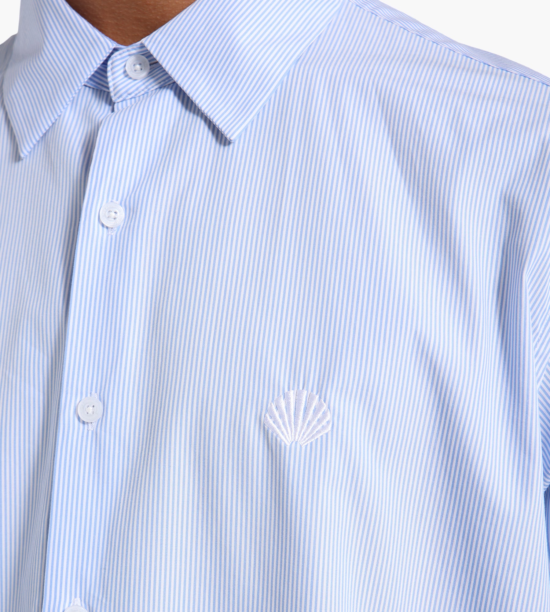 The New Amsterdam Surf Association Beach Shirt in Blue/White is crafted from 100% cotton poplin, offering a lightweight and breathable layer for sun-soaked days. Its timeless stripe pattern evokes coastal ease, while the button-up closure and small embroidered shell detail at the chest add understated refinement. Designed for versatility, this piece transitions effortlessly from beachside relaxation to casual city outings.