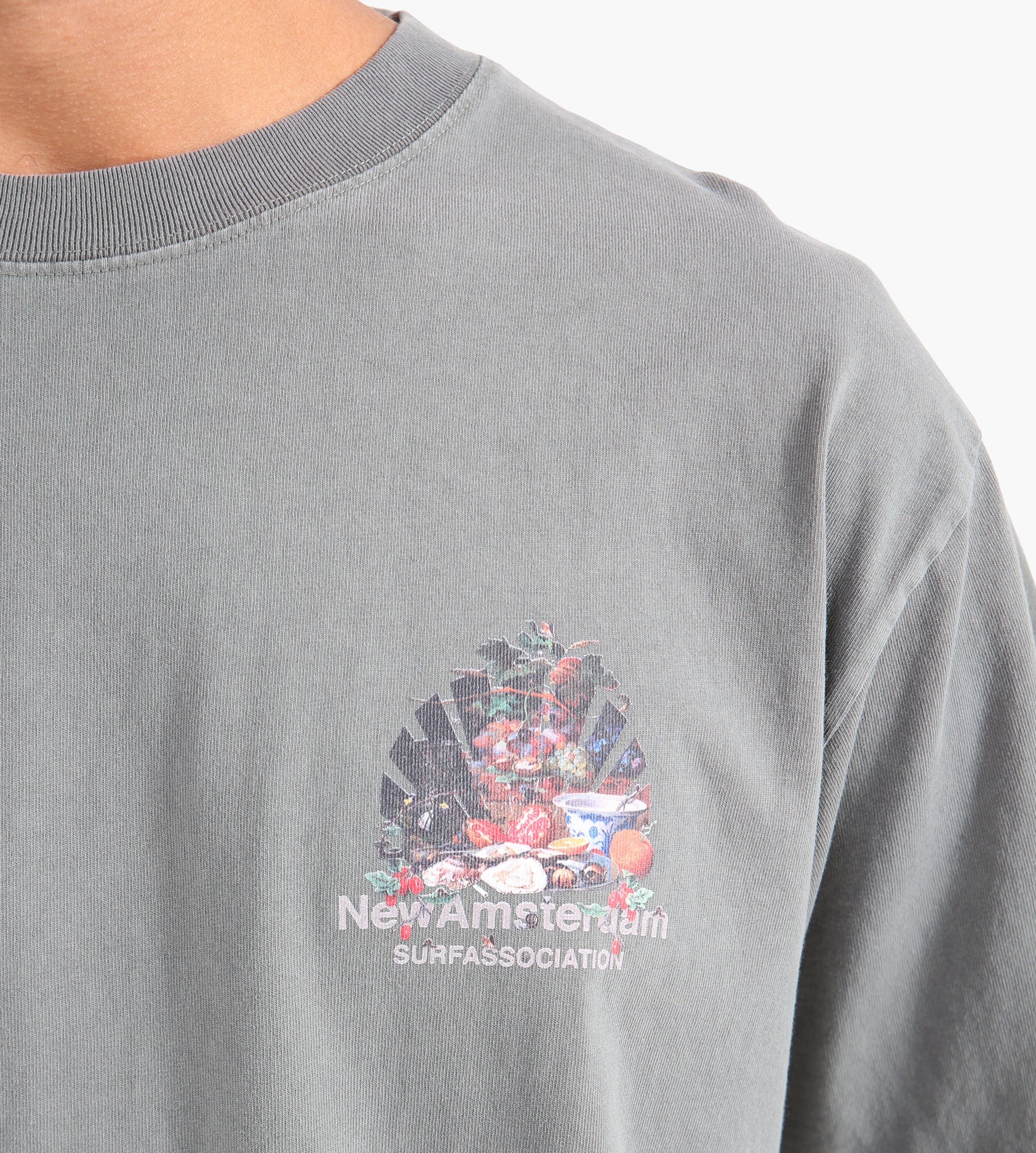 The New Amsterdam Surf Association Buffet Tee in Shark Green is crafted from 100% cotton OE jersey, offering a soft yet substantial feel with its 240 GSM fabric weight. Fabric-dyed for lasting vibrancy, the material ensures durability while maintaining a breathable, comfortable wear. A ribbed crew neck anchors the design, blending structure with a laid-back silhouette.