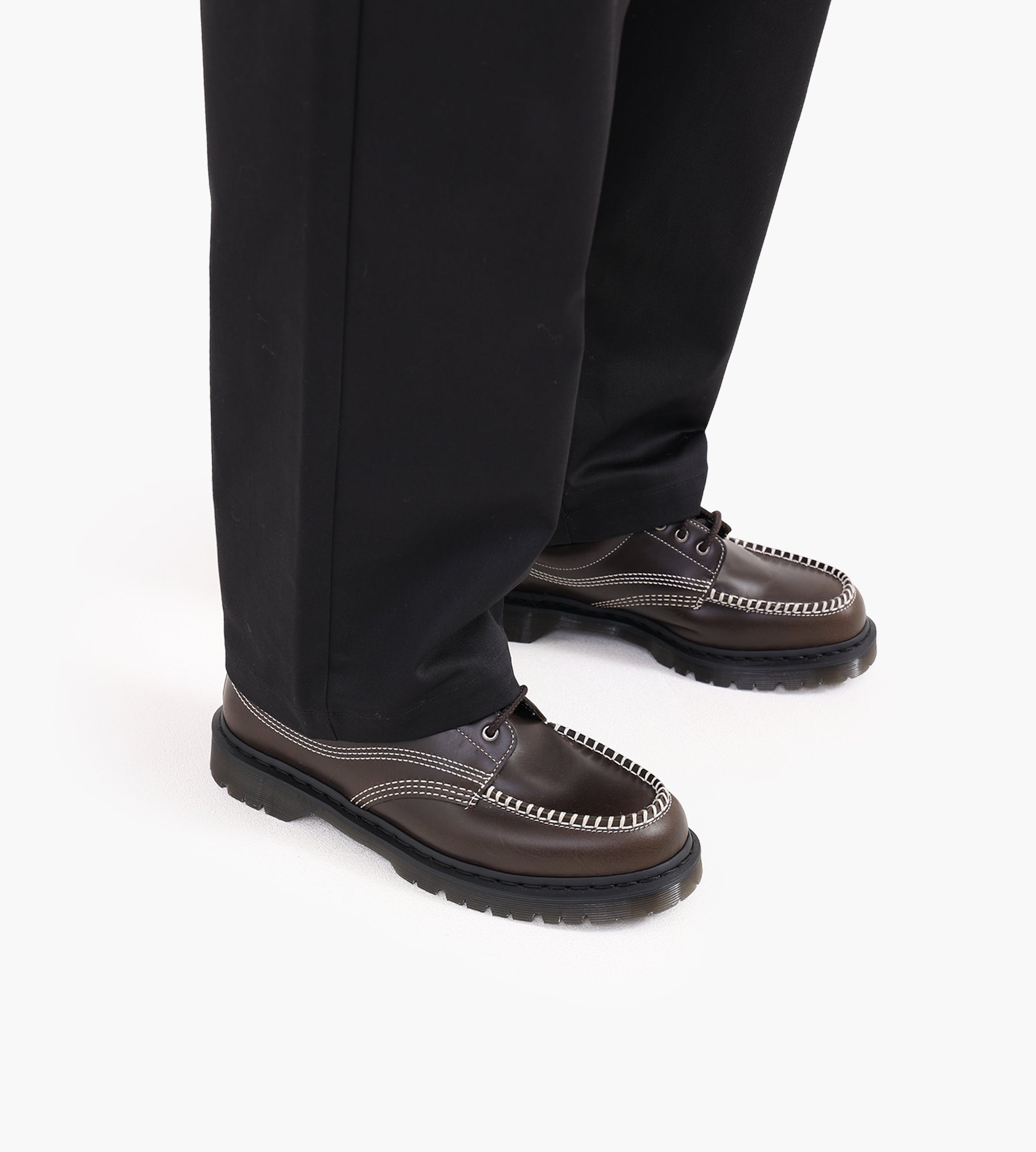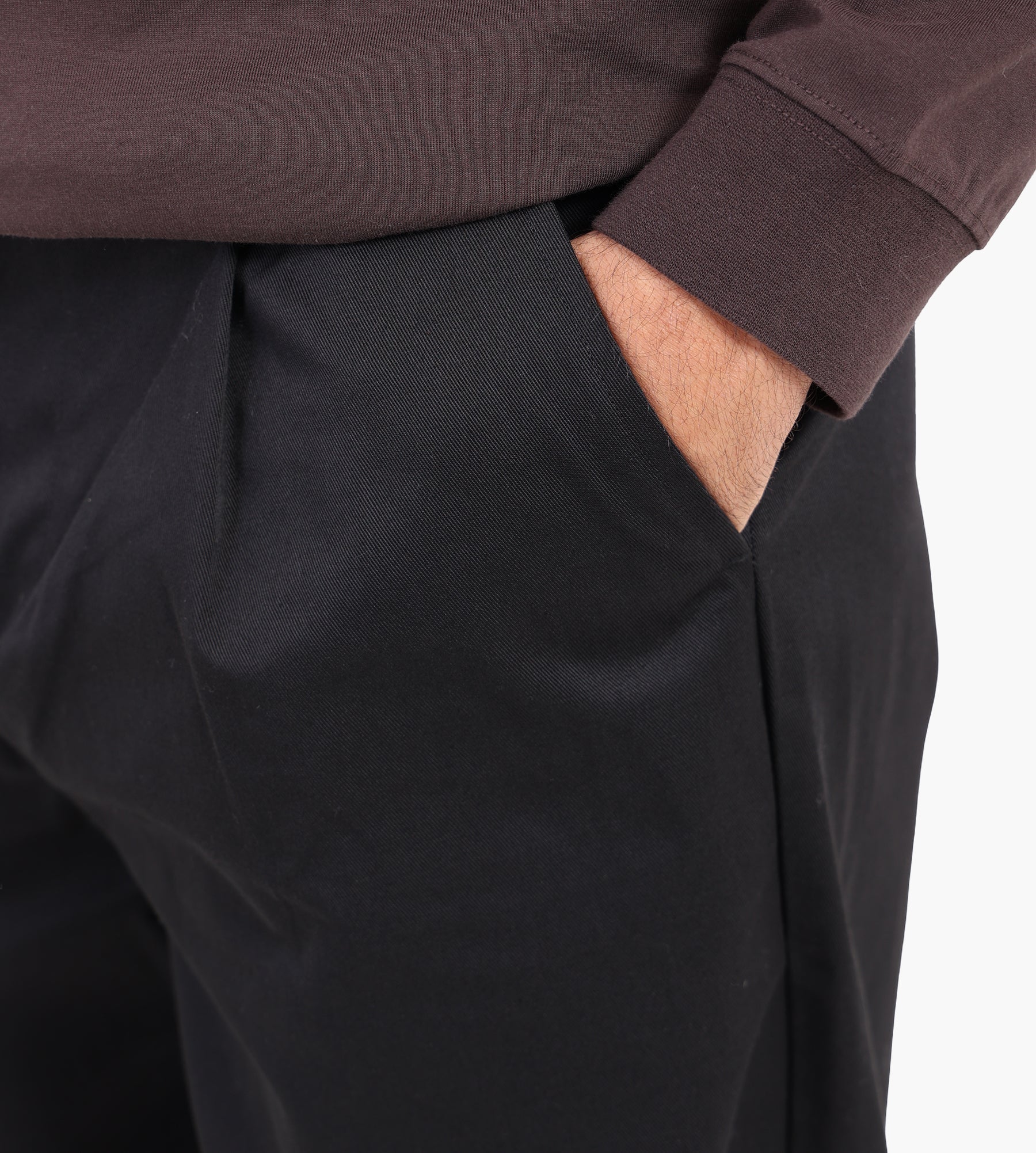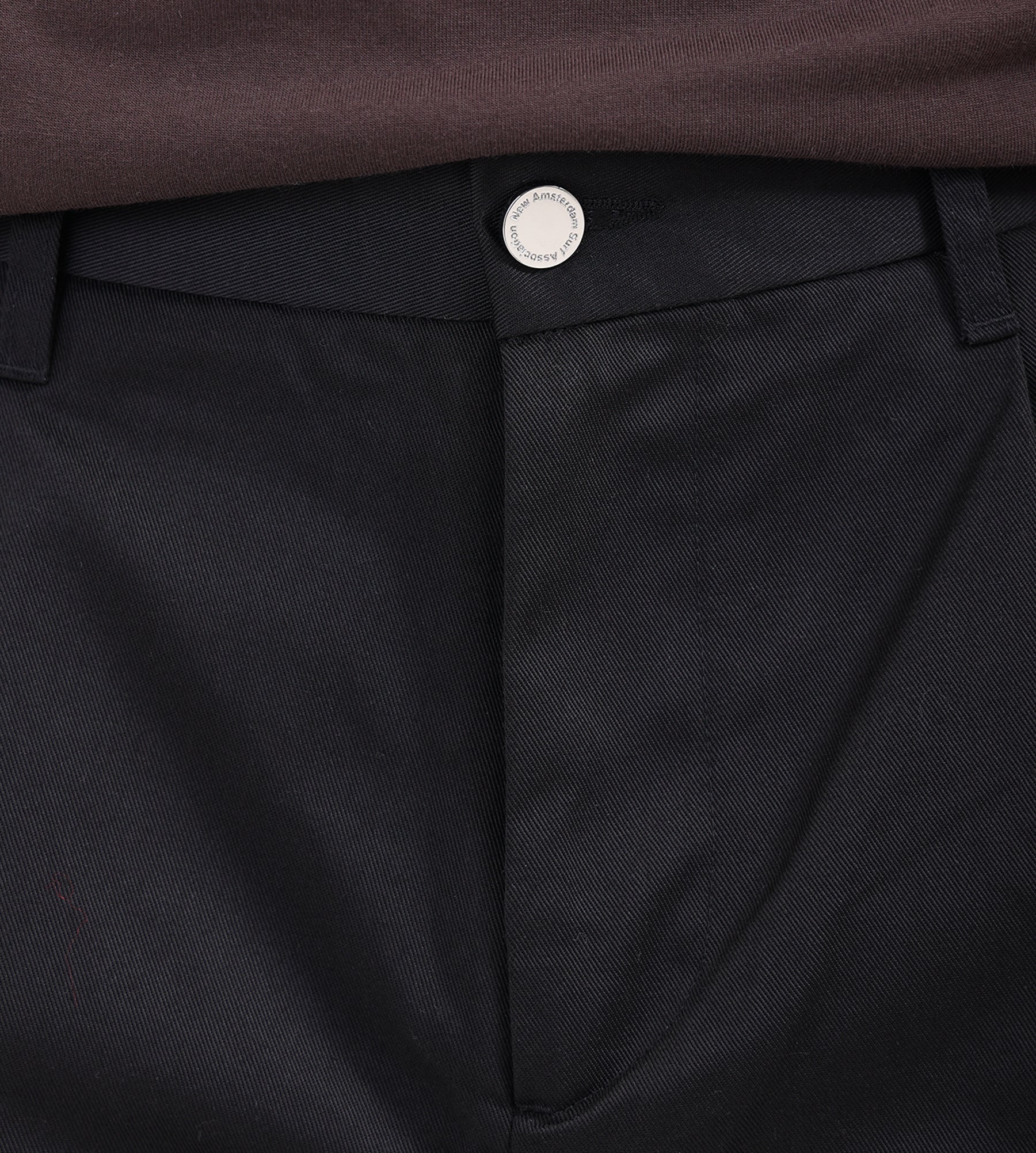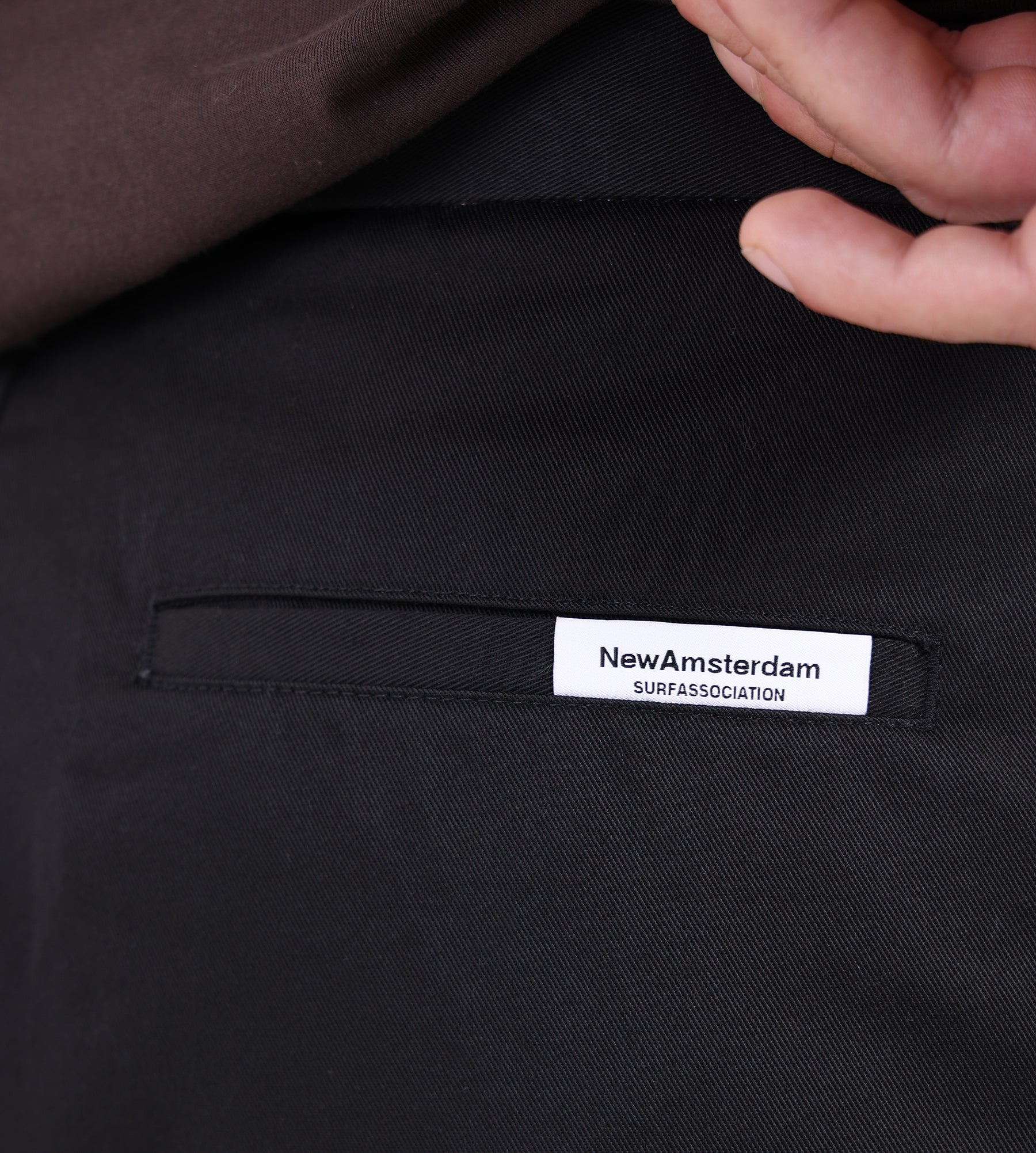 The New Amsterdam Surf Association Reworked Trousers in Black are crafted from a durable blend of 65% polyester and 35% cotton, offering a balance of structure and comfort. Slanted front pockets and two back pockets provide practical storage, while front pleats and a metal D-ring lend subtle utility-inspired touches. The woven "New Amsterdam" label and inside waistband featuring the NASA logo underscore the brand’s attention to detail.