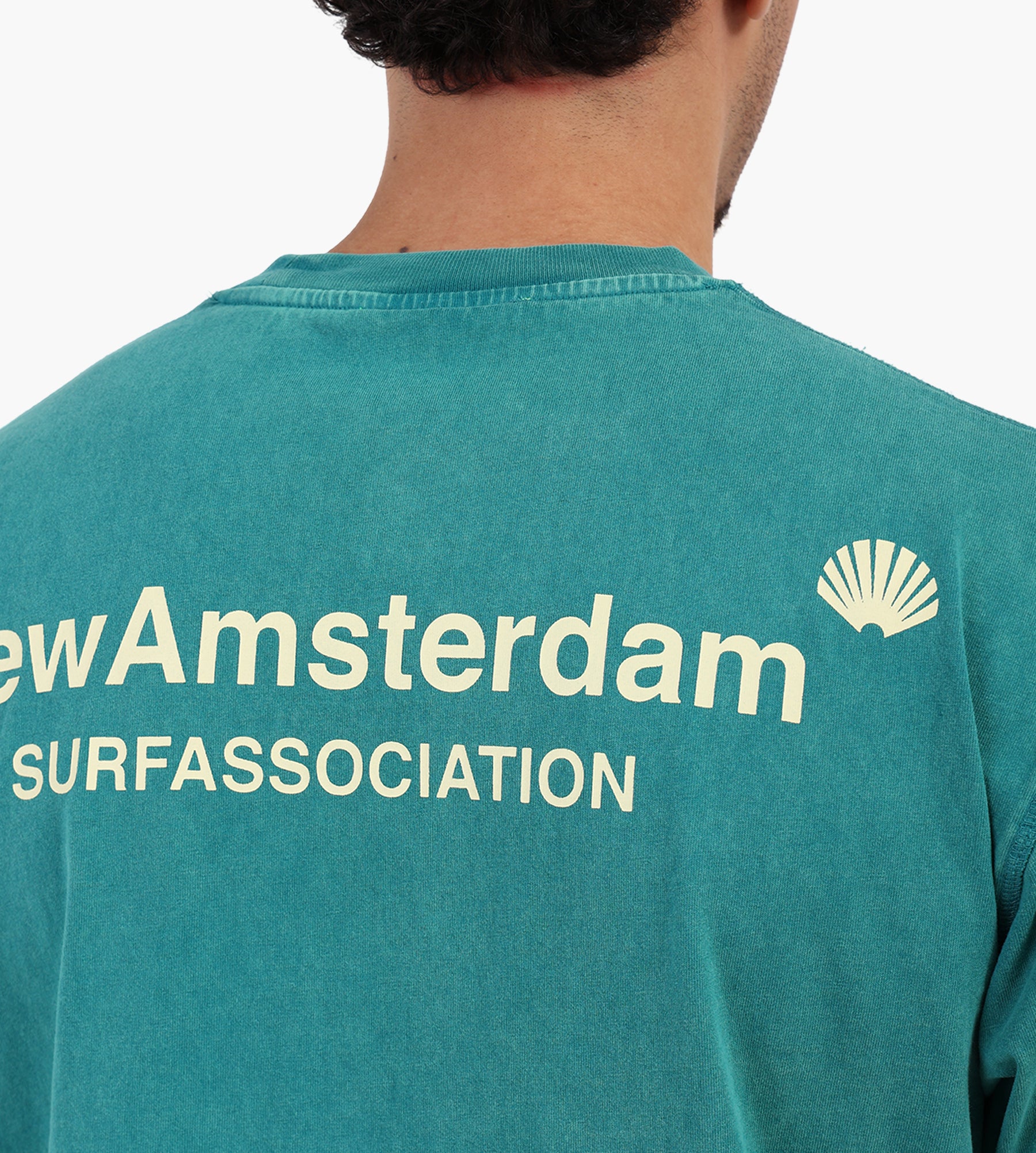 The New Amsterdam Surf Association Logo Tee in Sea Green/Butter Yellow is crafted from 100% cotton jersey with a substantial 240 GSM weight, offering a soft yet durable hand. A ribbed crew neck anchors the design, while the brand’s logo and name are screen printed on both the front and back for a bold, graphic statement.