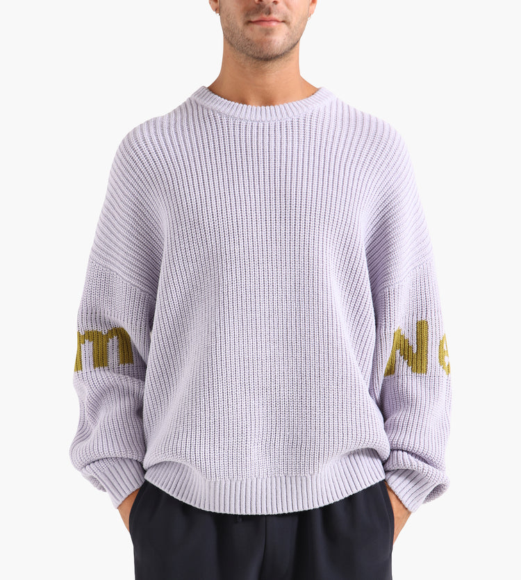 The New Amsterdam Surf Association Name Crew Knit in Sea Fog/Moss is crafted from 100% acrylic, offering a soft yet durable texture with a lightweight feel. This oversized crew neck sweater is designed with a relaxed silhouette, making it a versatile layer for transitional weather. Subtle branding details, including the logo on the back and sleeves, reinforce the label's understated coastal aesthetic.