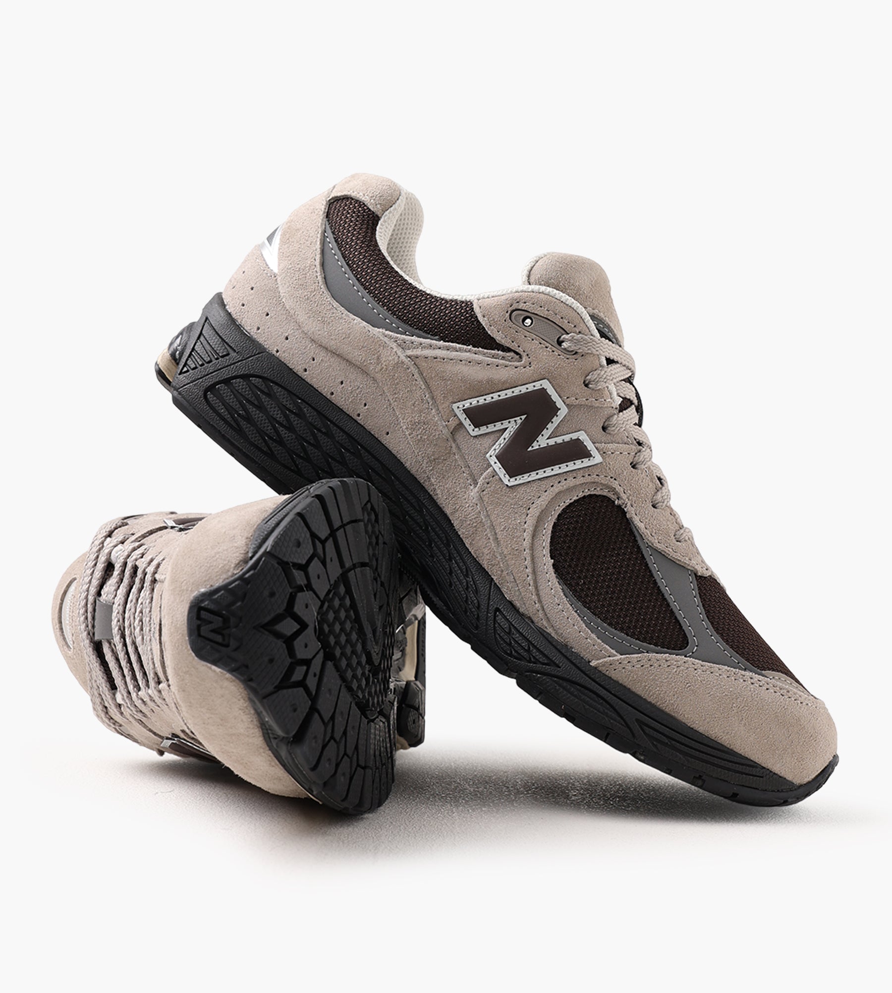 The New Balance 2002R in Arid Stone combines smooth leather and suede for a tactile upper, accented by deconstructed elements like ripped edges and an exposed foam tongue. These intentional design choices lend a raw, vintage-inspired aesthetic, while the prominent 'N' logo anchors the sneaker to the brand's legacy.