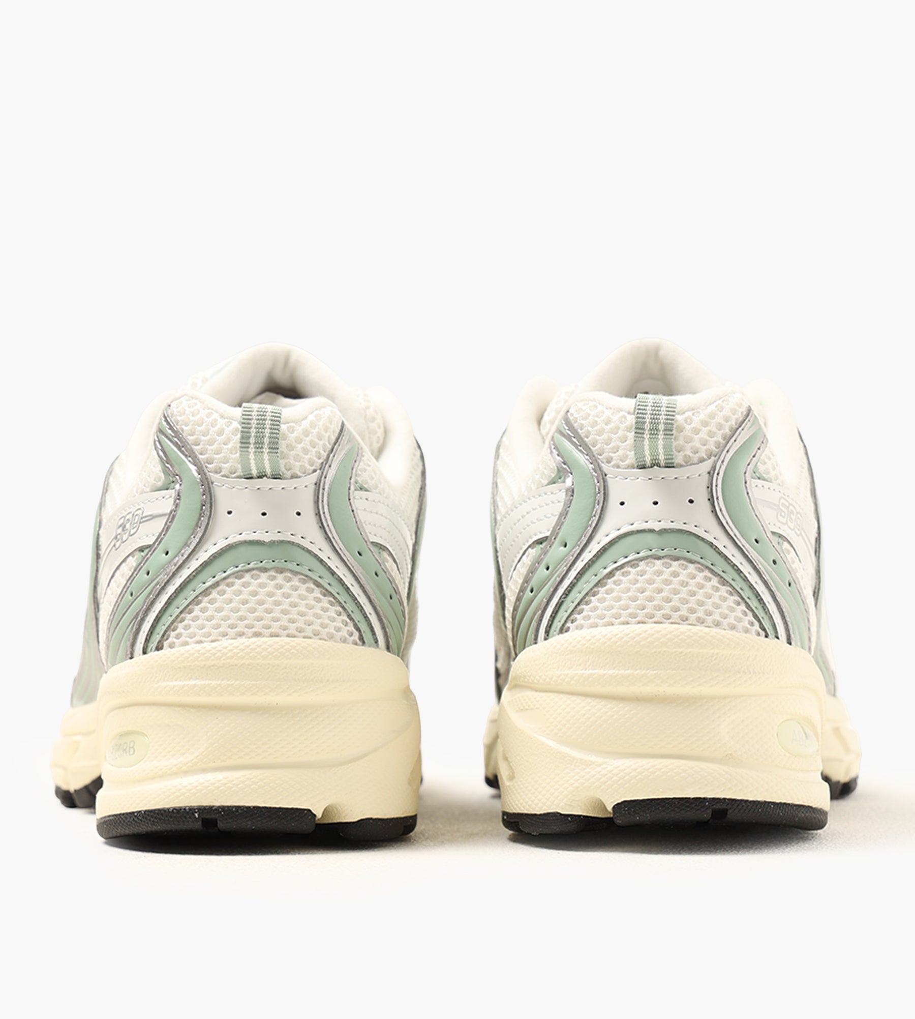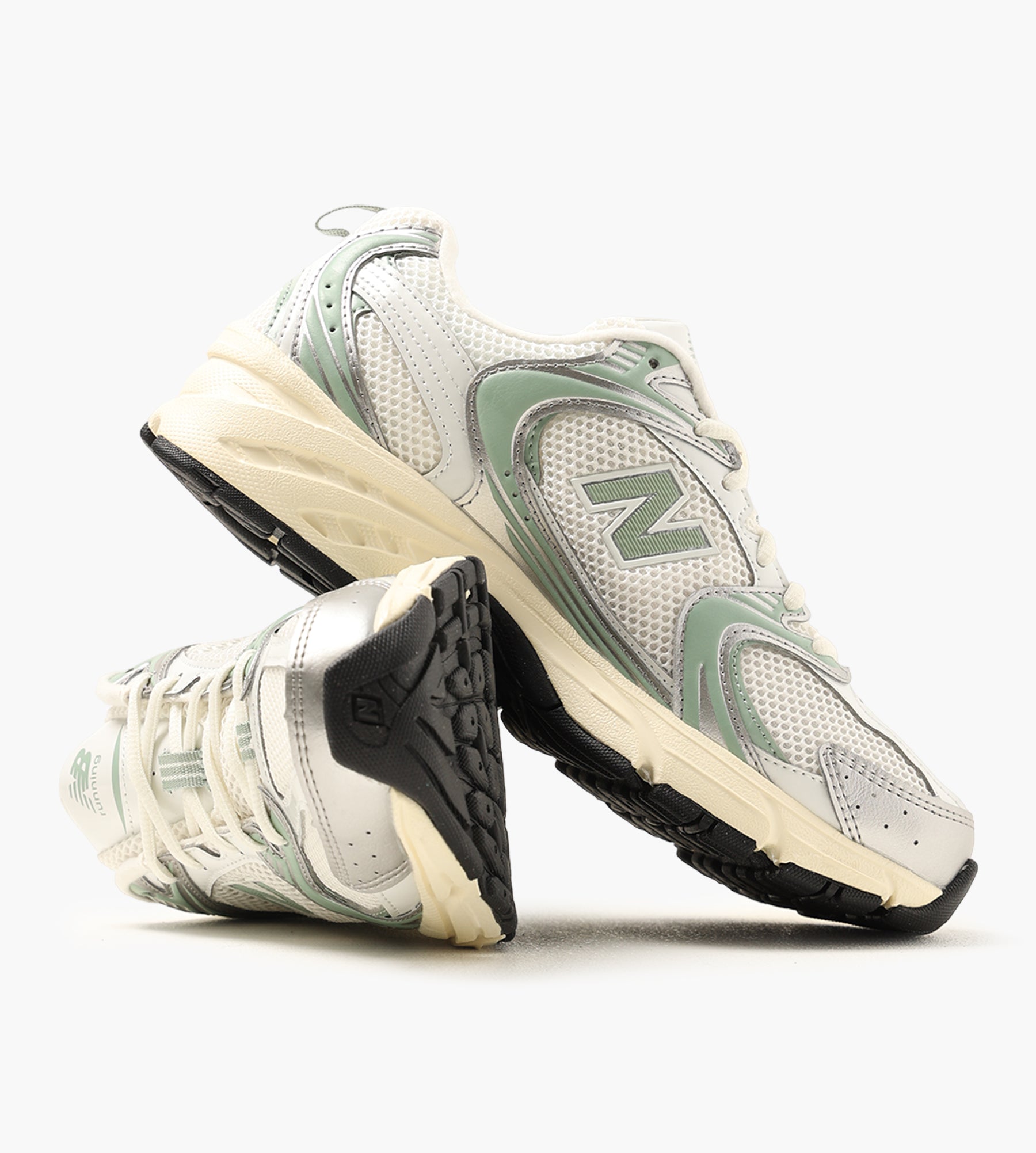 The New Balance 530 in Silver Metallic with Mosaic Green merges retro design with modern functionality, featuring a leather and synthetic upper that balances durability with lightweight comfort. The metallic finish is accented by subtle green tones, creating a refined aesthetic grounded in the brand's heritage running silhouettes.